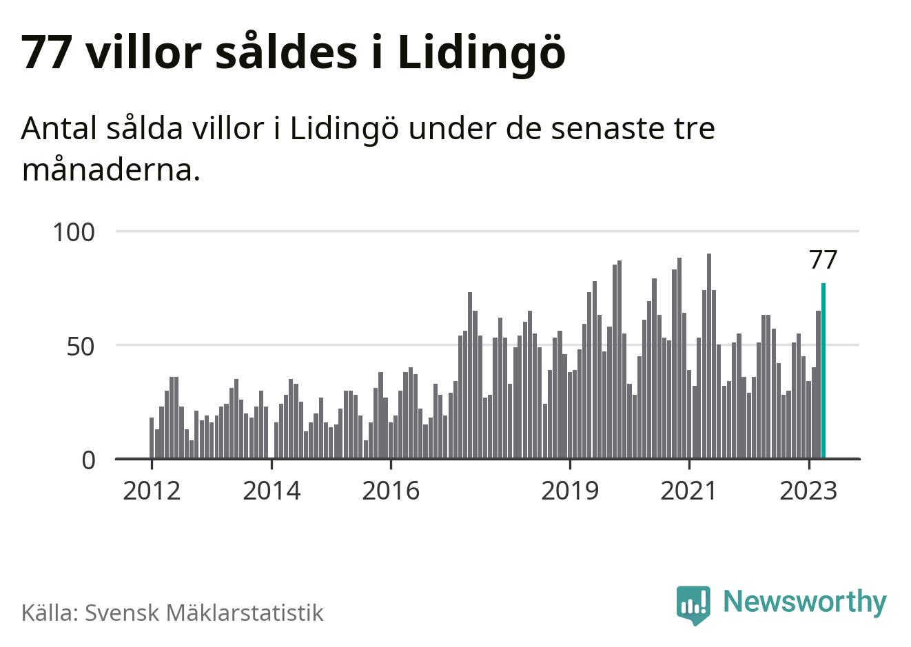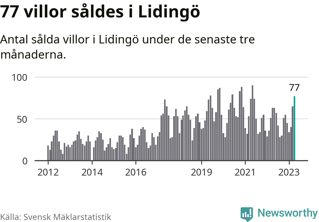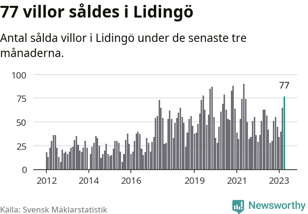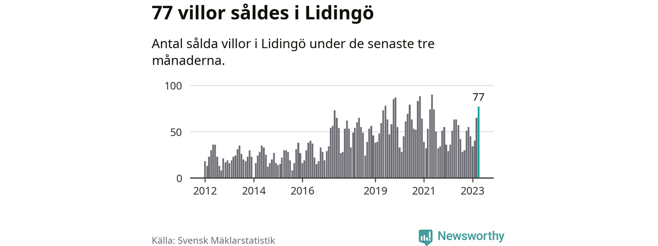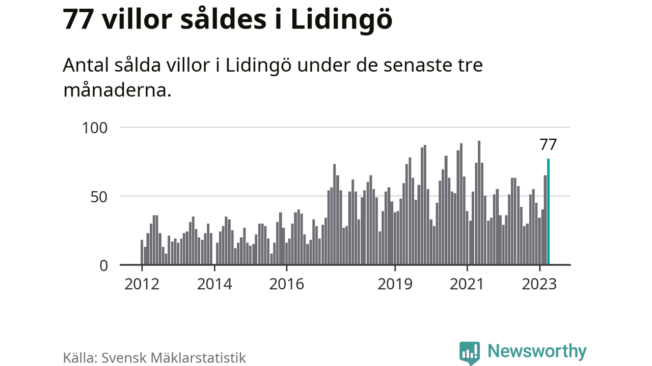Sammanlagt såldes 77 villor i Lidingö kommun mellan februari och april till ett genomsnittligt pris på 13,5 miljoner kronor. I fjol gjordes 63 affärer vid den här tiden på året.