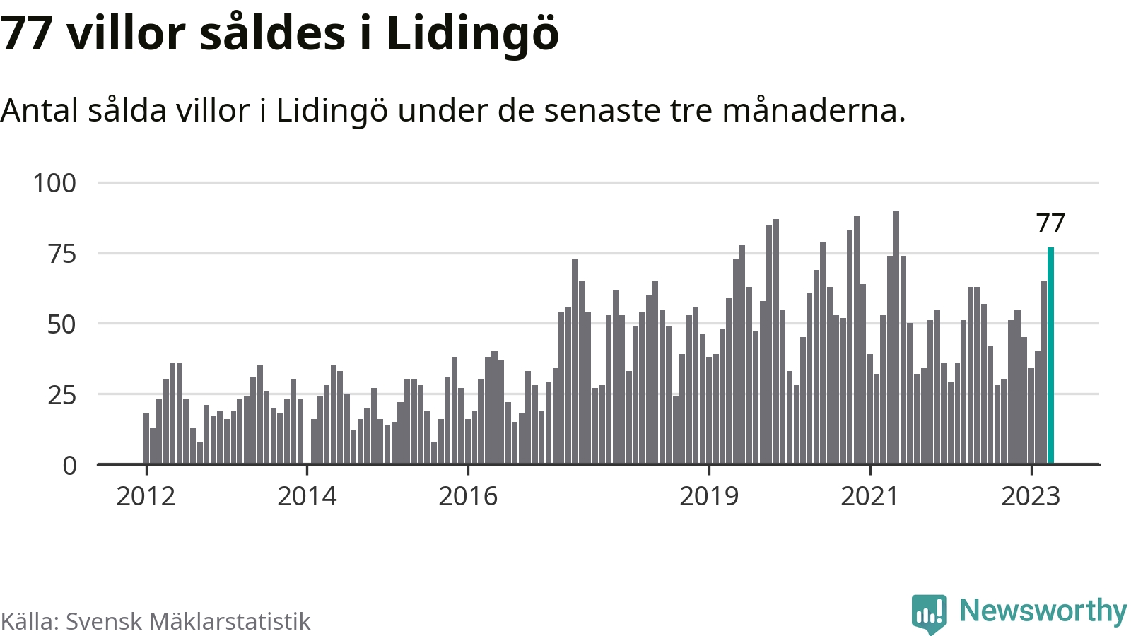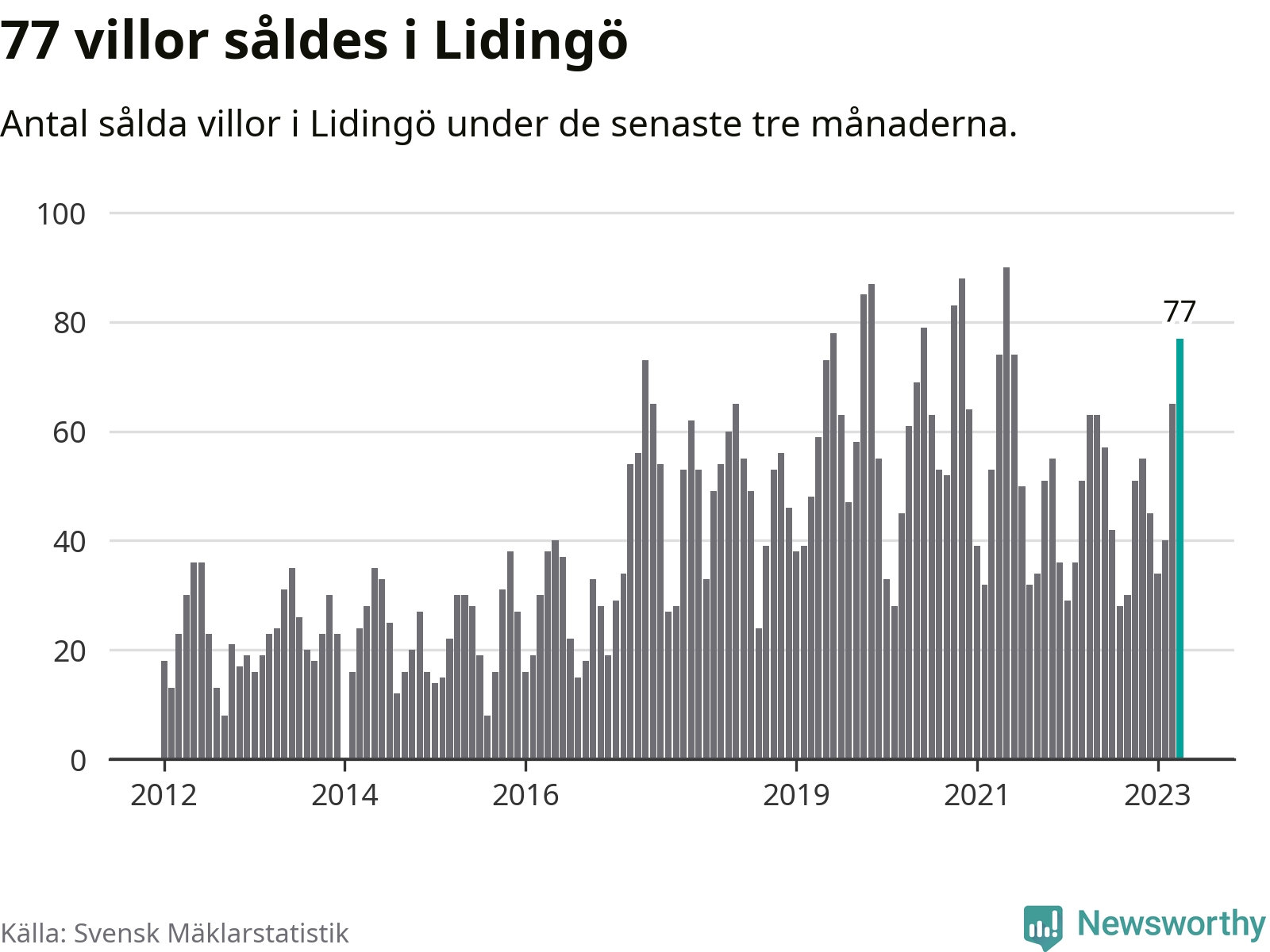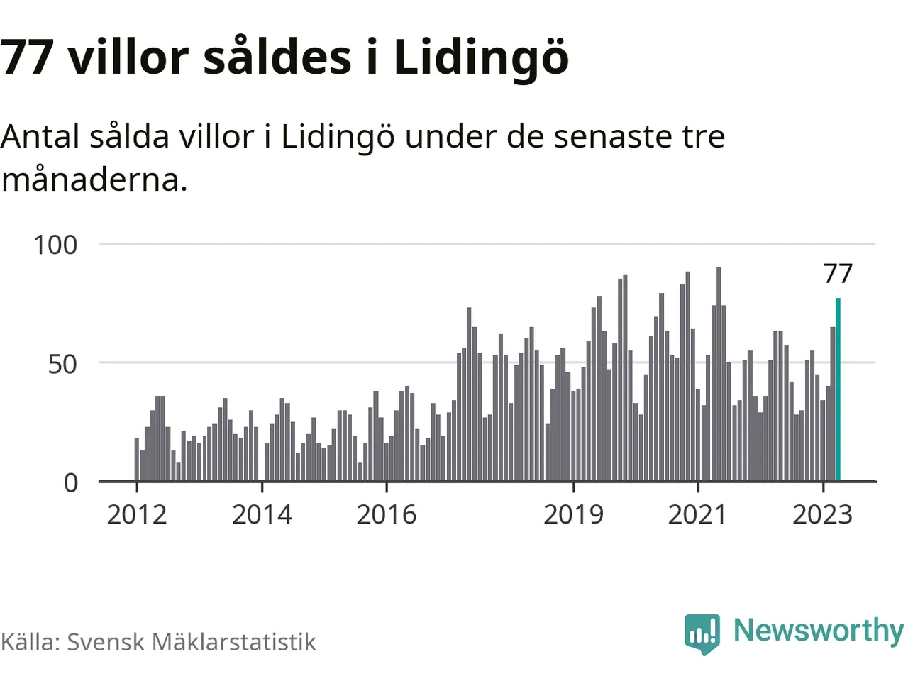 Sammanlagt såldes 77 villor i Lidingö kommun mellan februari och april till ett genomsnittligt pris på 13,5 miljoner kronor. I fjol gjordes 63 affärer vid den här tiden på året.