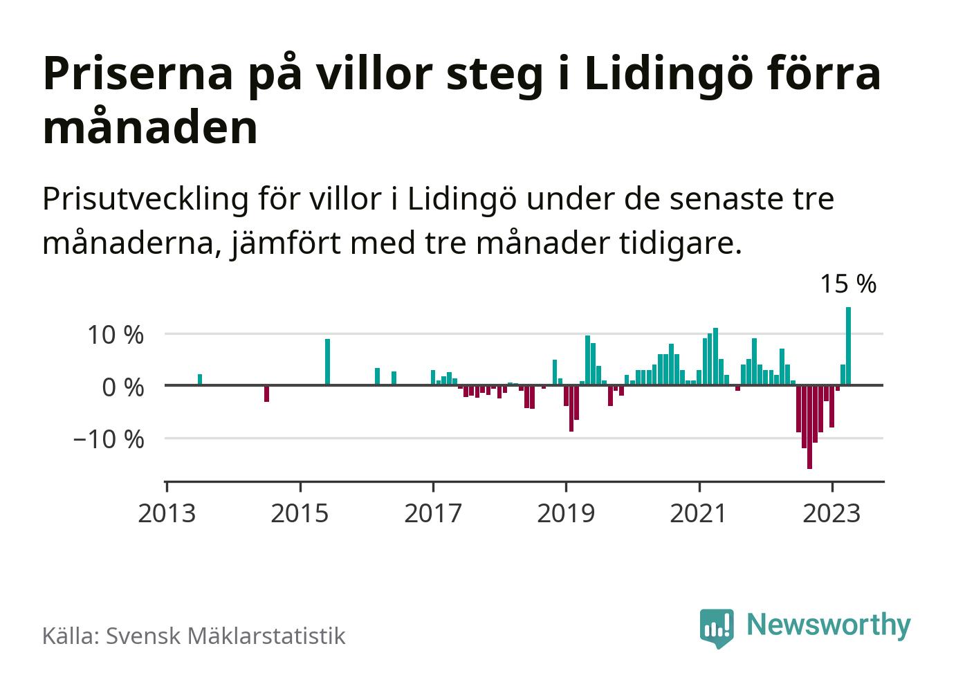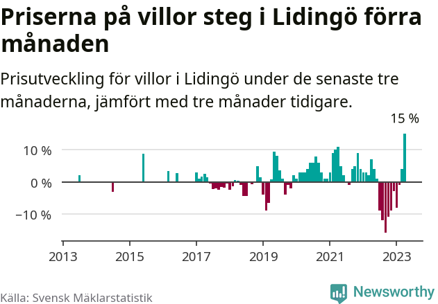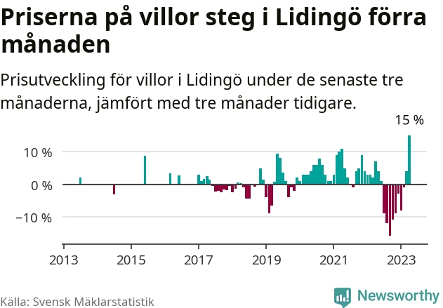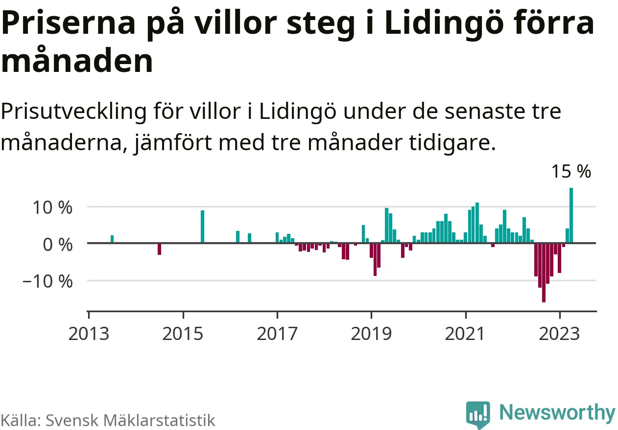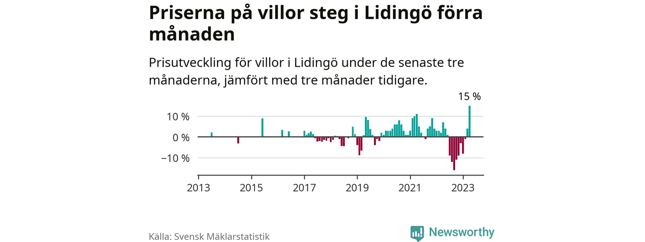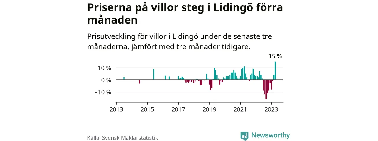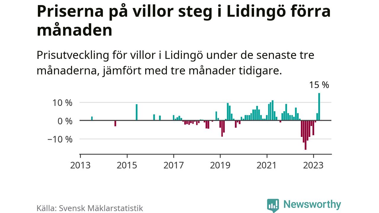 Villapriserna steg med 15 procent i Lidingö kommun under de senaste tre månaderna. Det är den starkaste prisutvecklingen sedan 2013.