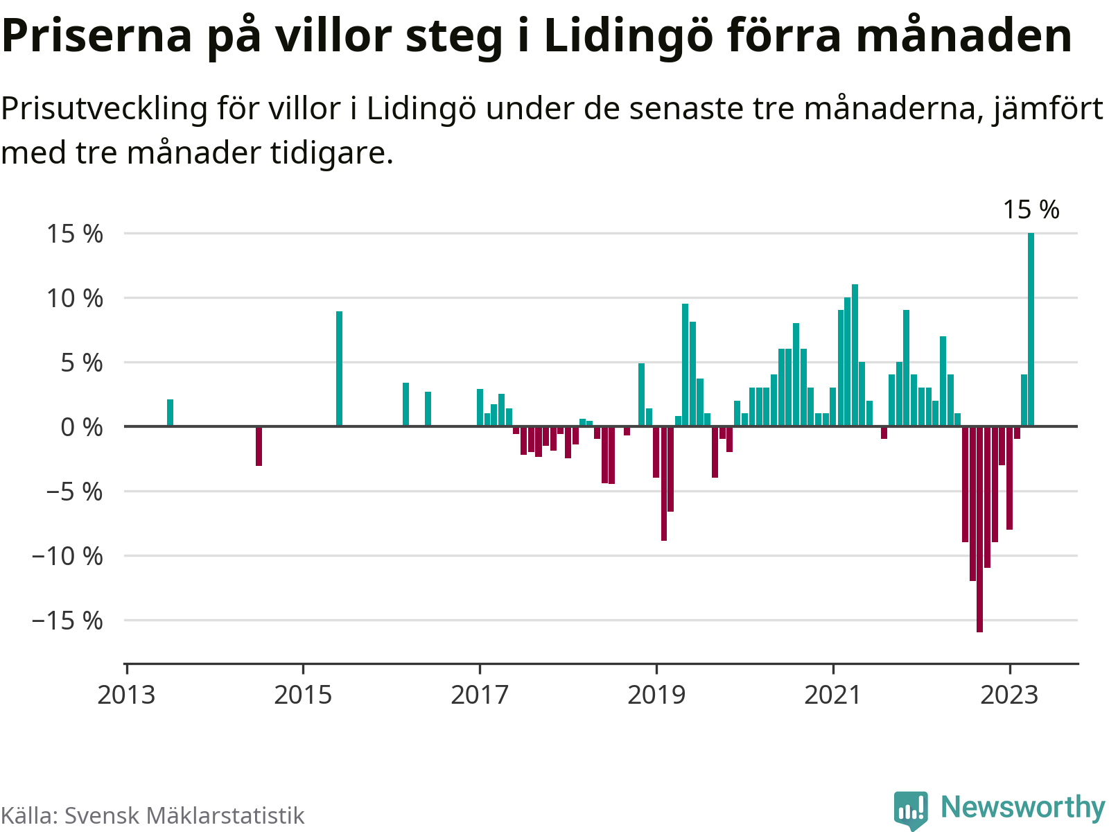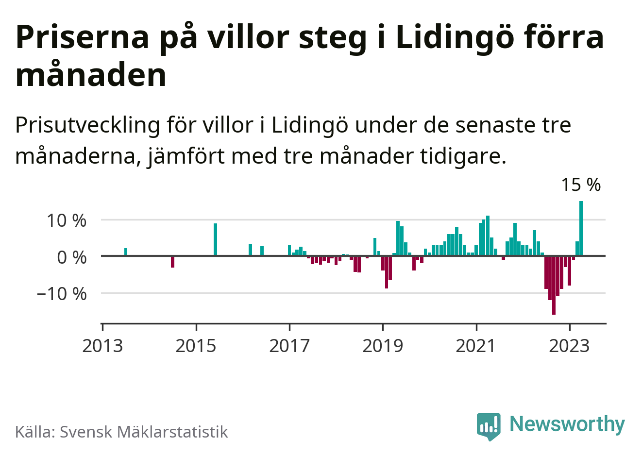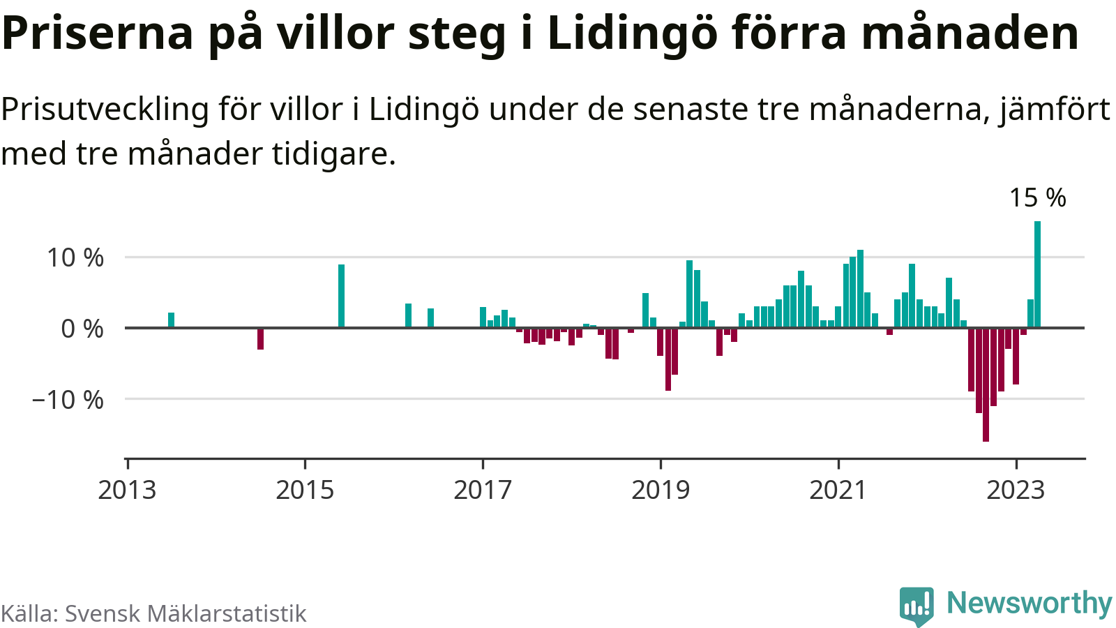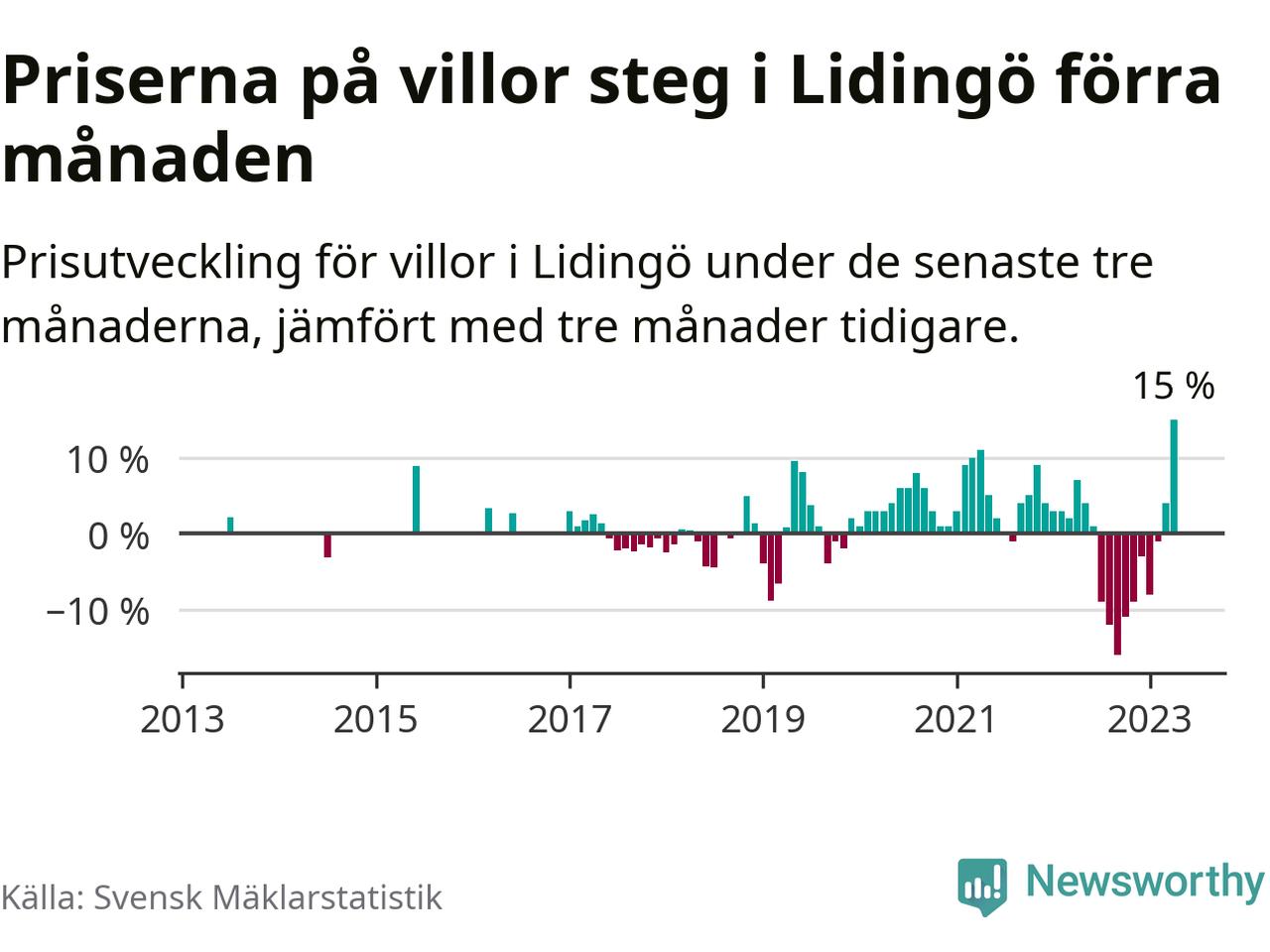 Villapriserna steg med 15 procent i Lidingö kommun under de senaste tre månaderna. Det är den starkaste prisutvecklingen sedan 2013.