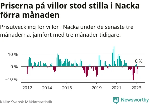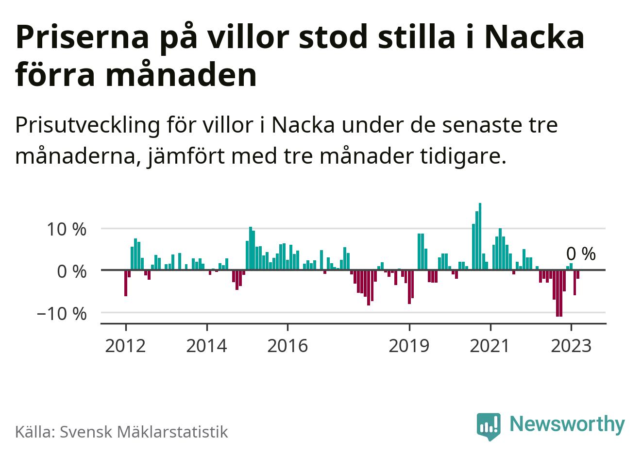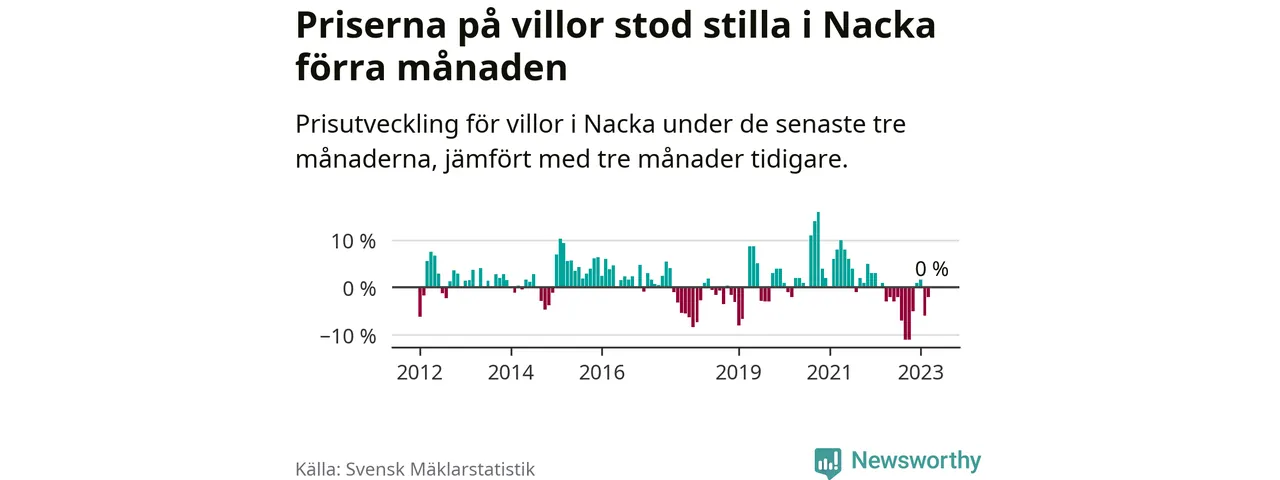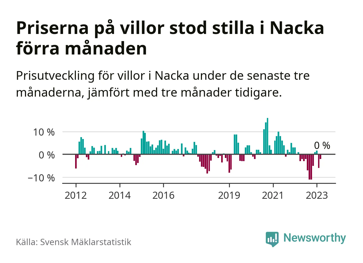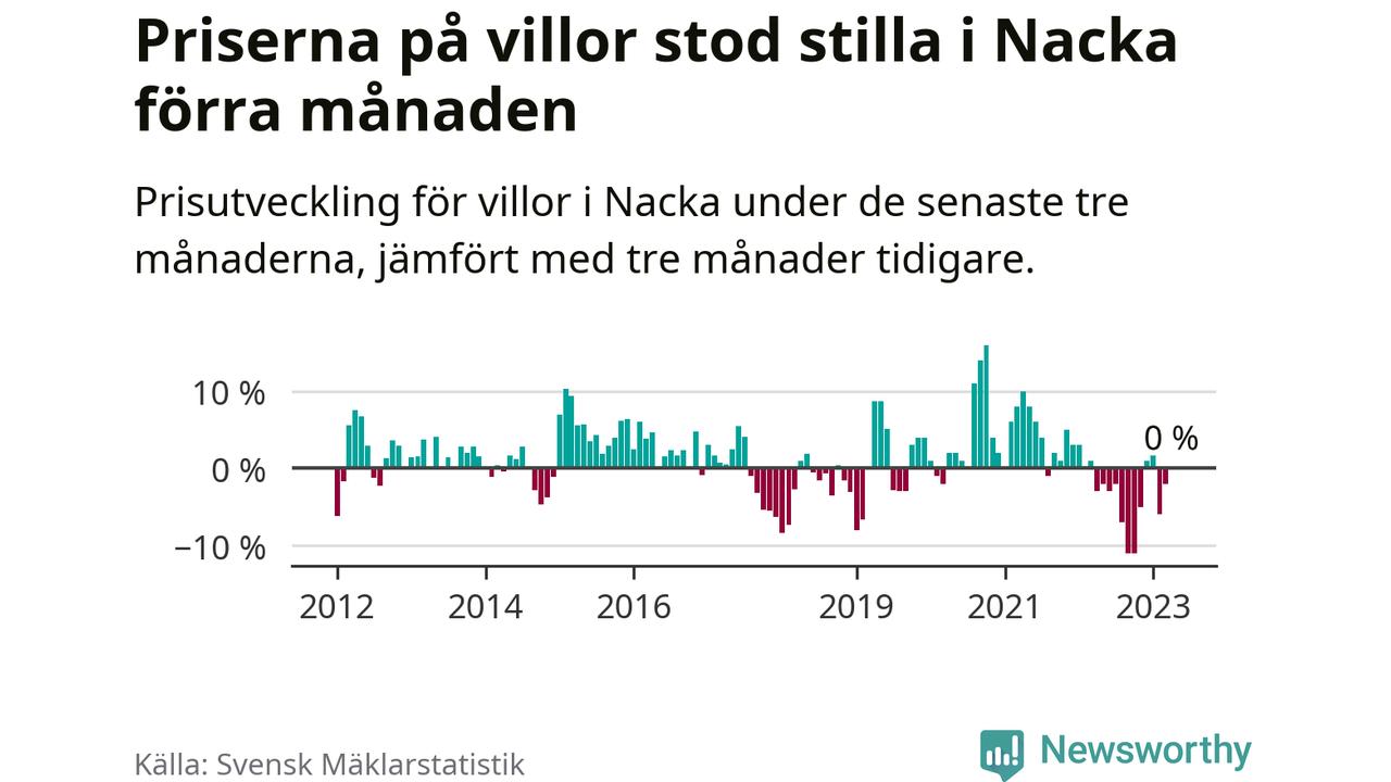 Villapriserna står i stort sett stilla i Nacka kommun. Medelpriset på de på försäljningarna under de senaste tre månaderna låg på samma nivå som för tre månader sedan.