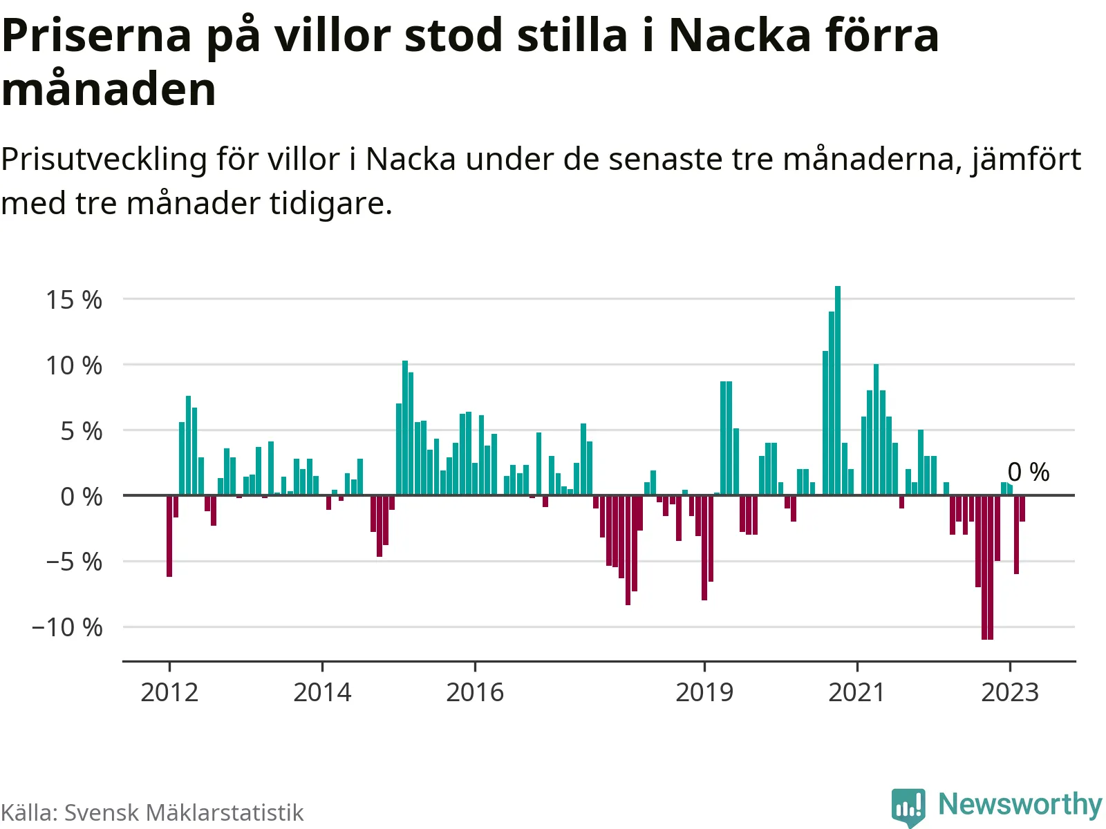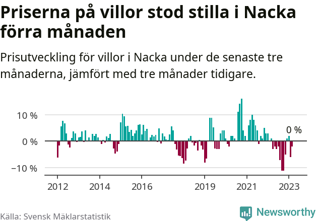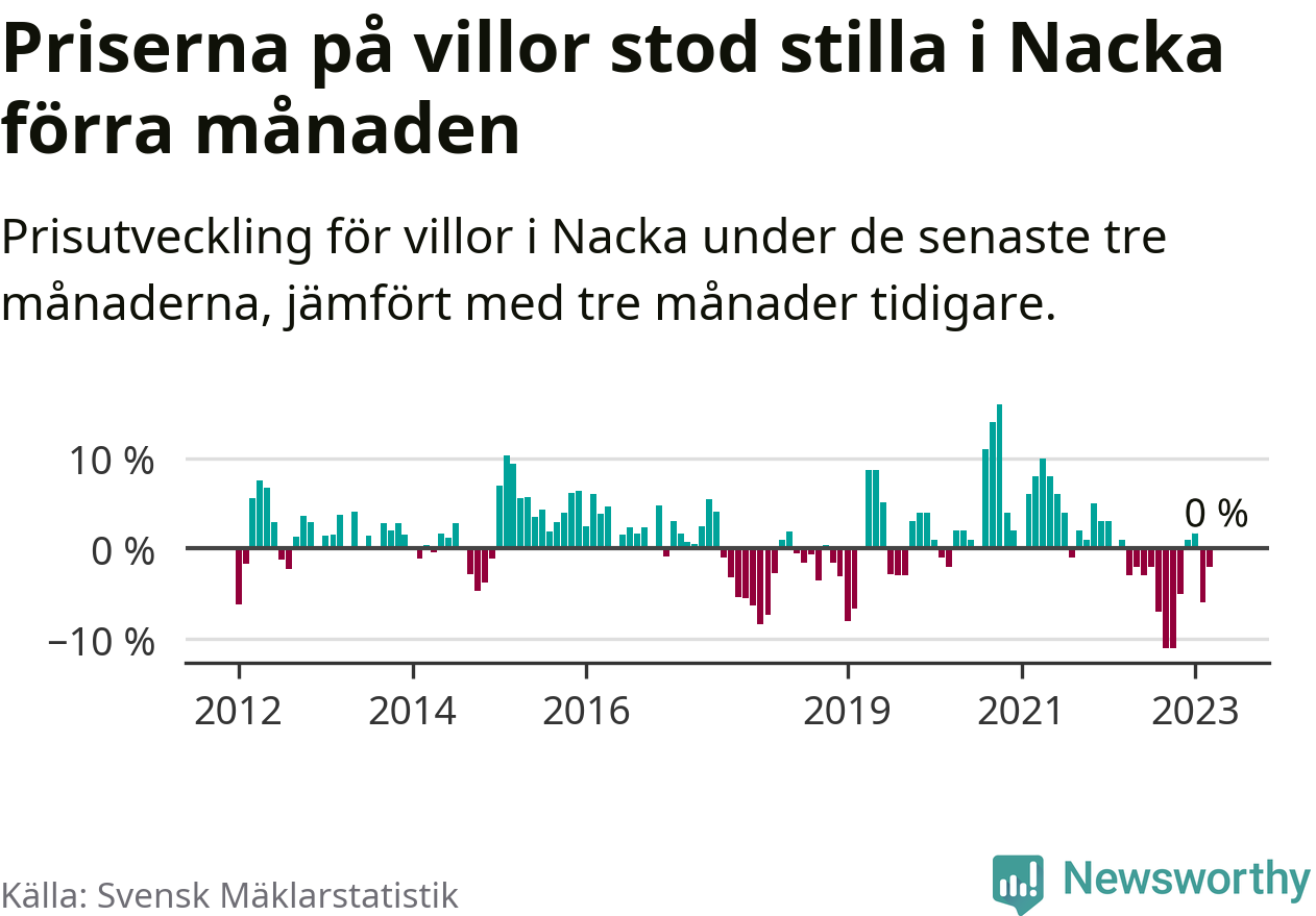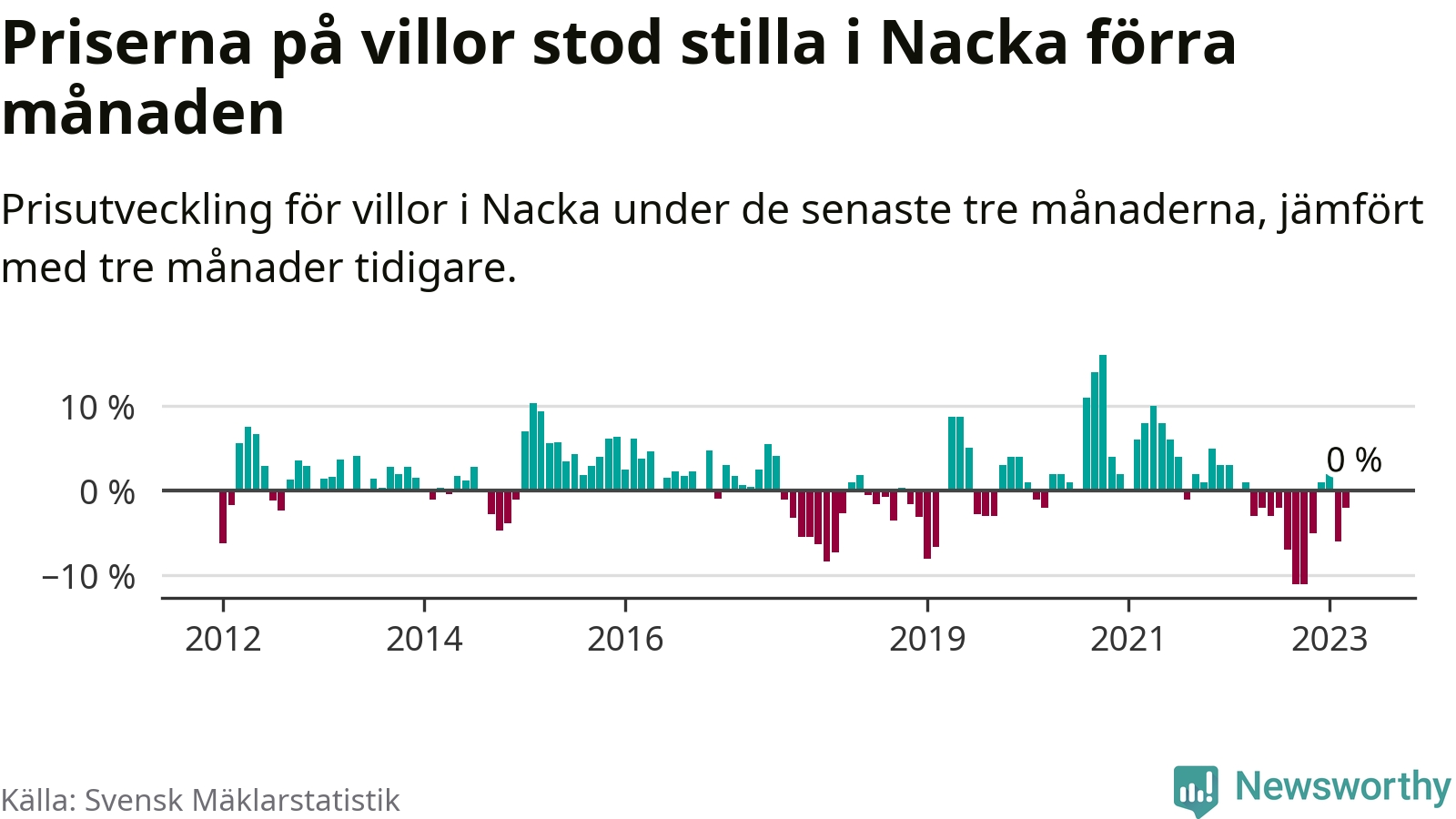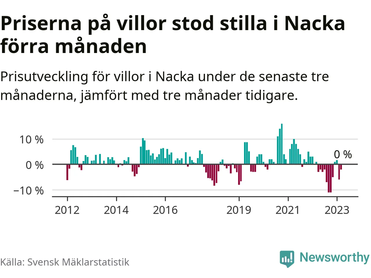 Villapriserna står i stort sett stilla i Nacka kommun. Medelpriset på de på försäljningarna under de senaste tre månaderna låg på samma nivå som för tre månader sedan.