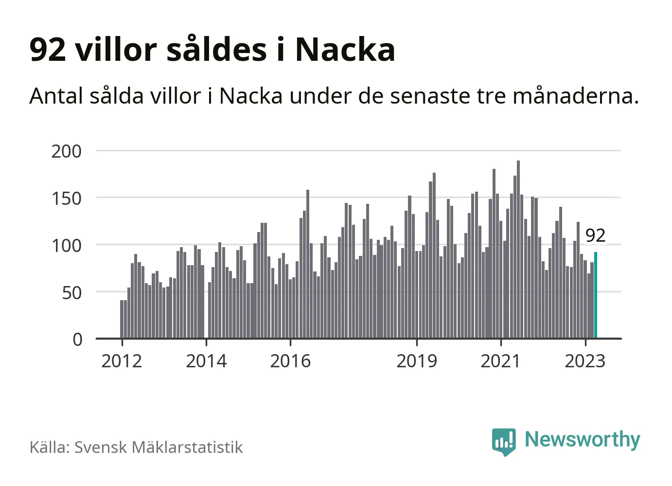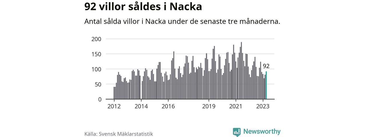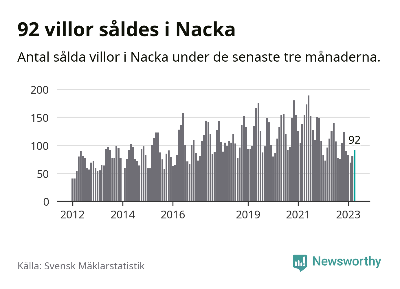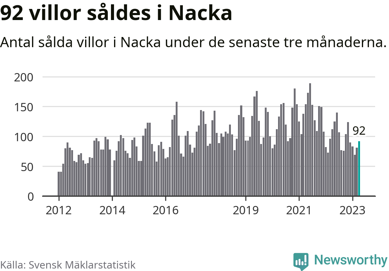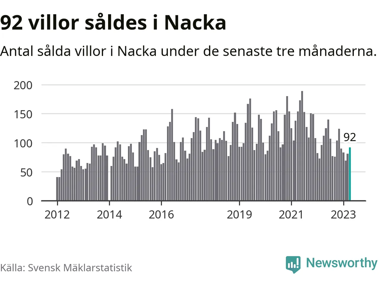 Sammanlagt såldes 92 villor i Nacka kommun mellan februari och april till ett genomsnittligt pris på 9,0 miljoner kronor. I fjol gjordes 112 affärer vid den här tiden på året.