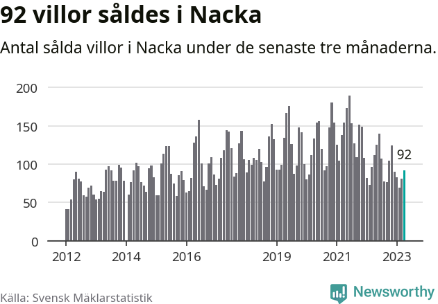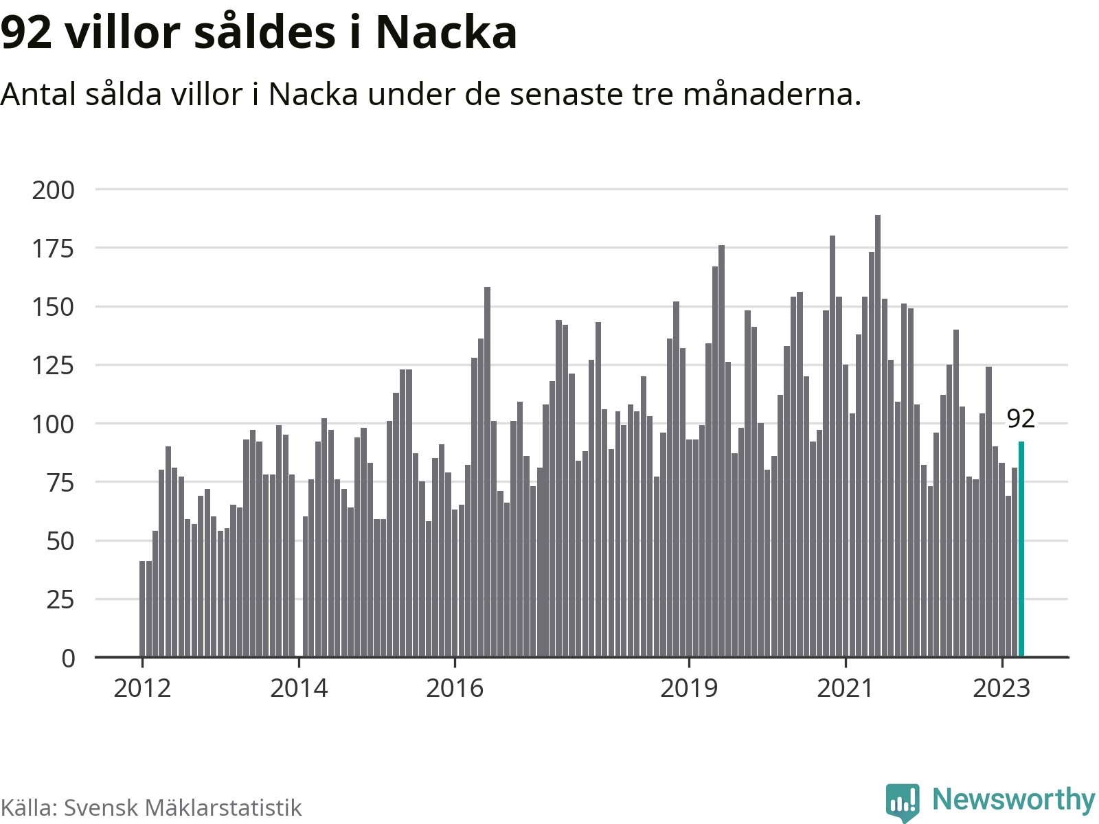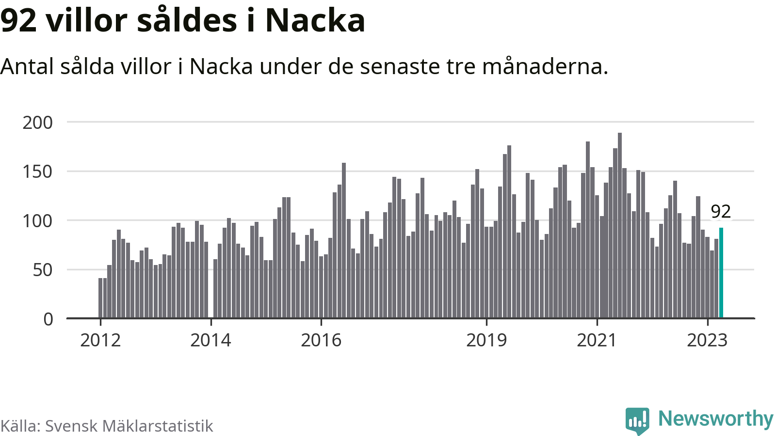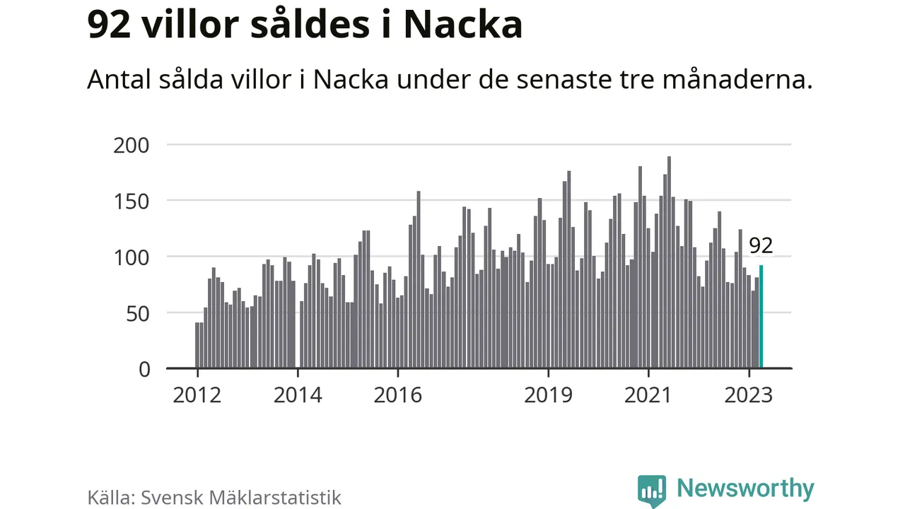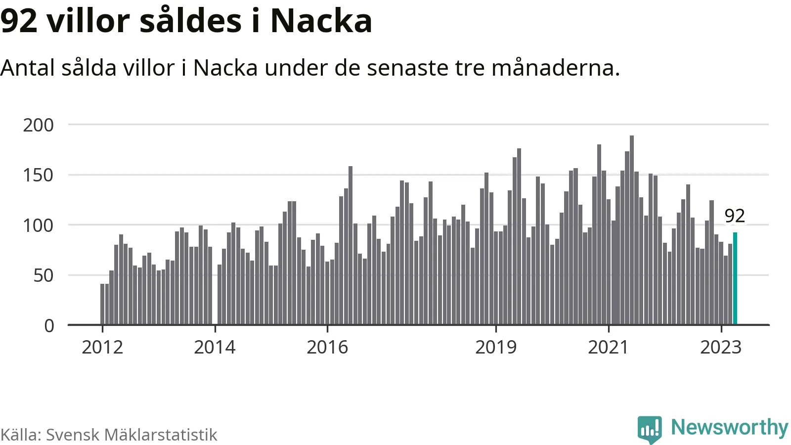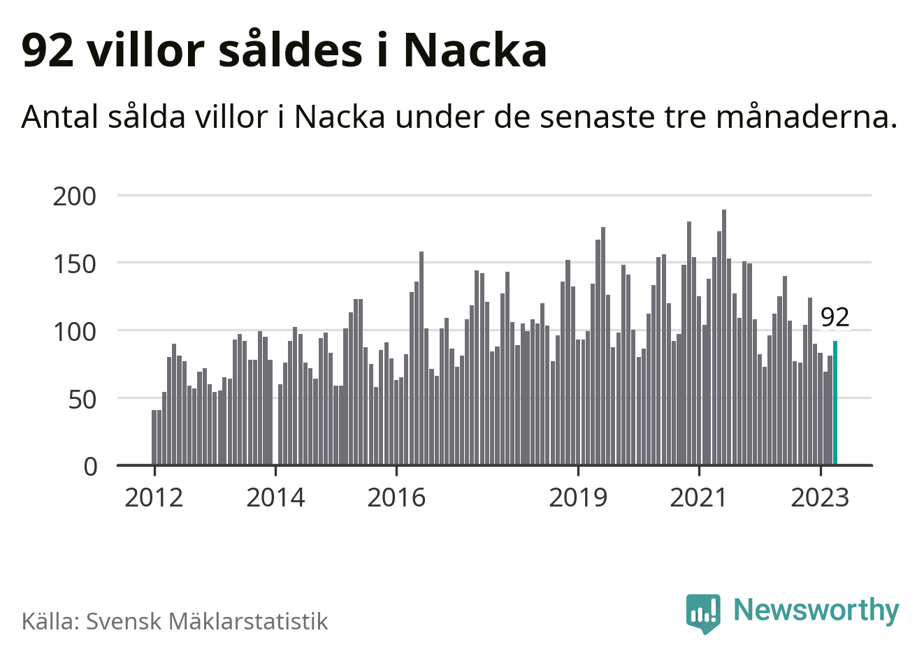 Sammanlagt såldes 92 villor i Nacka kommun mellan februari och april till ett genomsnittligt pris på 9,0 miljoner kronor. I fjol gjordes 112 affärer vid den här tiden på året.