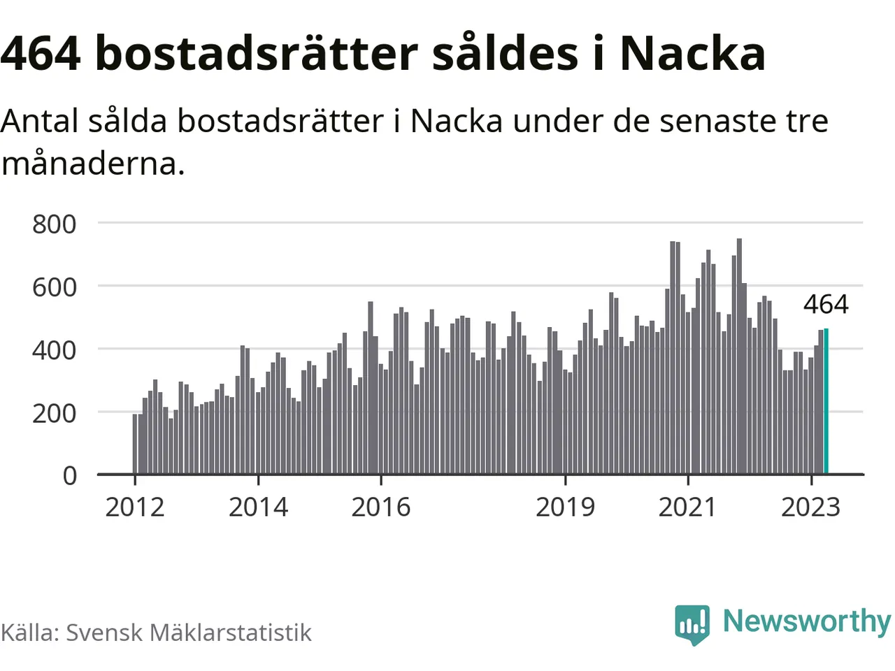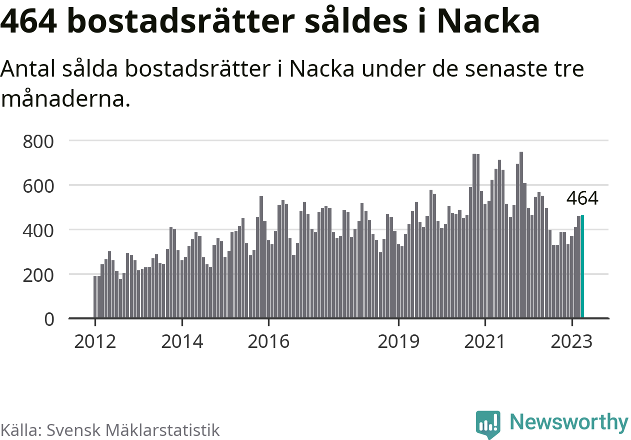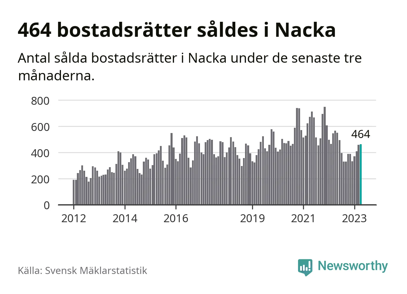 Sammanlagt såldes 464 bostadsrätter i Nacka kommun mellan februari och april till ett genomsnittligt pris på 3,9 miljoner kronor. I fjol gjordes 567 affärer vid den här tiden på året.