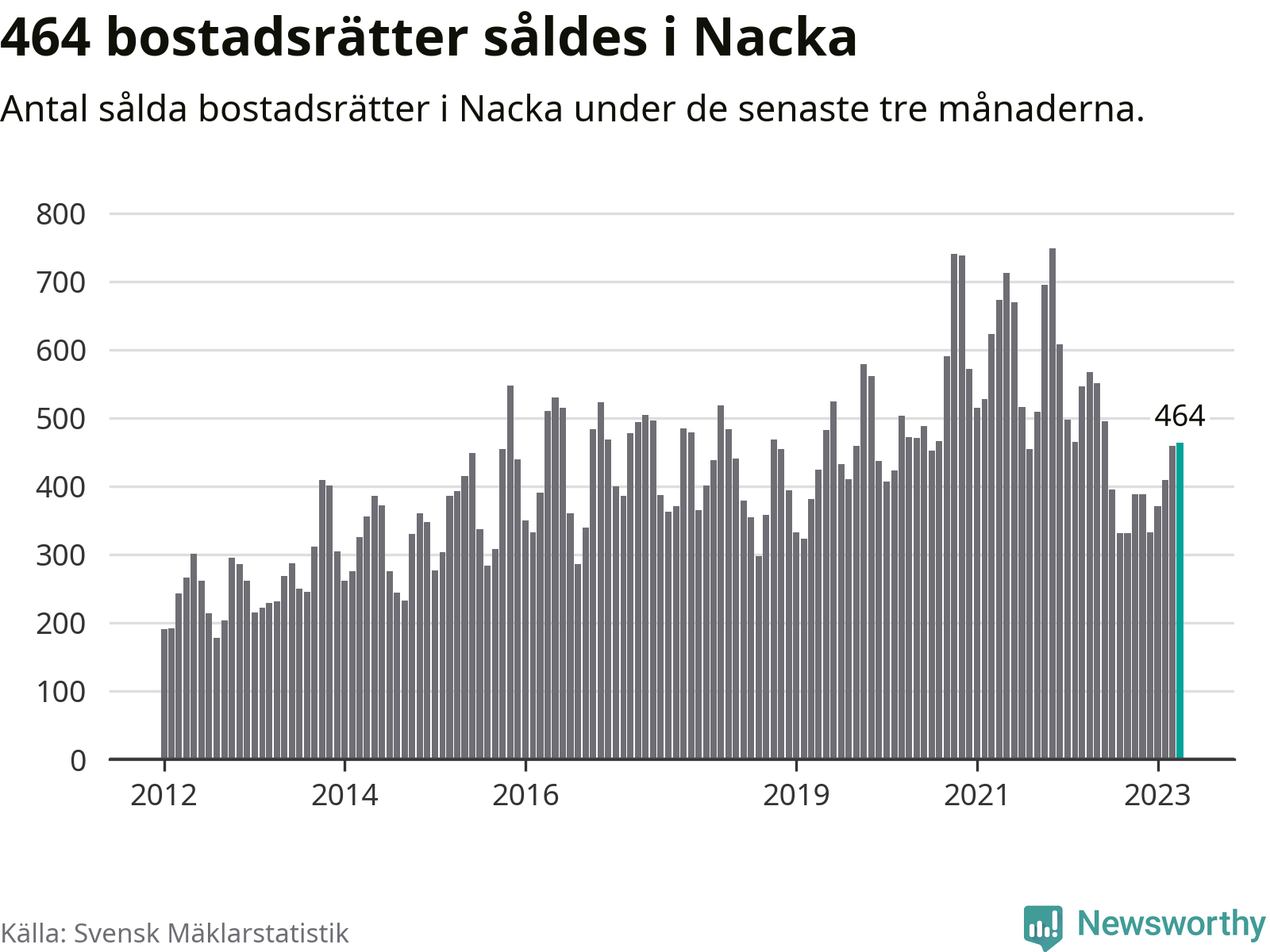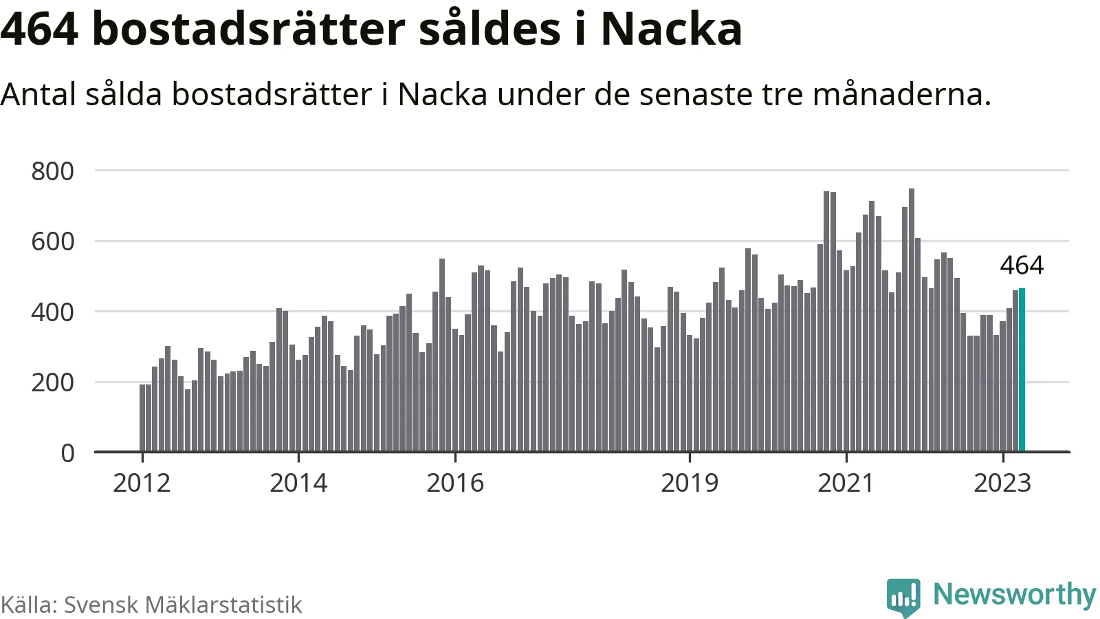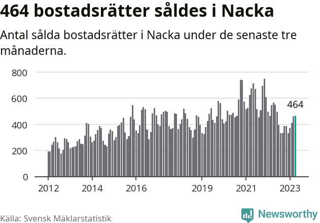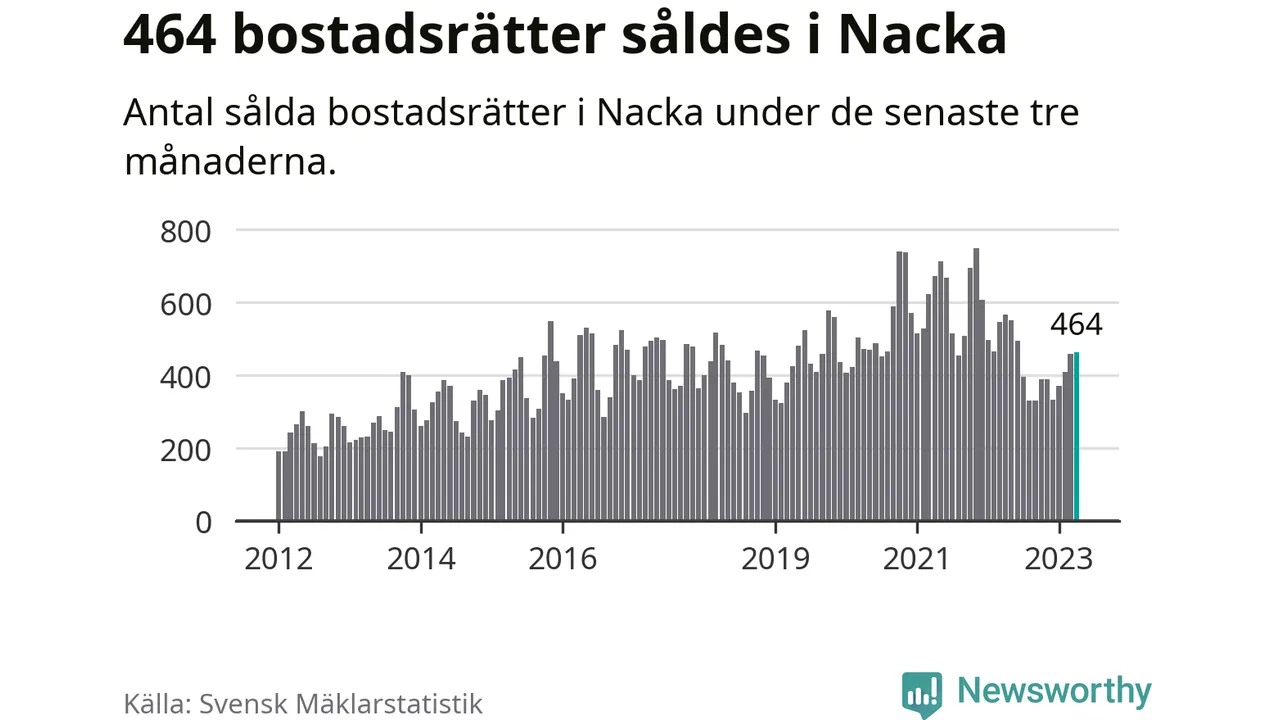 Sammanlagt såldes 464 bostadsrätter i Nacka kommun mellan februari och april till ett genomsnittligt pris på 3,9 miljoner kronor. I fjol gjordes 567 affärer vid den här tiden på året.