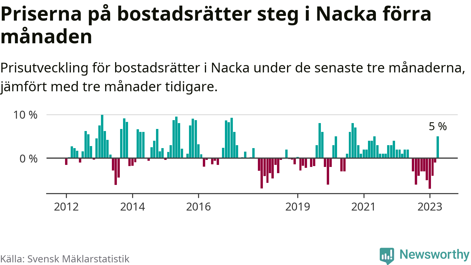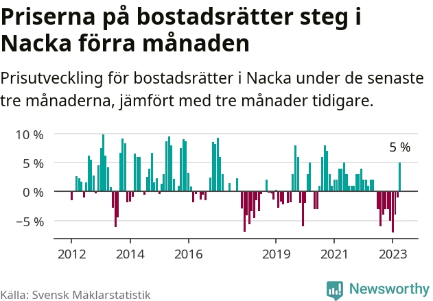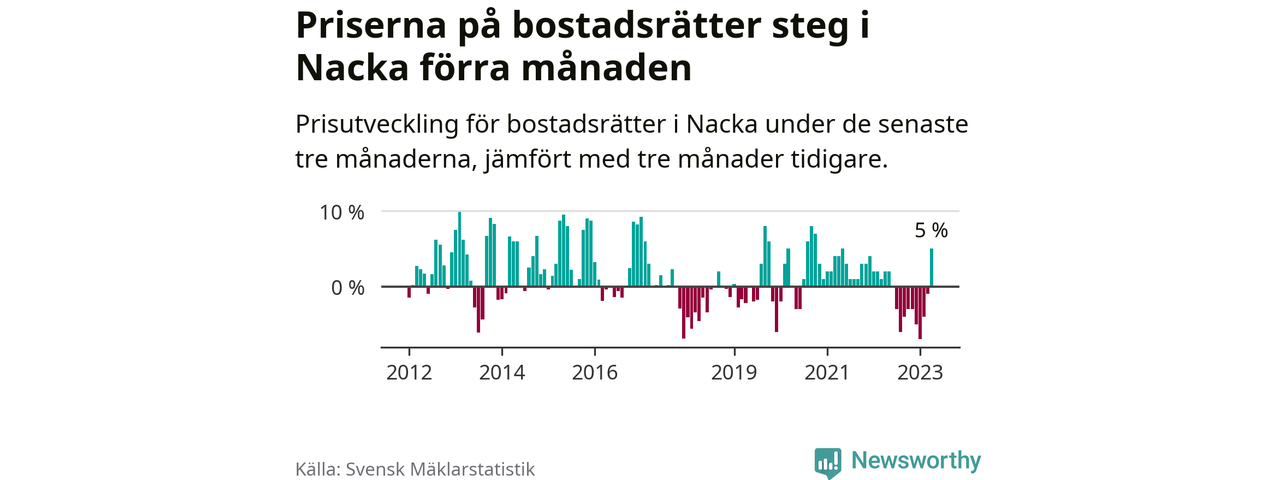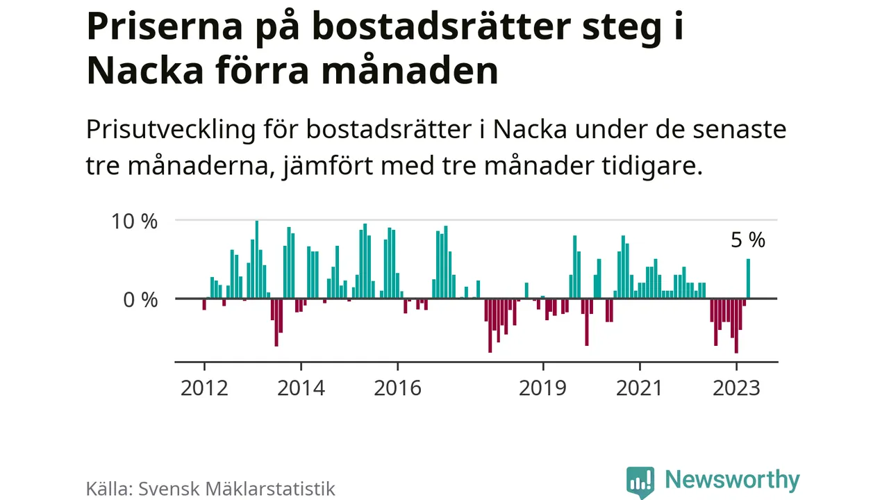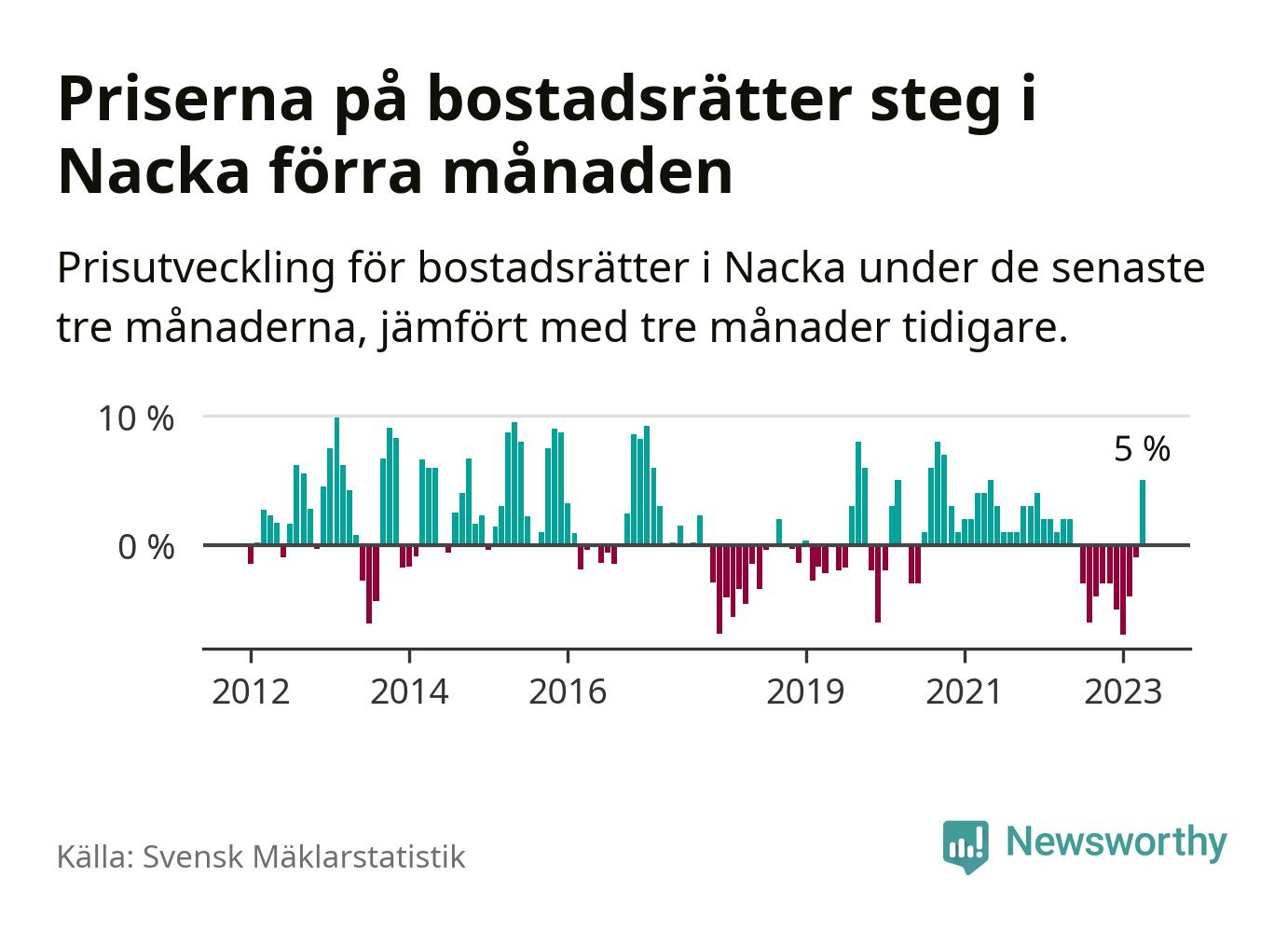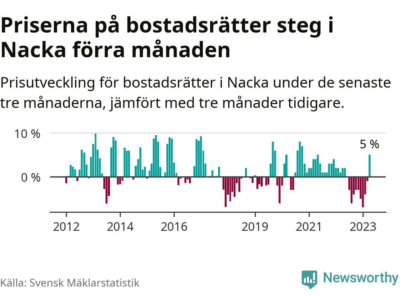 Sedan juni 2022 har priserna på bostadsrätter sjunkit i Nacka kommun, men försäljningarna under de senaste tre månaderna visar på en uppgång med 5 procent.