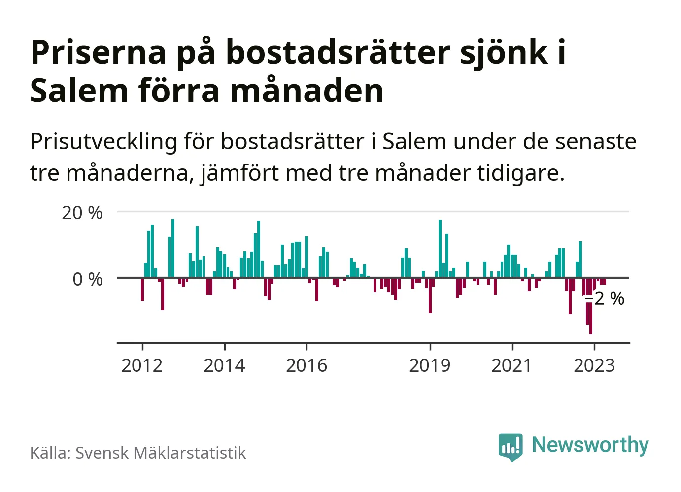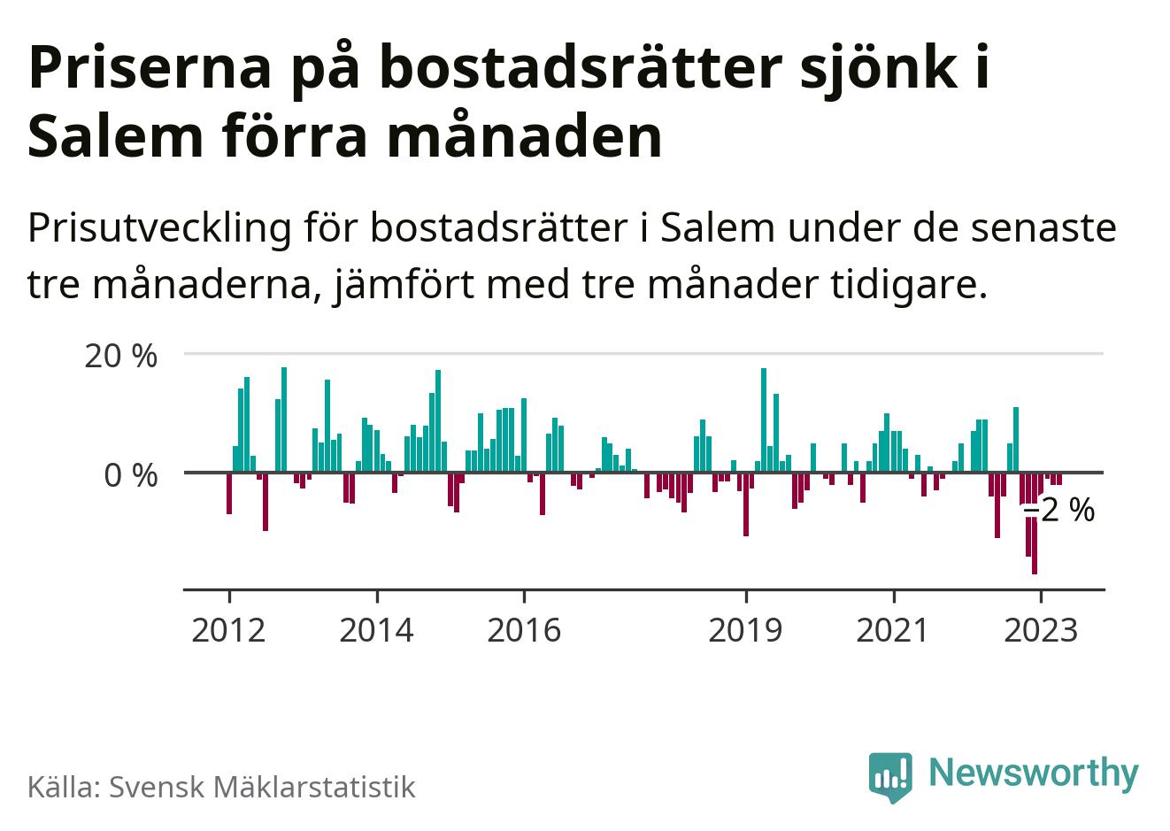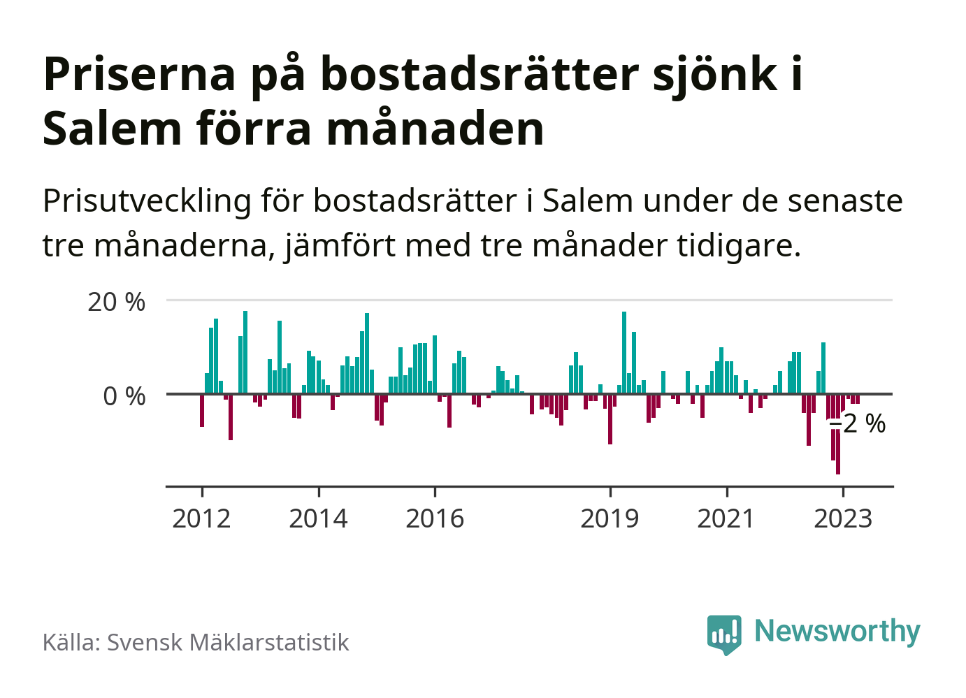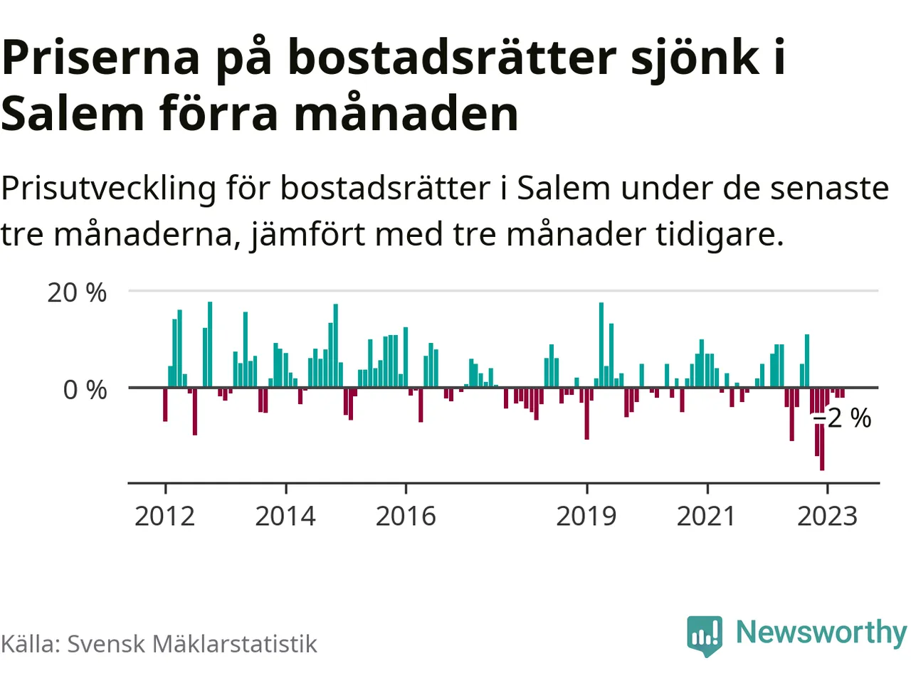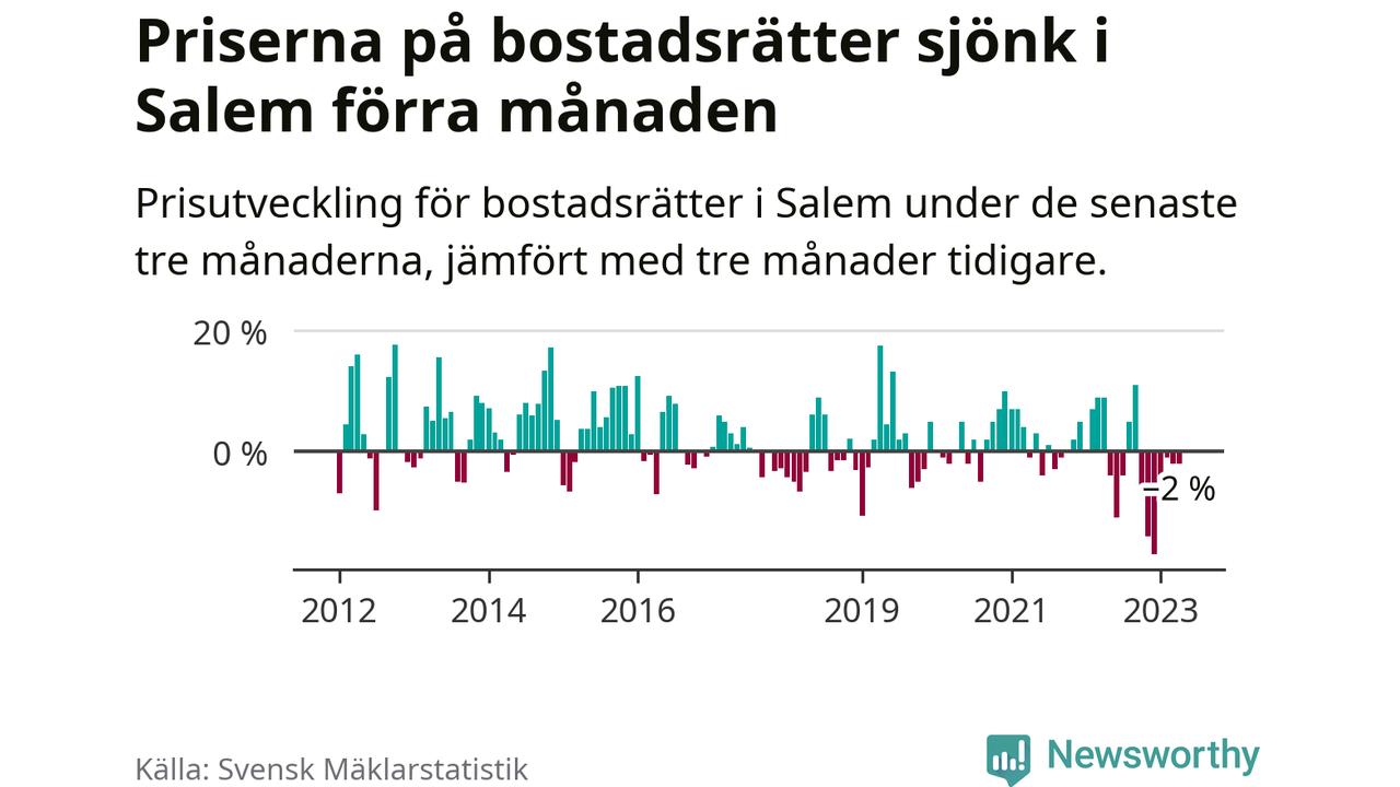 Priserna på bostadsrätter har gått ner i Salems kommun. Medelpriset på försäljningarna under de senaste tre månaderna visar på en nedgång med 2 procent.
