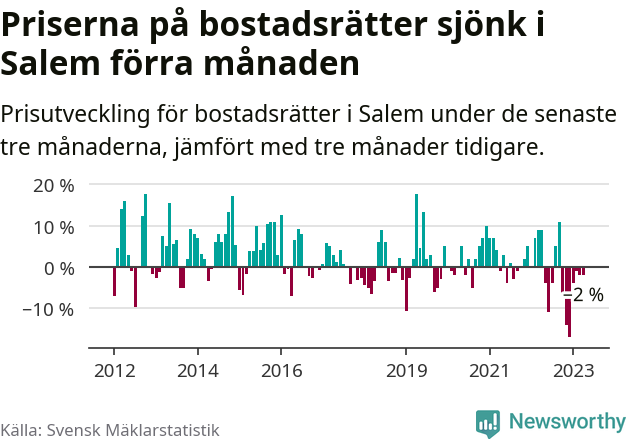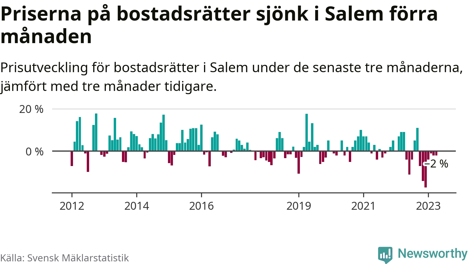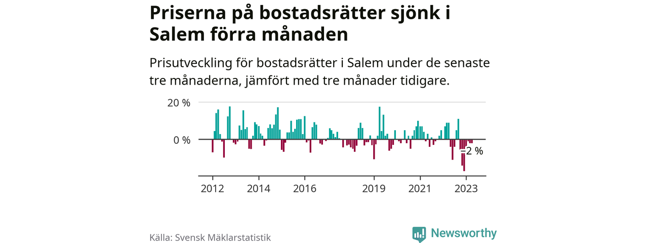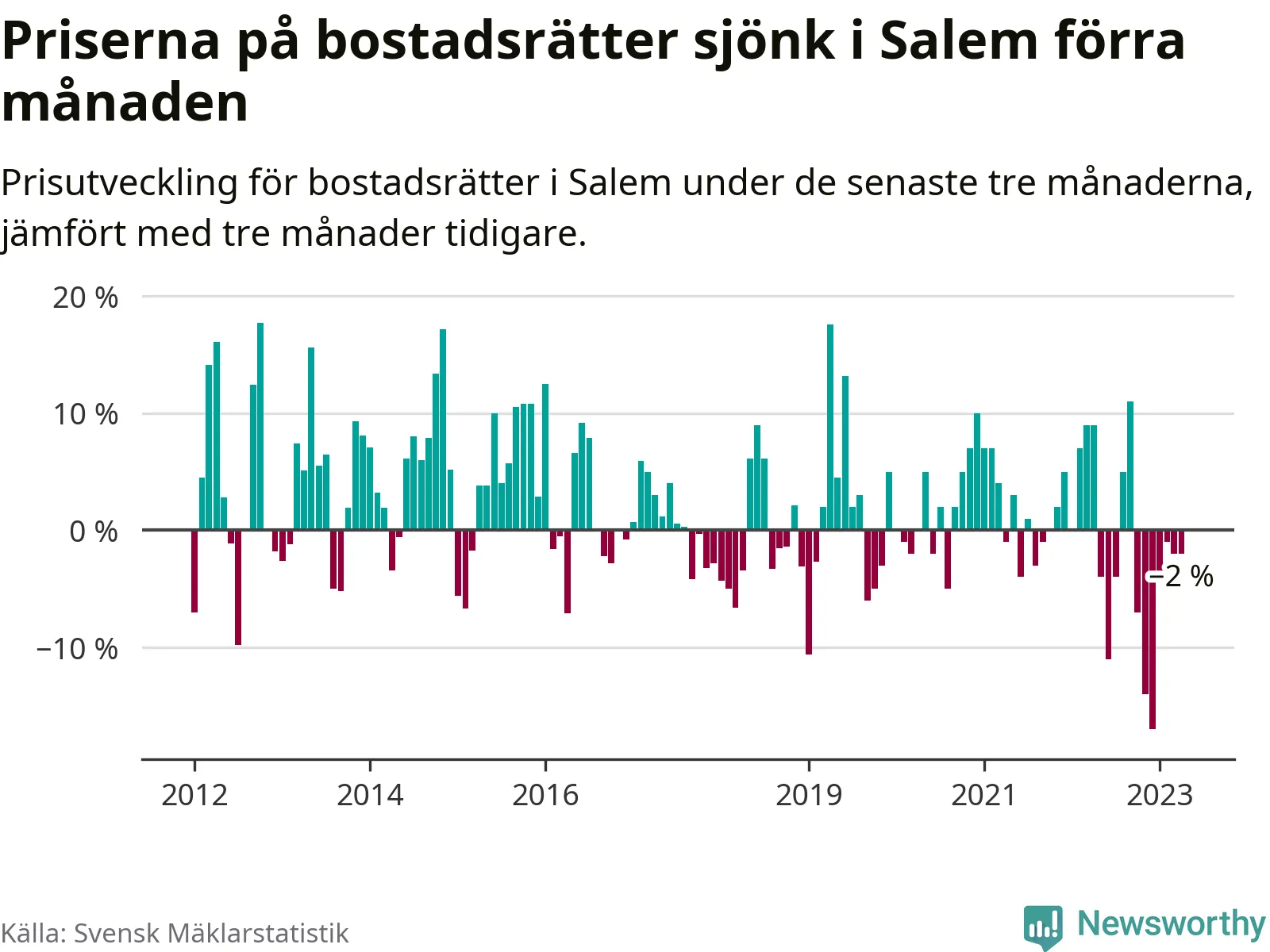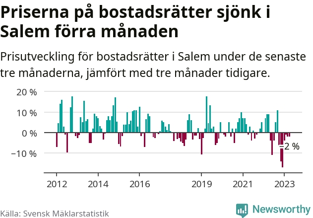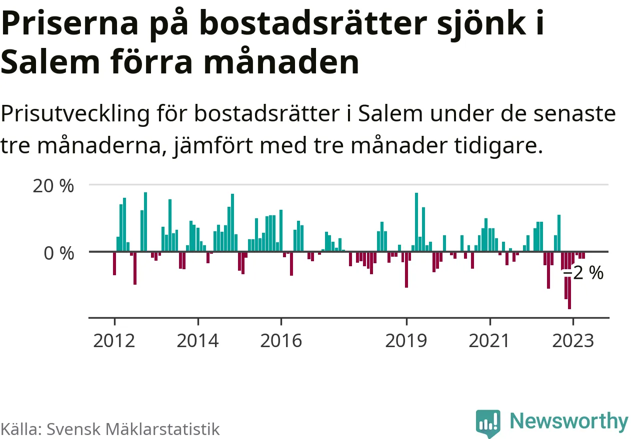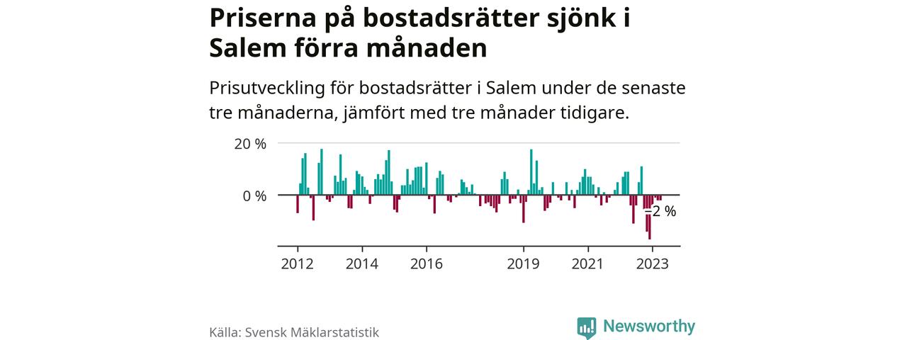 Priserna på bostadsrätter har gått ner i Salems kommun. Medelpriset på försäljningarna under de senaste tre månaderna visar på en nedgång med 2 procent.