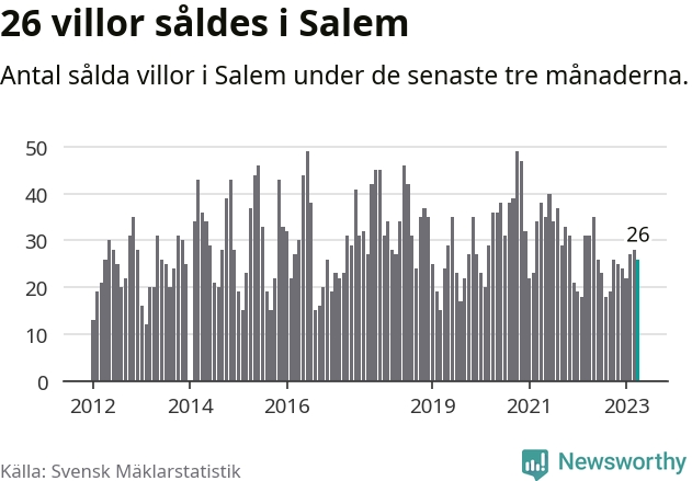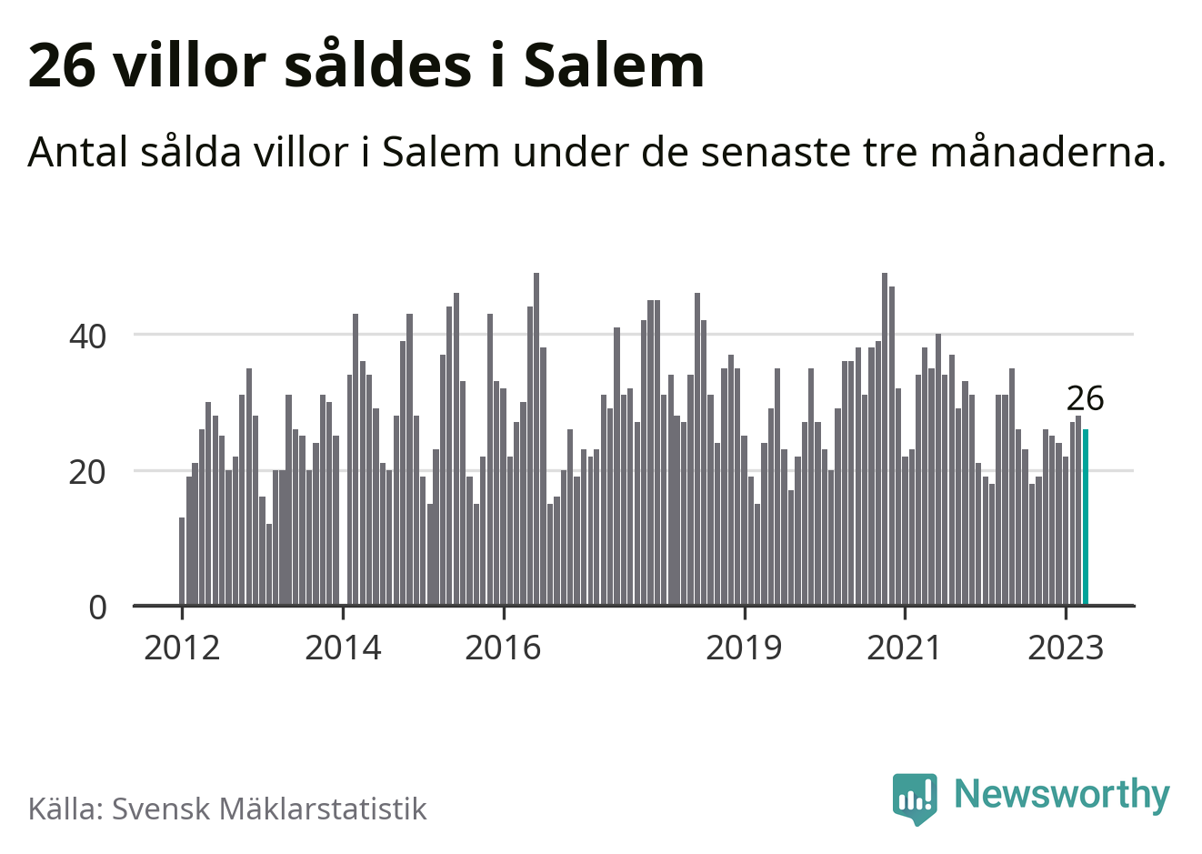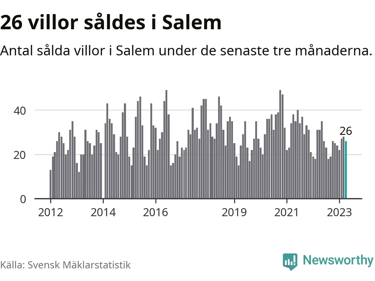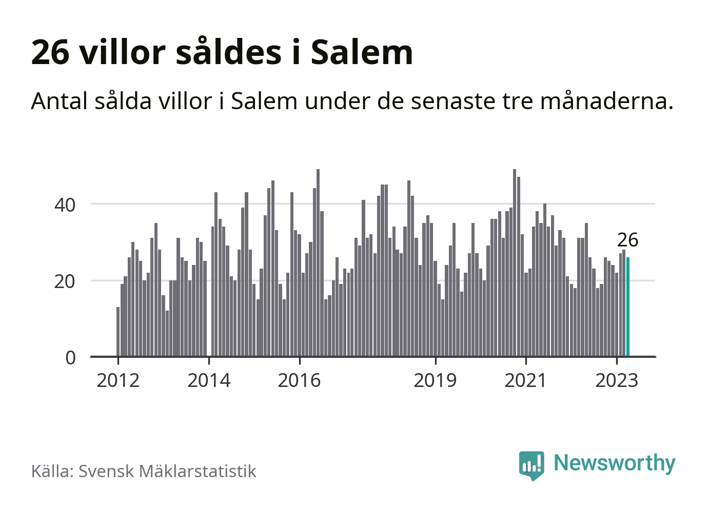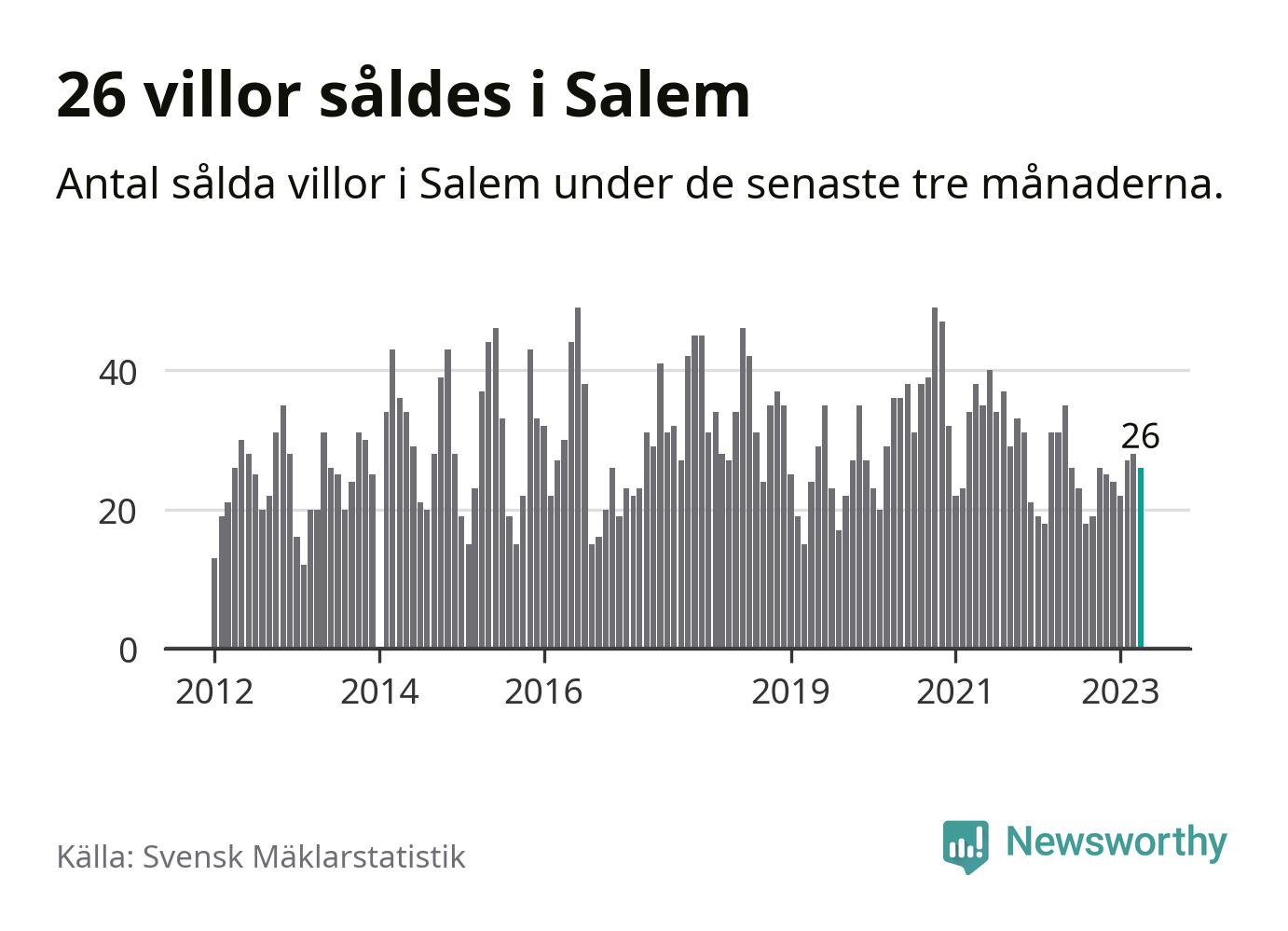 Mellan februari och april gjordes sammanlagt 26 affärer med villor i Salems kommun. Det kan jämföras med 31 vid motsvarande tid i fjol.