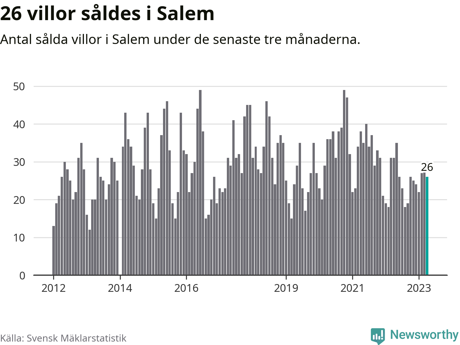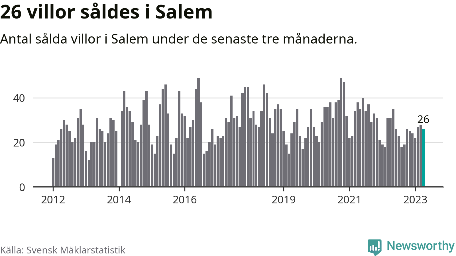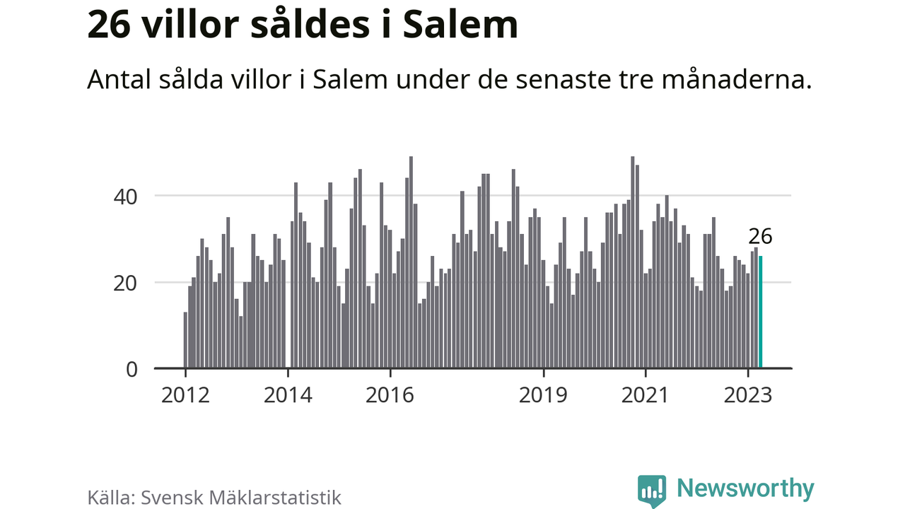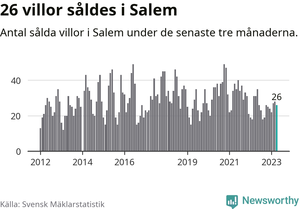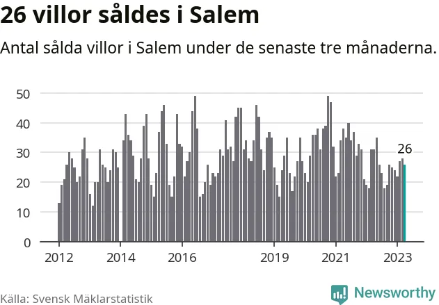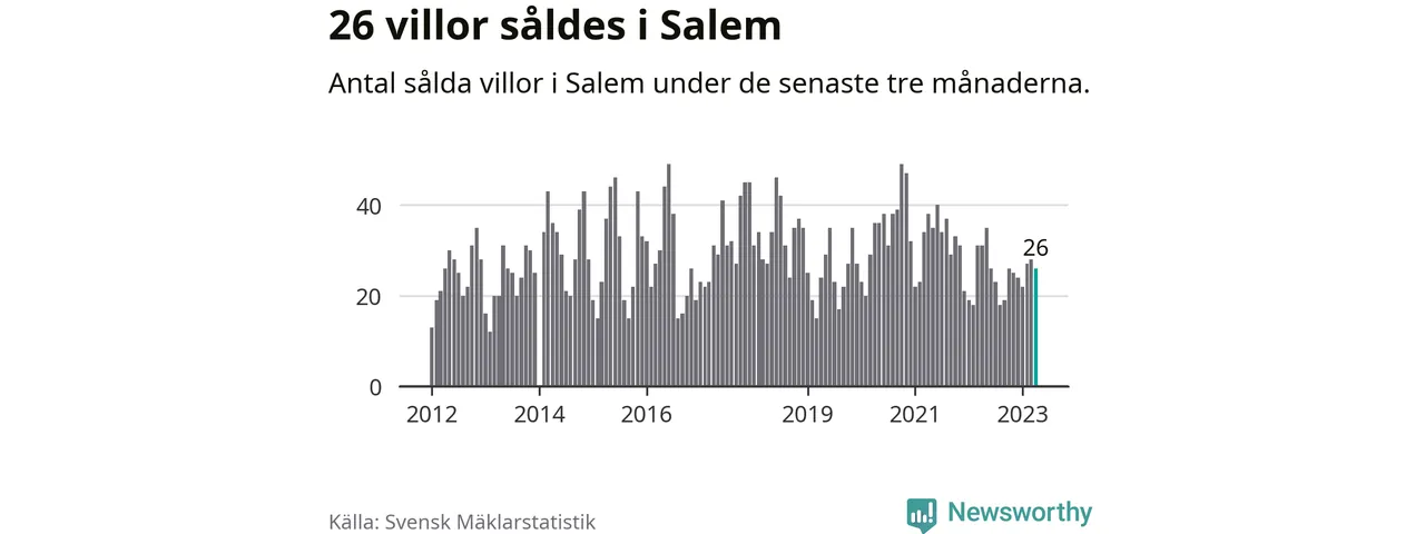 Mellan februari och april gjordes sammanlagt 26 affärer med villor i Salems kommun. Det kan jämföras med 31 vid motsvarande tid i fjol.