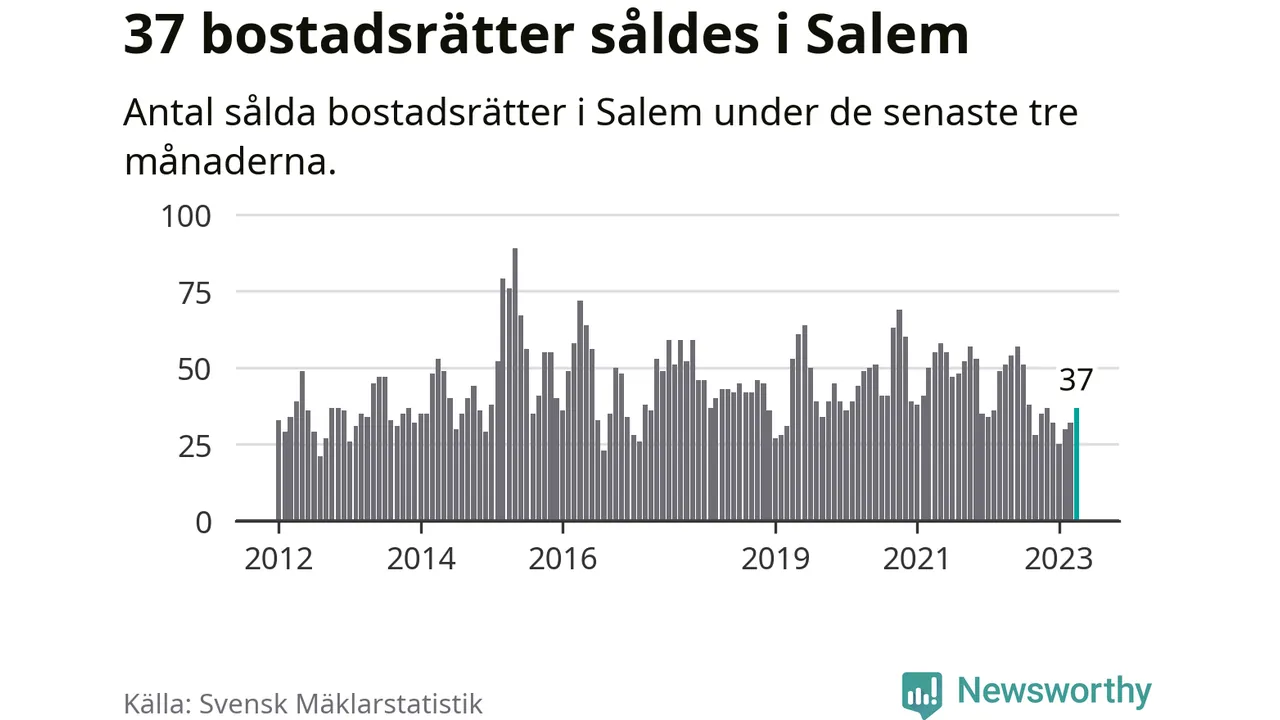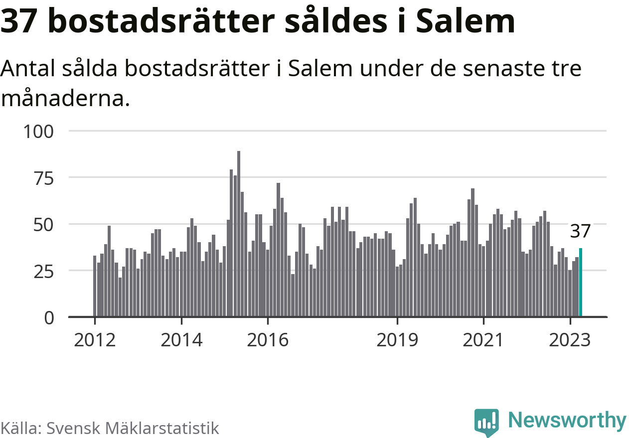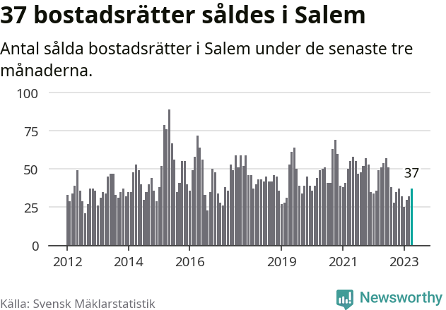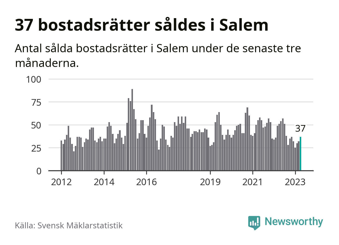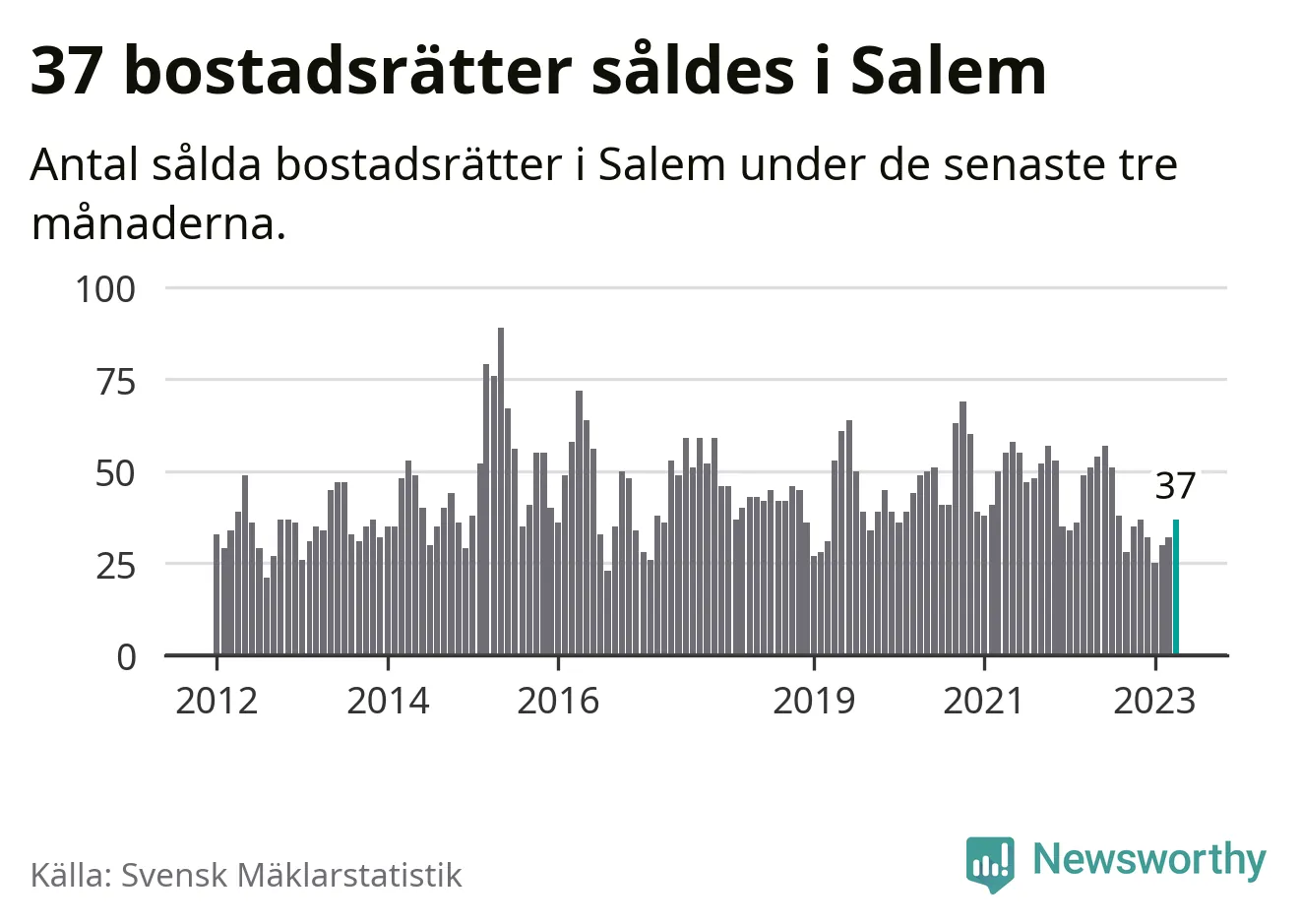Sammanlagt såldes 37 bostadsrätter i Salems kommun mellan februari och april till ett genomsnittligt pris på 2,2 miljoner kronor. I fjol gjordes 51 affärer vid den här tiden på året.