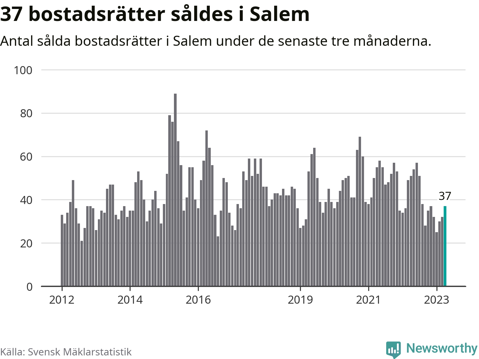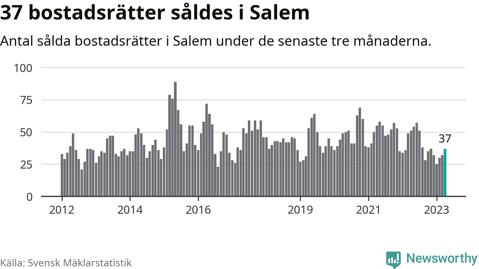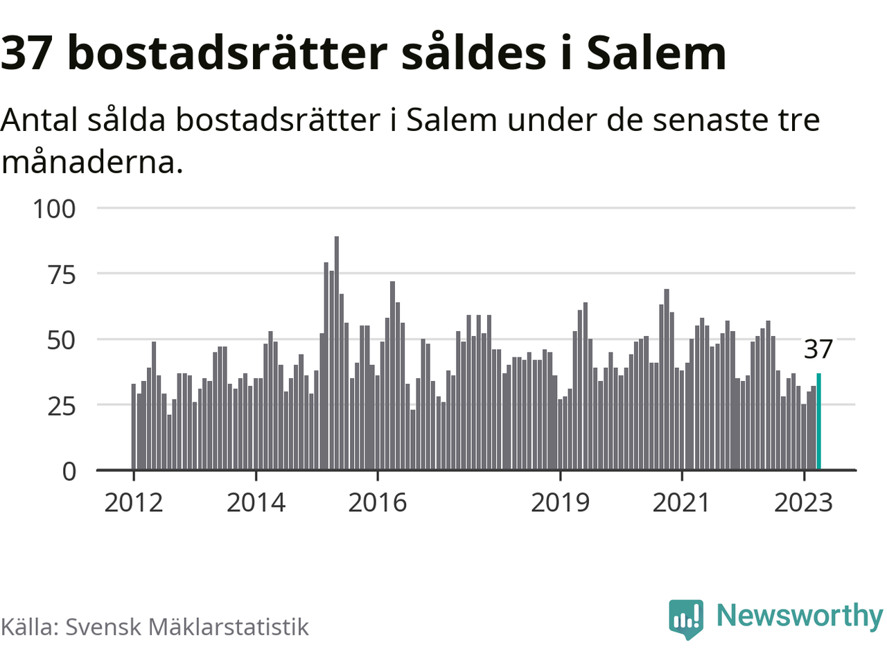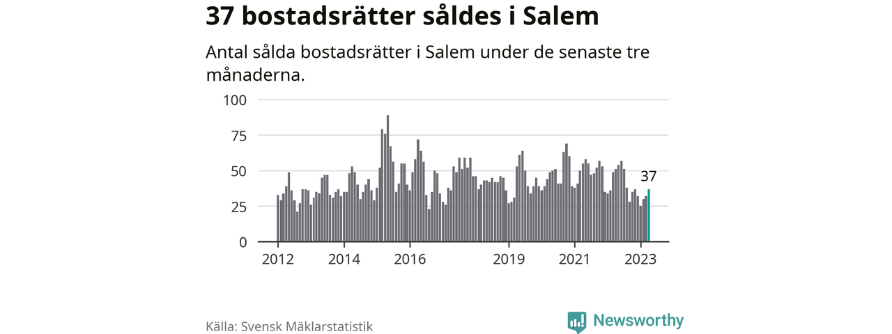 Sammanlagt såldes 37 bostadsrätter i Salems kommun mellan februari och april till ett genomsnittligt pris på 2,2 miljoner kronor. I fjol gjordes 51 affärer vid den här tiden på året.