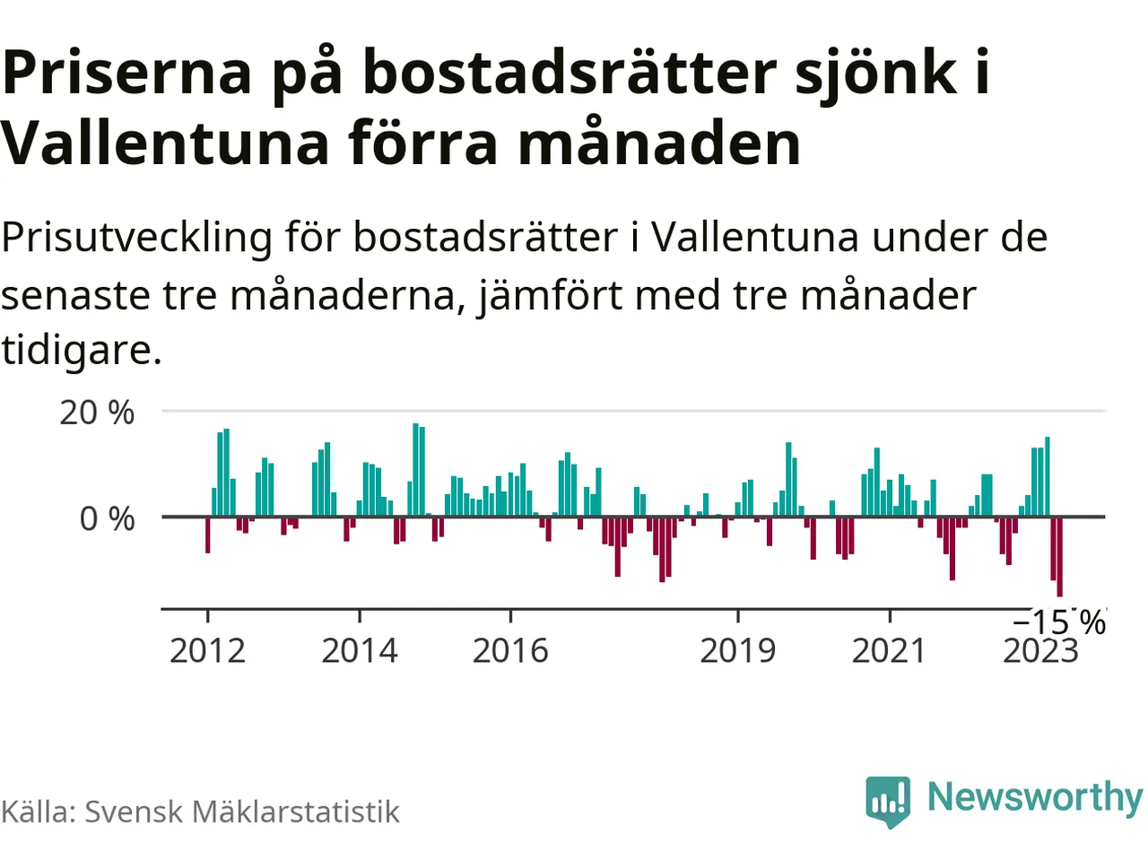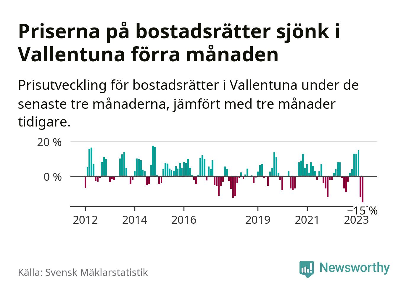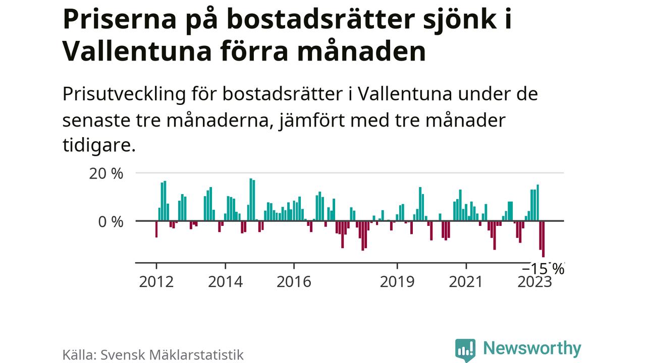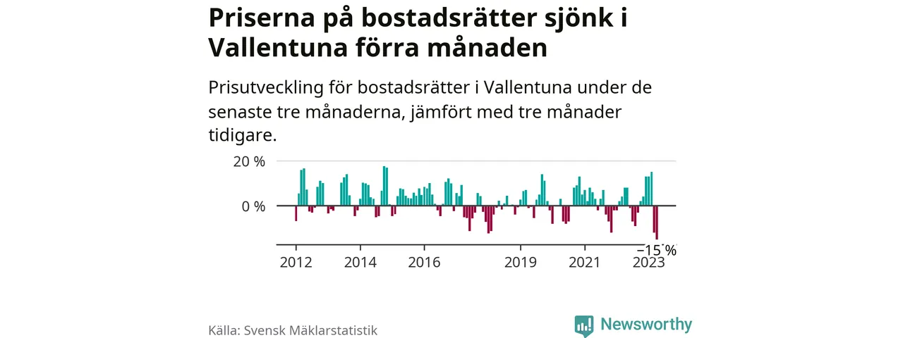 Priserna på bostadsrätter sjönk med 15 procent i Vallentuna kommun under de senaste tre månaderna. Det är den svagaste prisutvecklingen sedan 2012.
