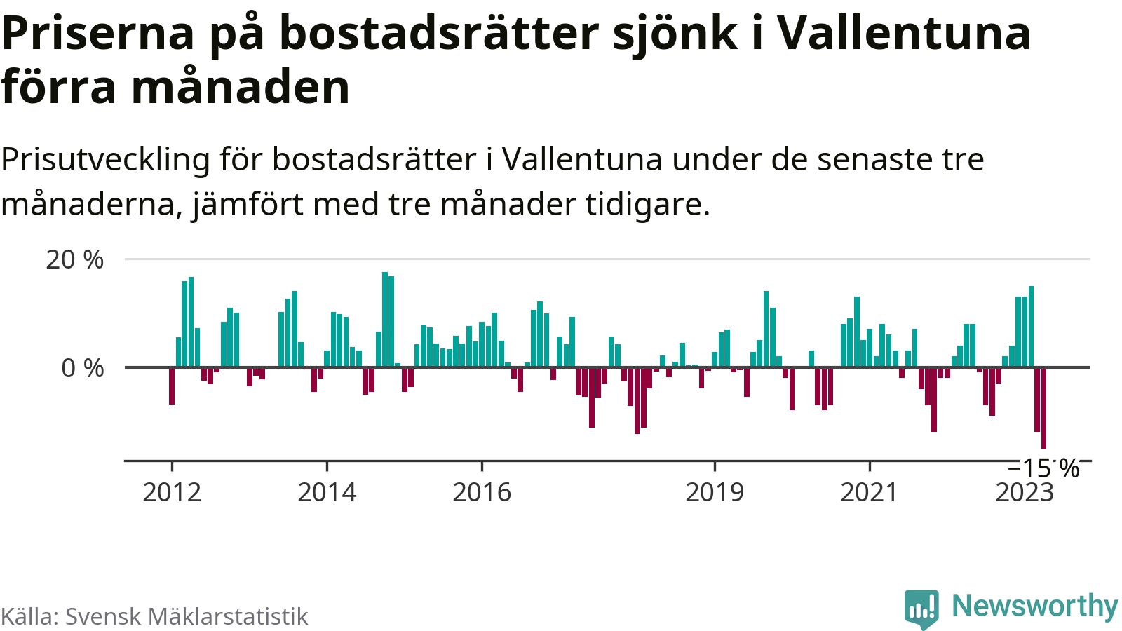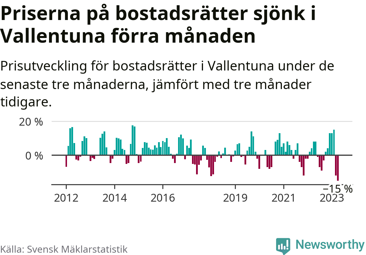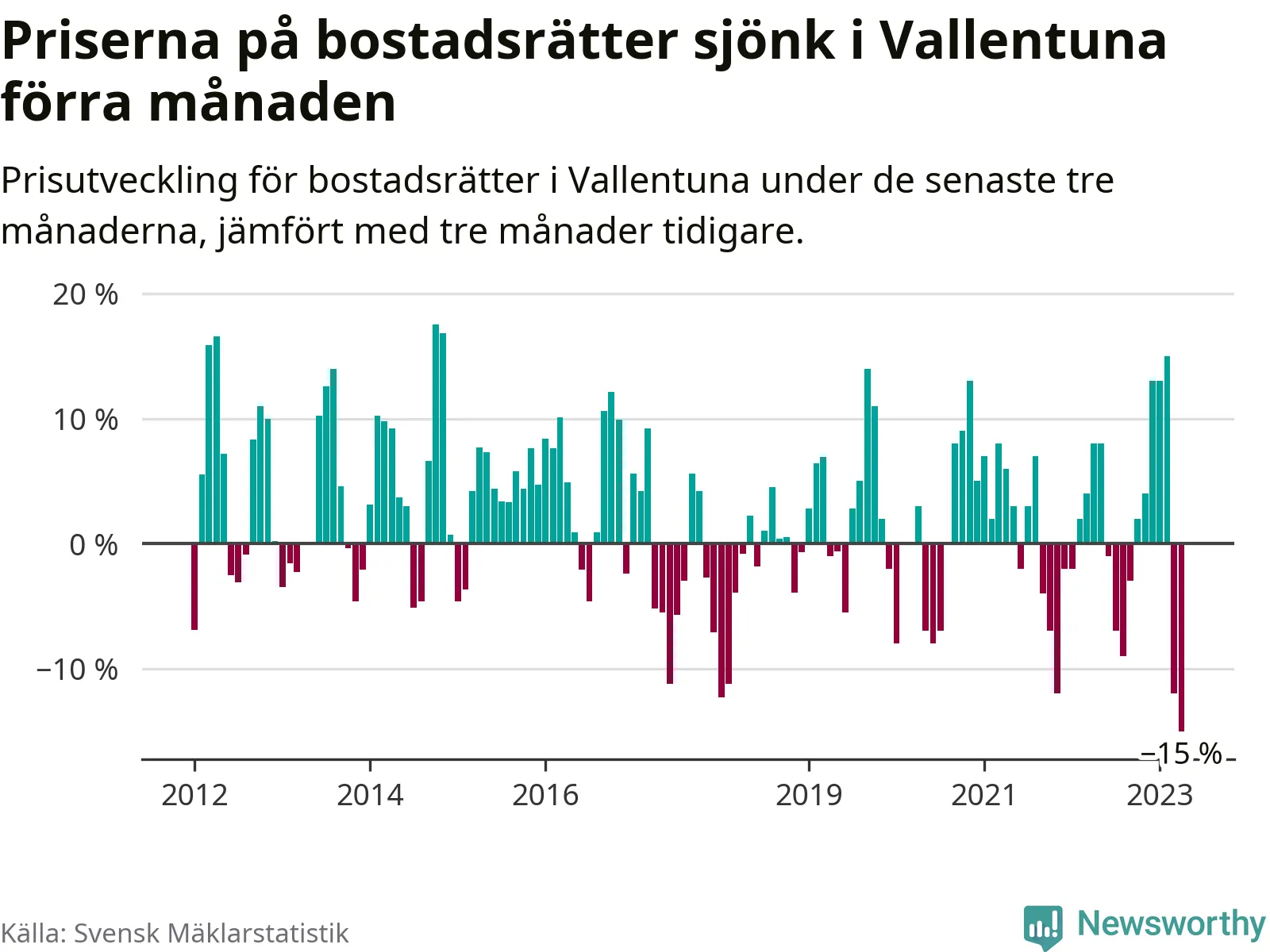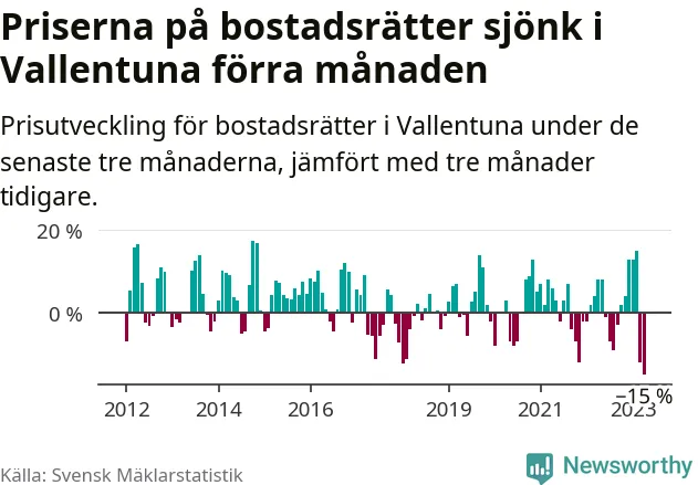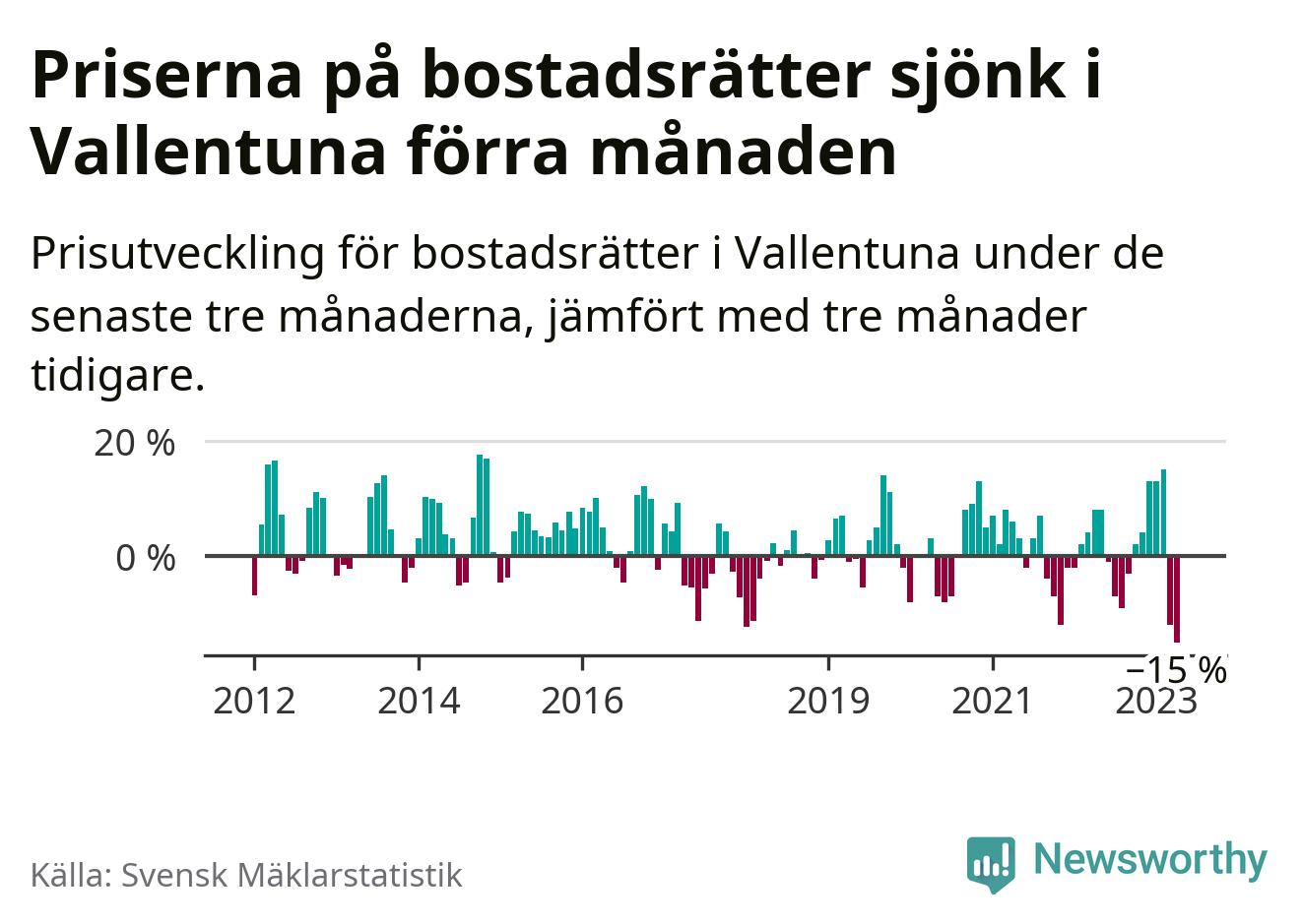 Priserna på bostadsrätter sjönk med 15 procent i Vallentuna kommun under de senaste tre månaderna. Det är den svagaste prisutvecklingen sedan 2012.