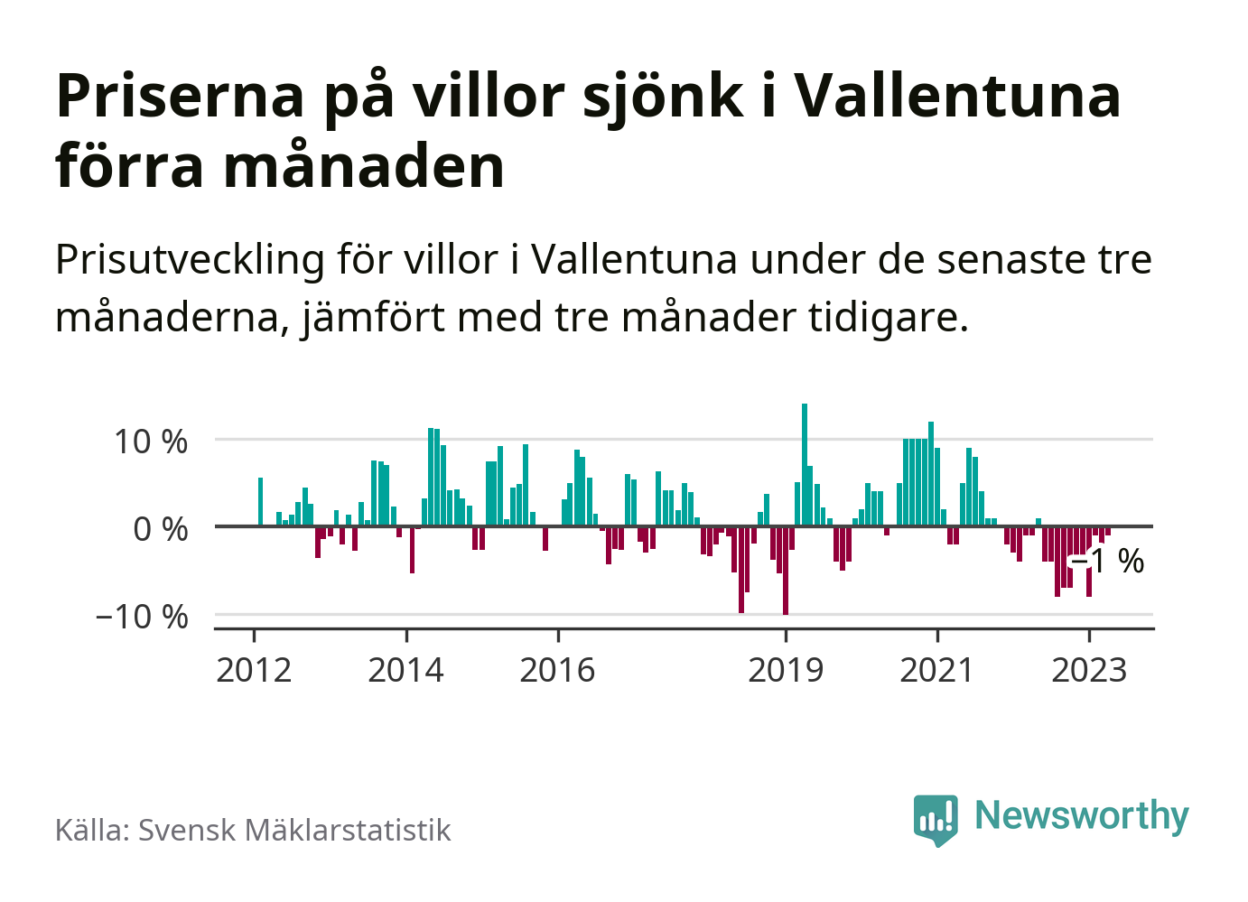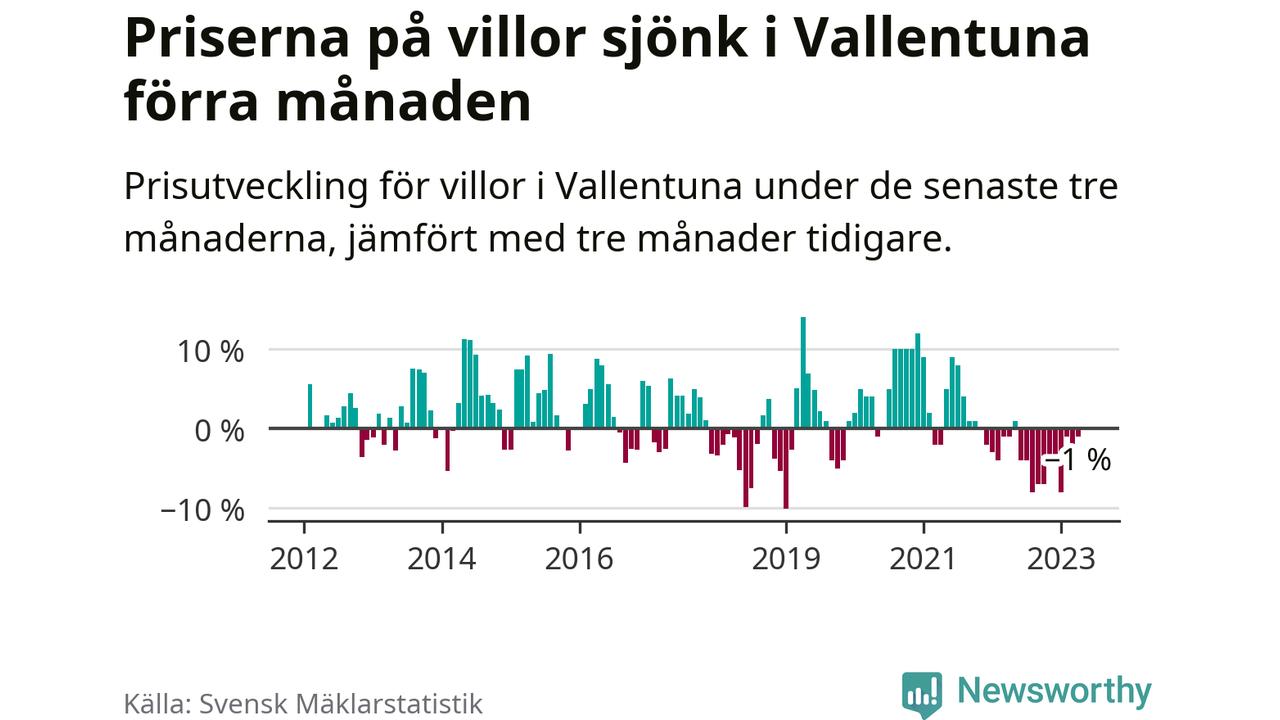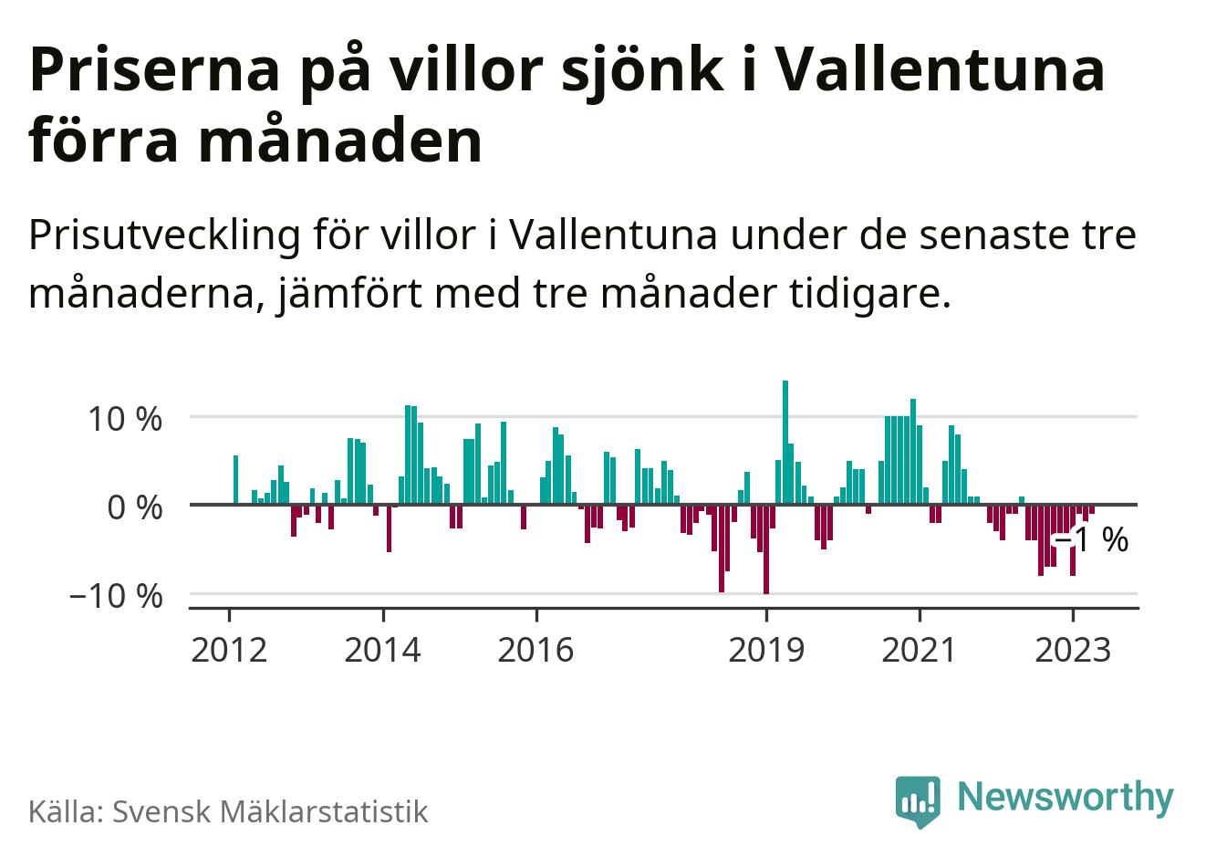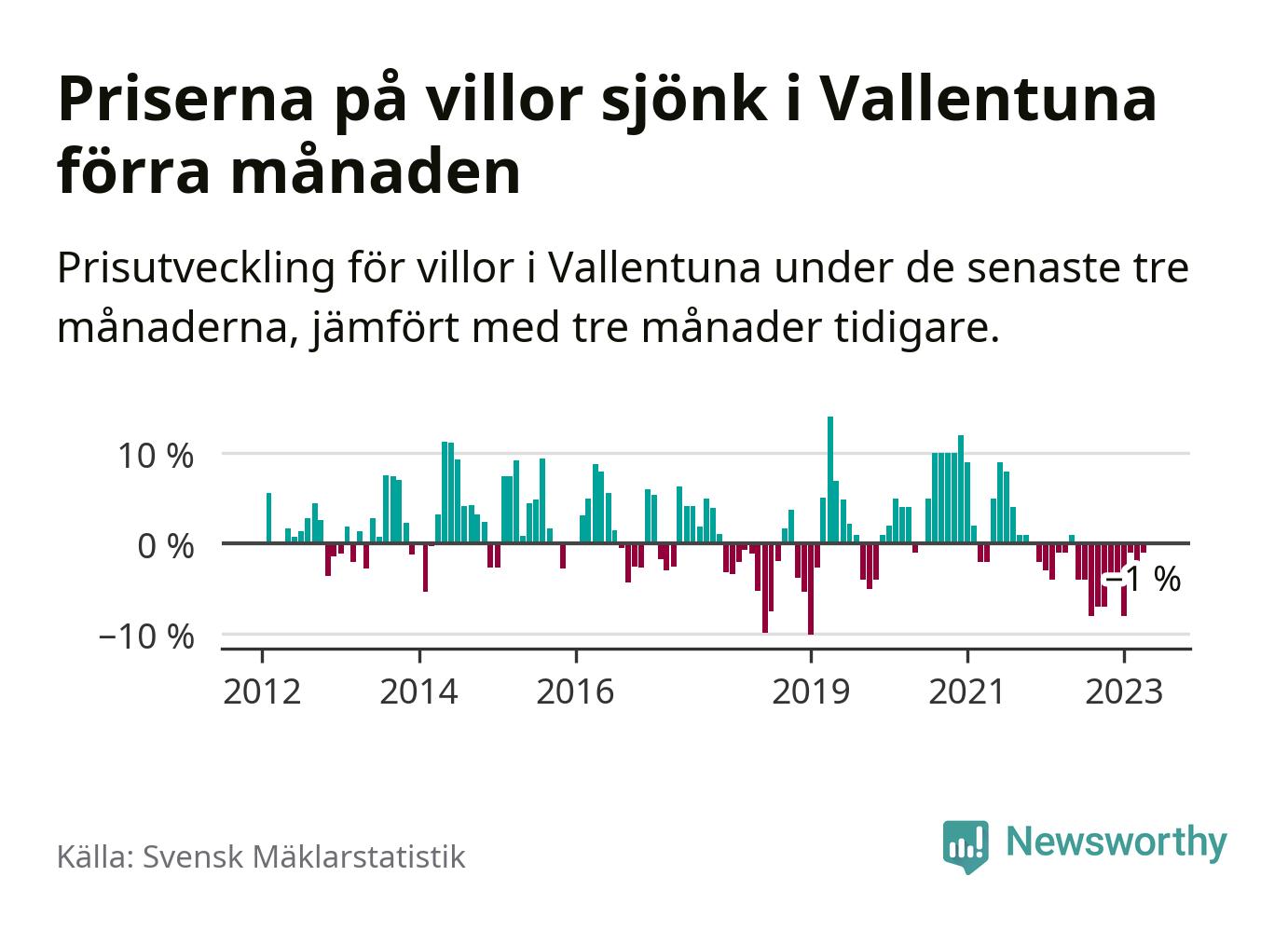 Statistiken visar även på en prisnedgång i Vallentuna kommun. Medelpriset på försäljningarna av villor i kommunen var 1 procent lägre än för tre månader sedan. I hela Stockholms län däremot ökar villapriserna. I hela länet noterades en prisuppgång på 3 procent.