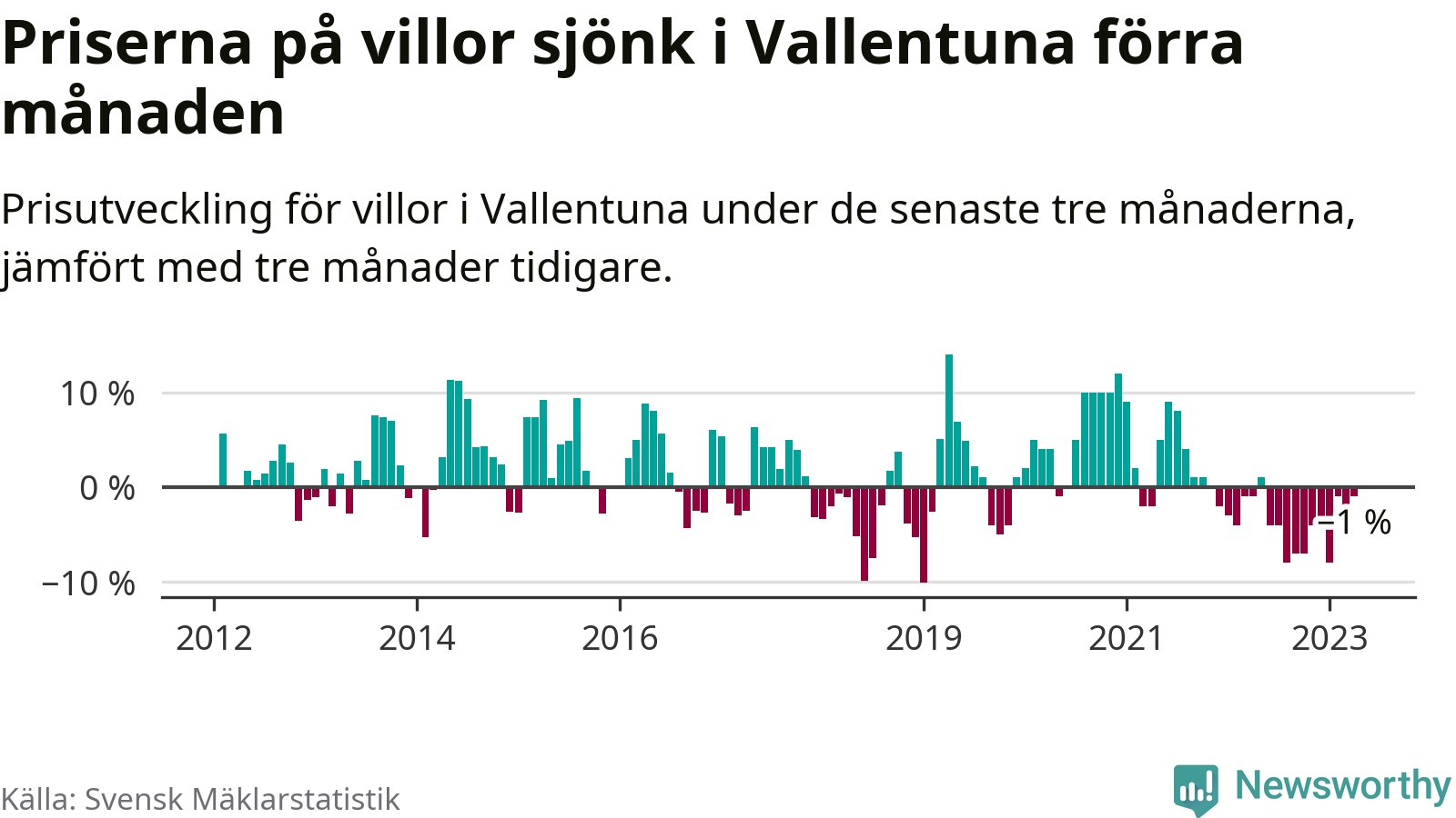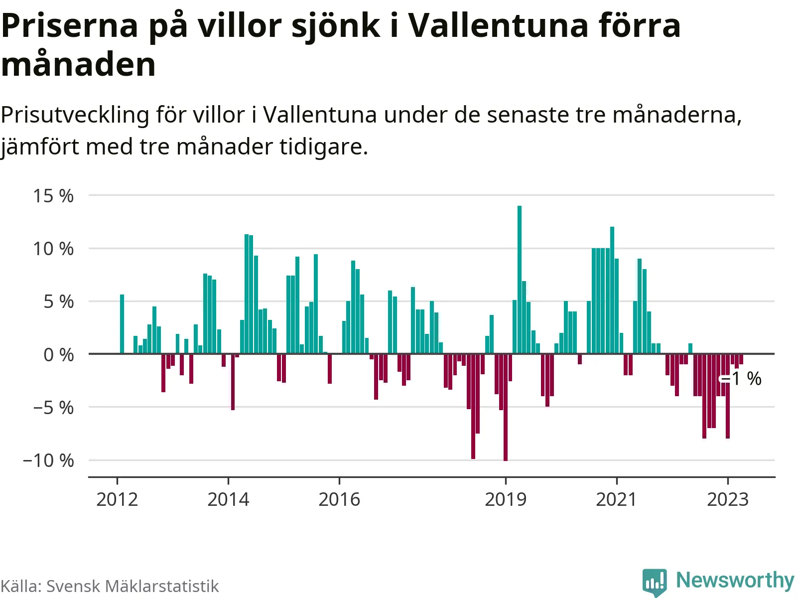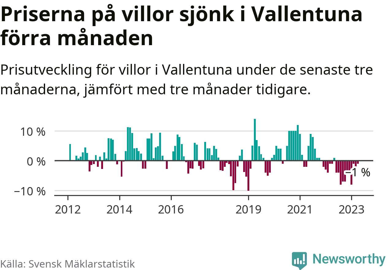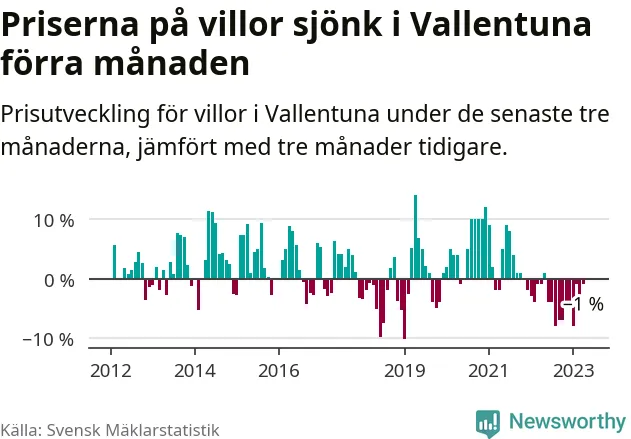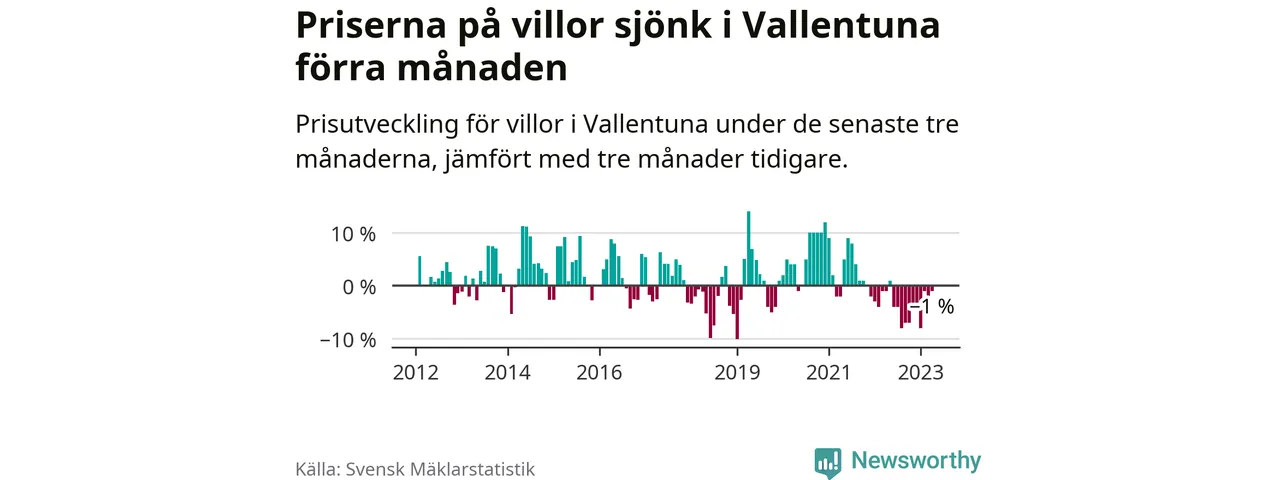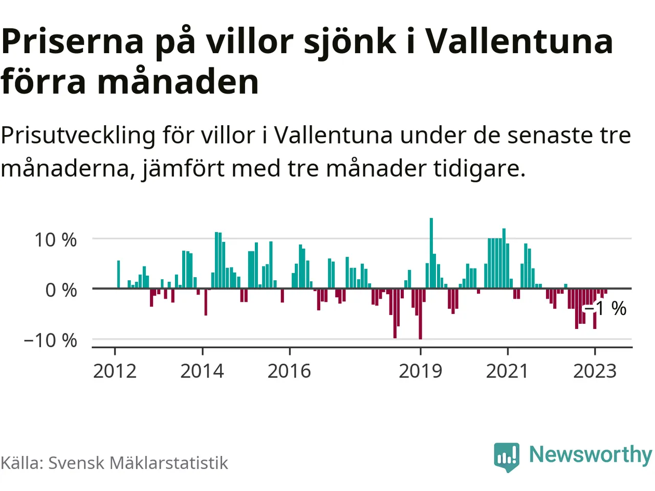 Statistiken visar även på en prisnedgång i Vallentuna kommun. Medelpriset på försäljningarna av villor i kommunen var 1 procent lägre än för tre månader sedan. I hela Stockholms län däremot ökar villapriserna. I hela länet noterades en prisuppgång på 3 procent.