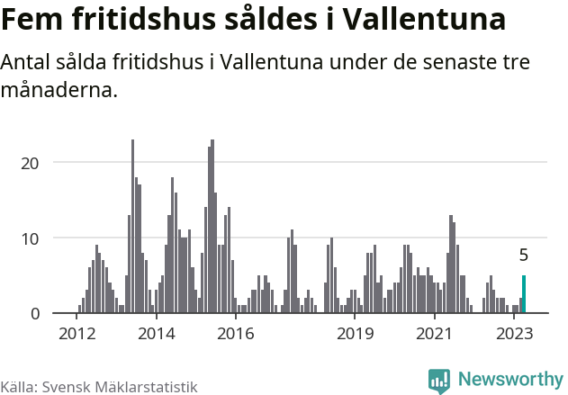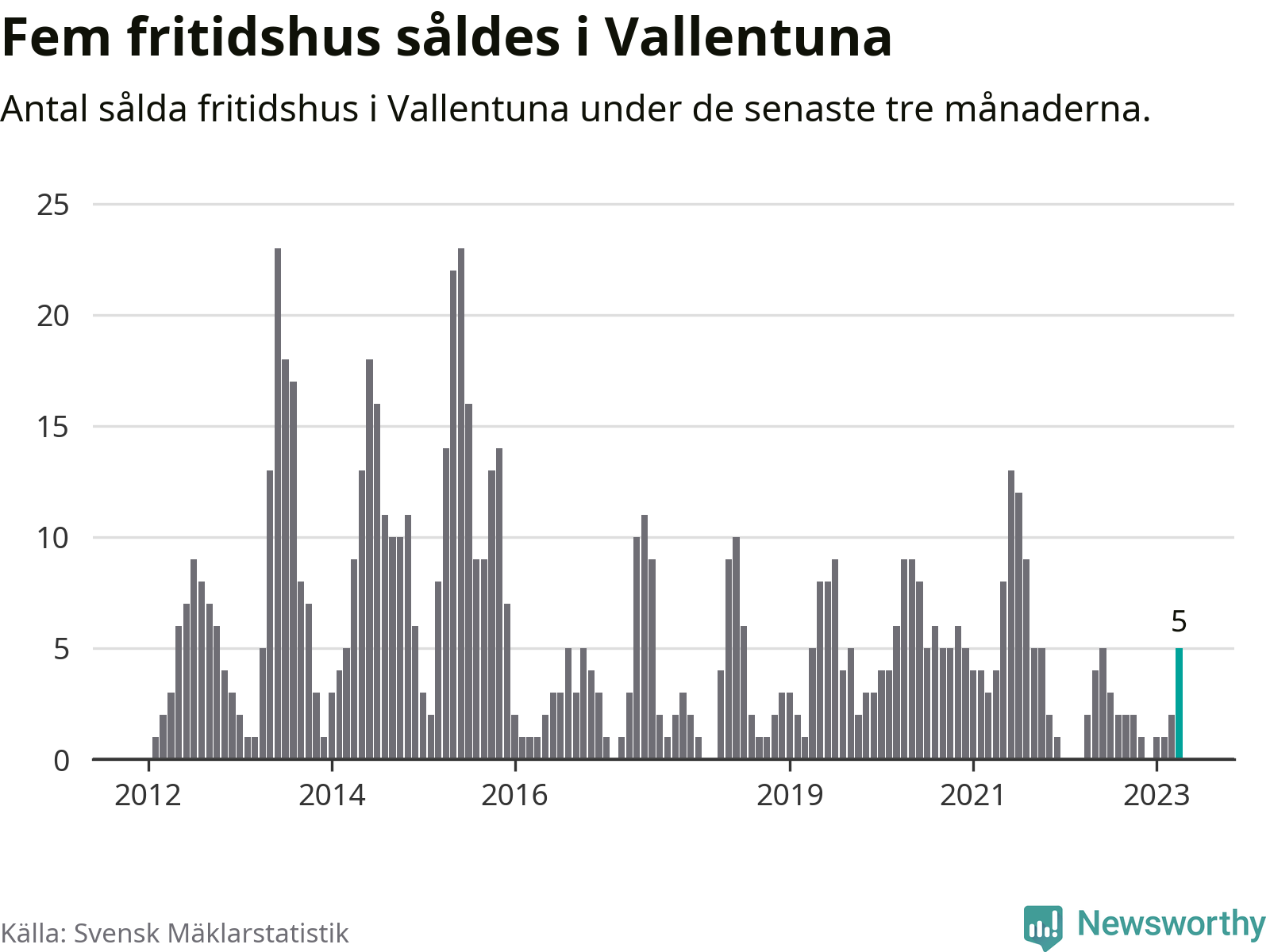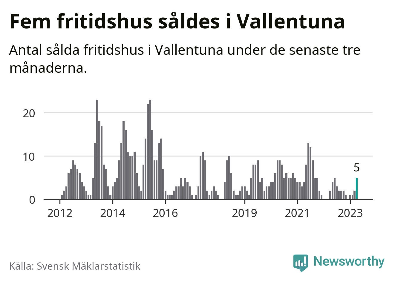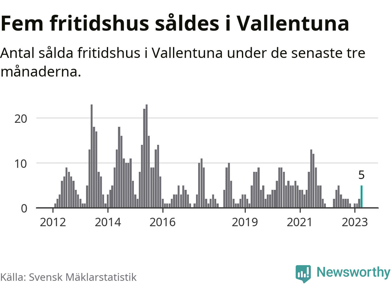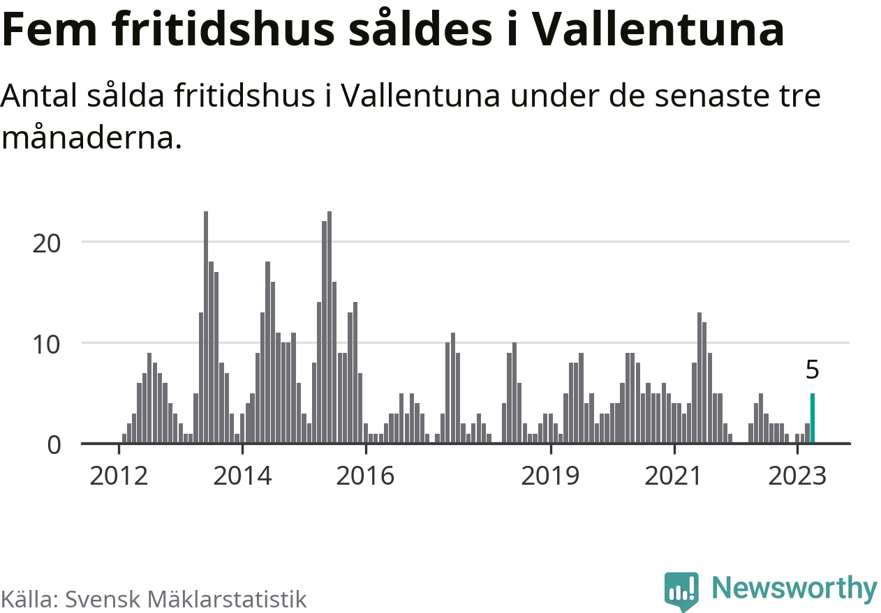 Mellan februari och april gjordes sammanlagt fem affärer med fritidshus i Vallentuna kommun. Det kan jämföras med två vid motsvarande tid i fjol.