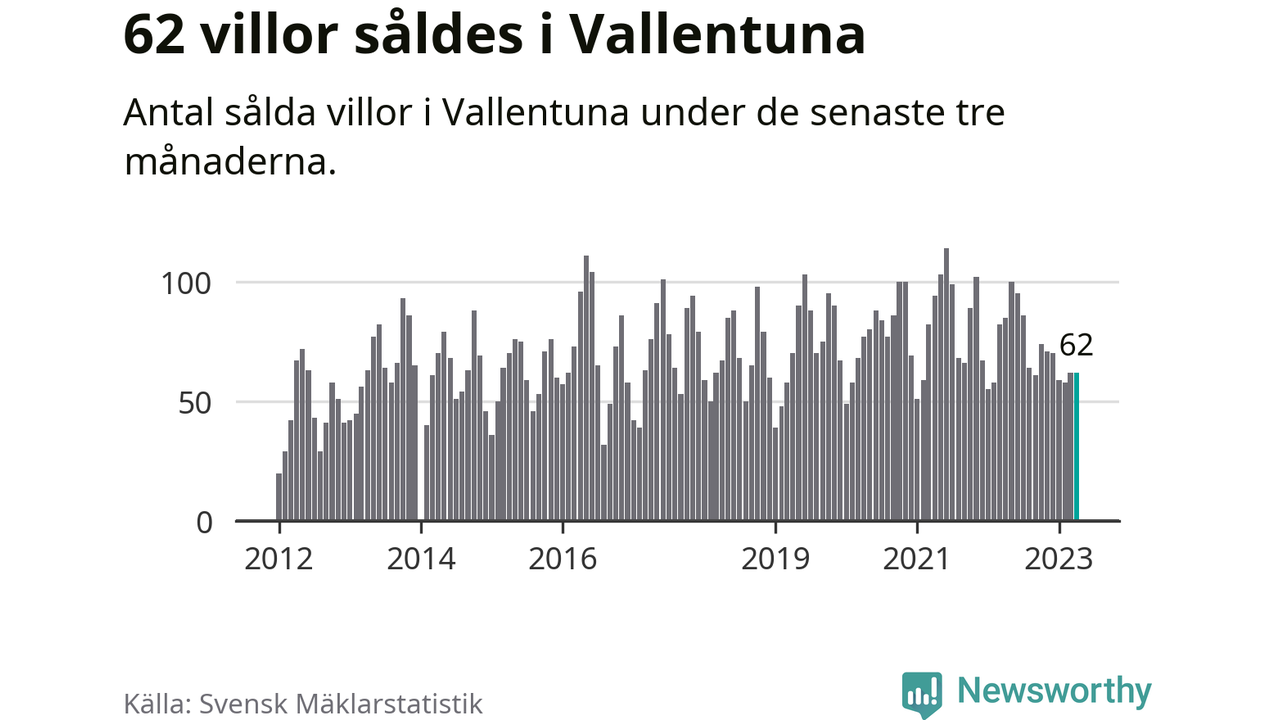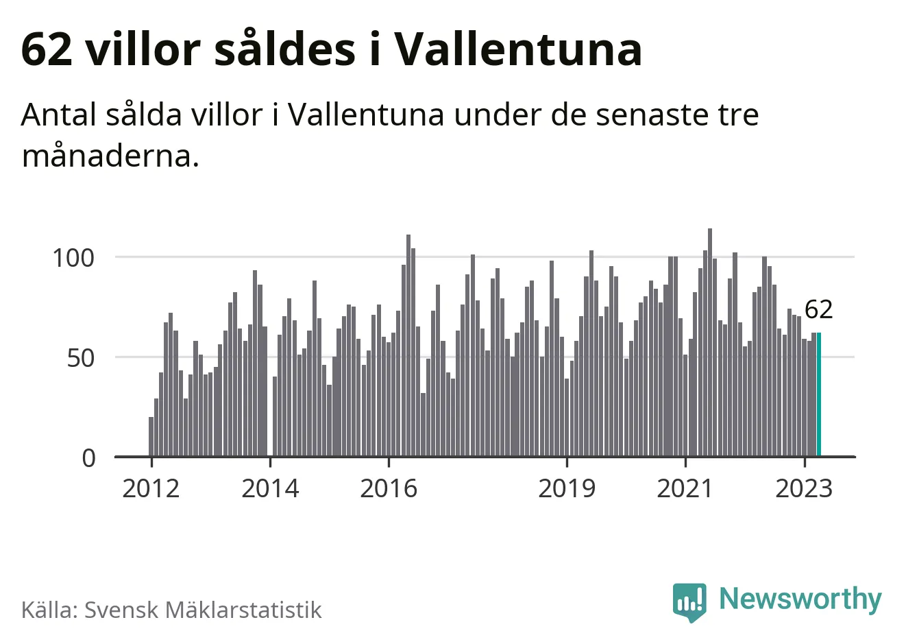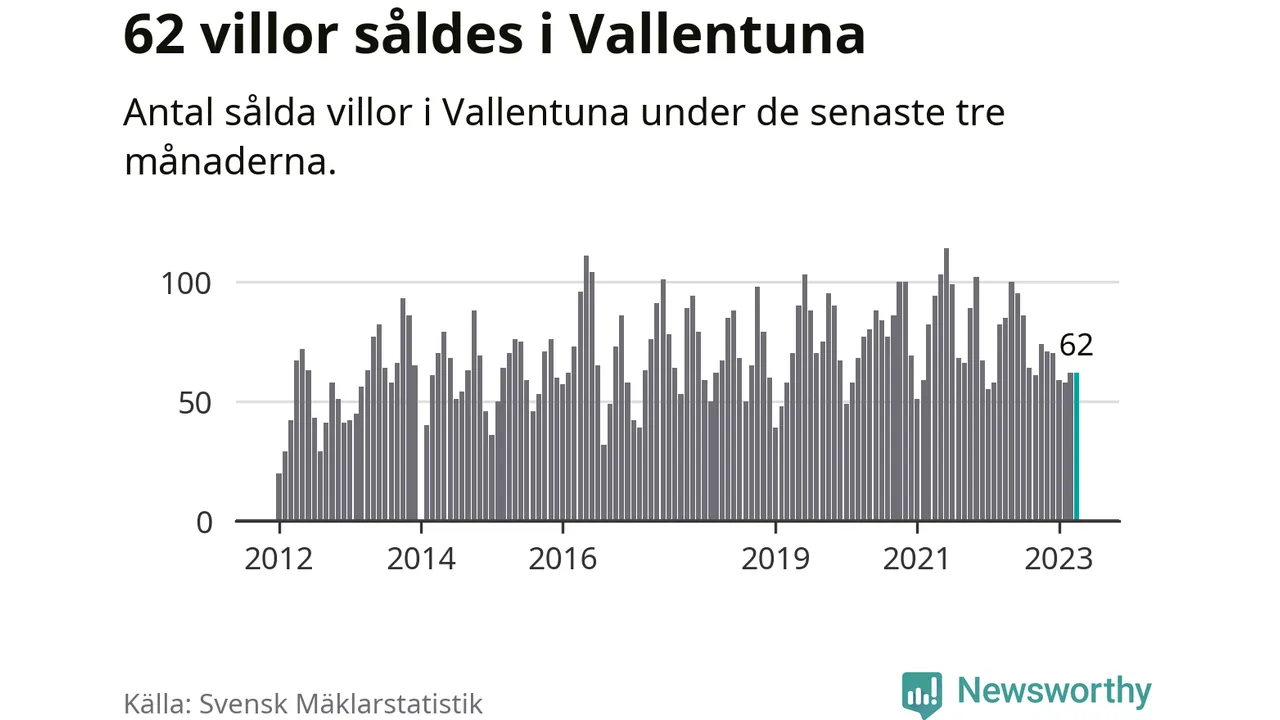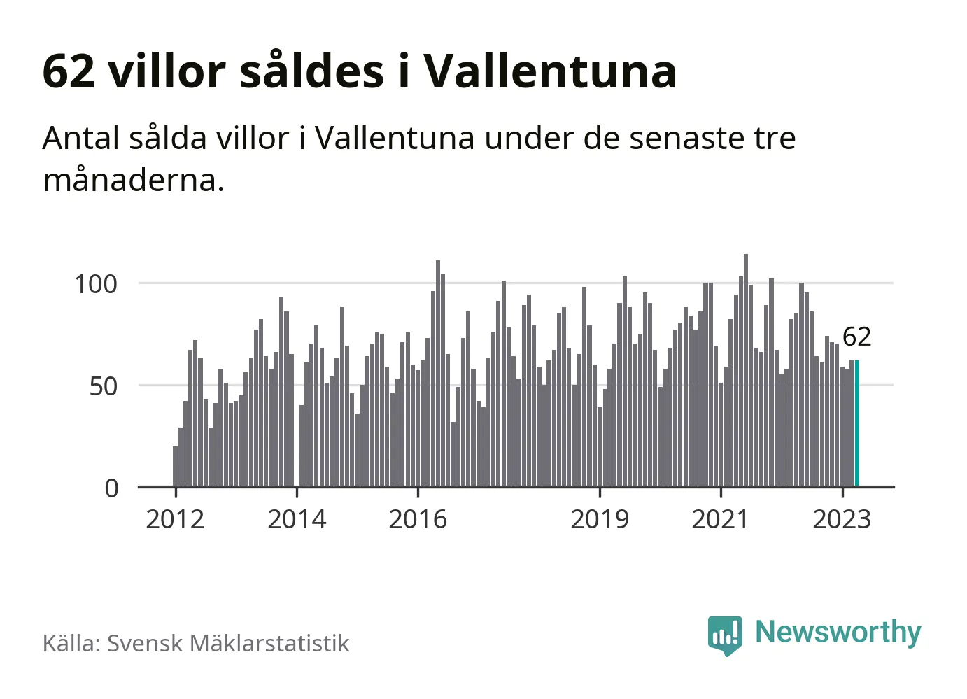 Mellan februari och april såldes 62 villor i Vallentuna kommun. Det är relativt få sett till aktiviteten på bostadsmarknaden i kommunen under de senaste tolv månaderna, samt det historiska snittet för den här tiden på året.