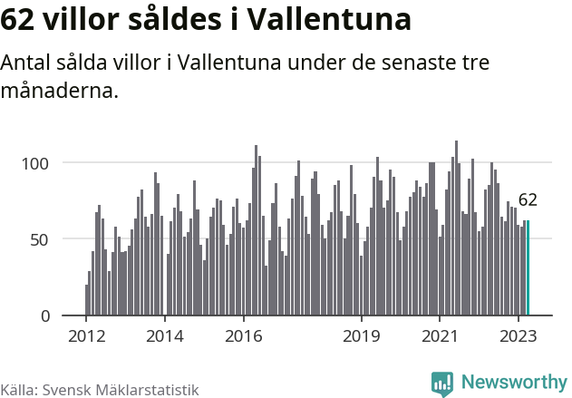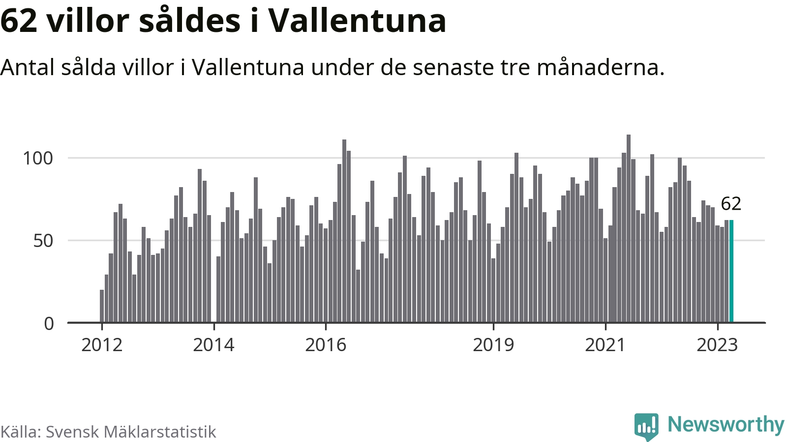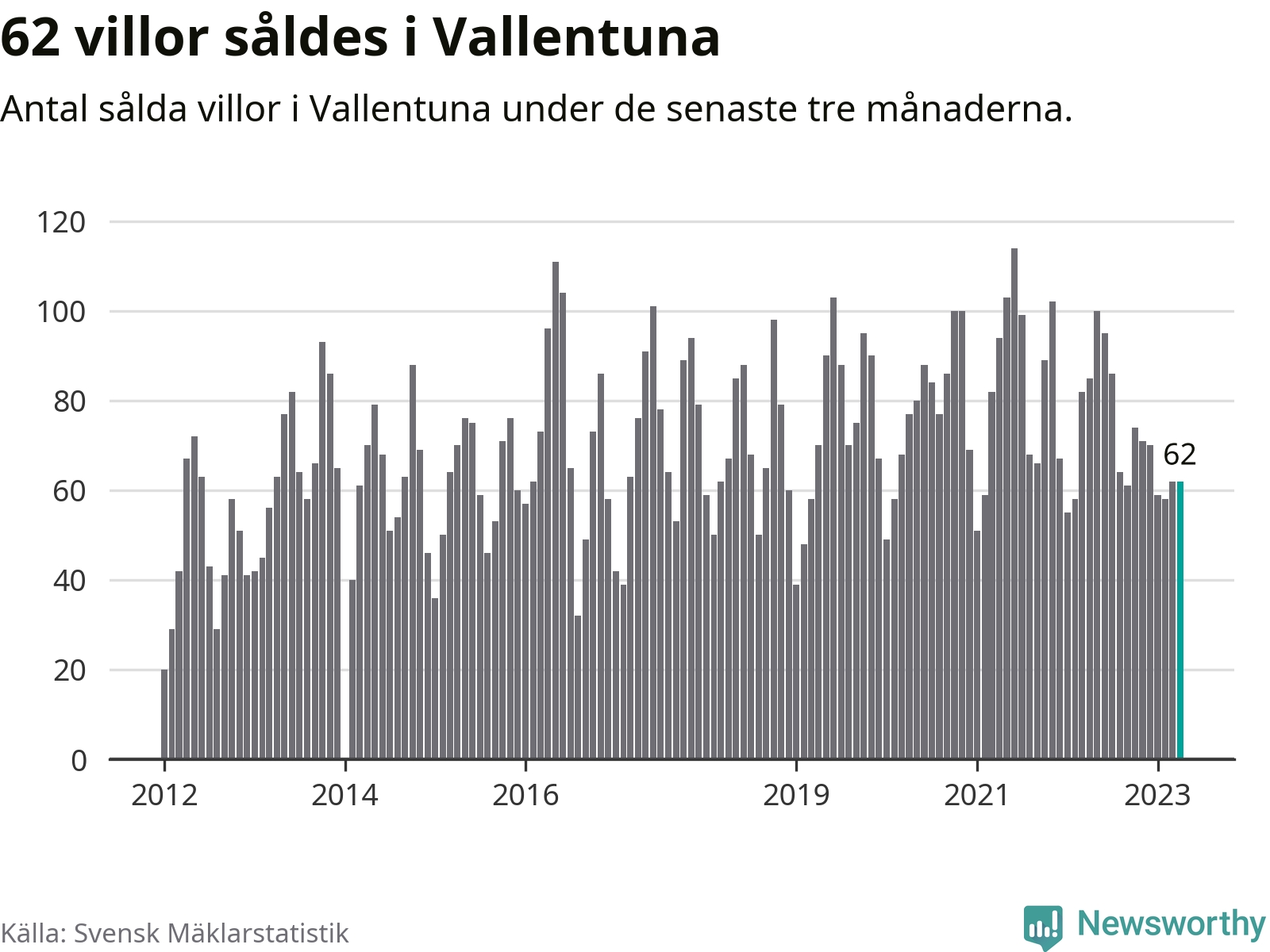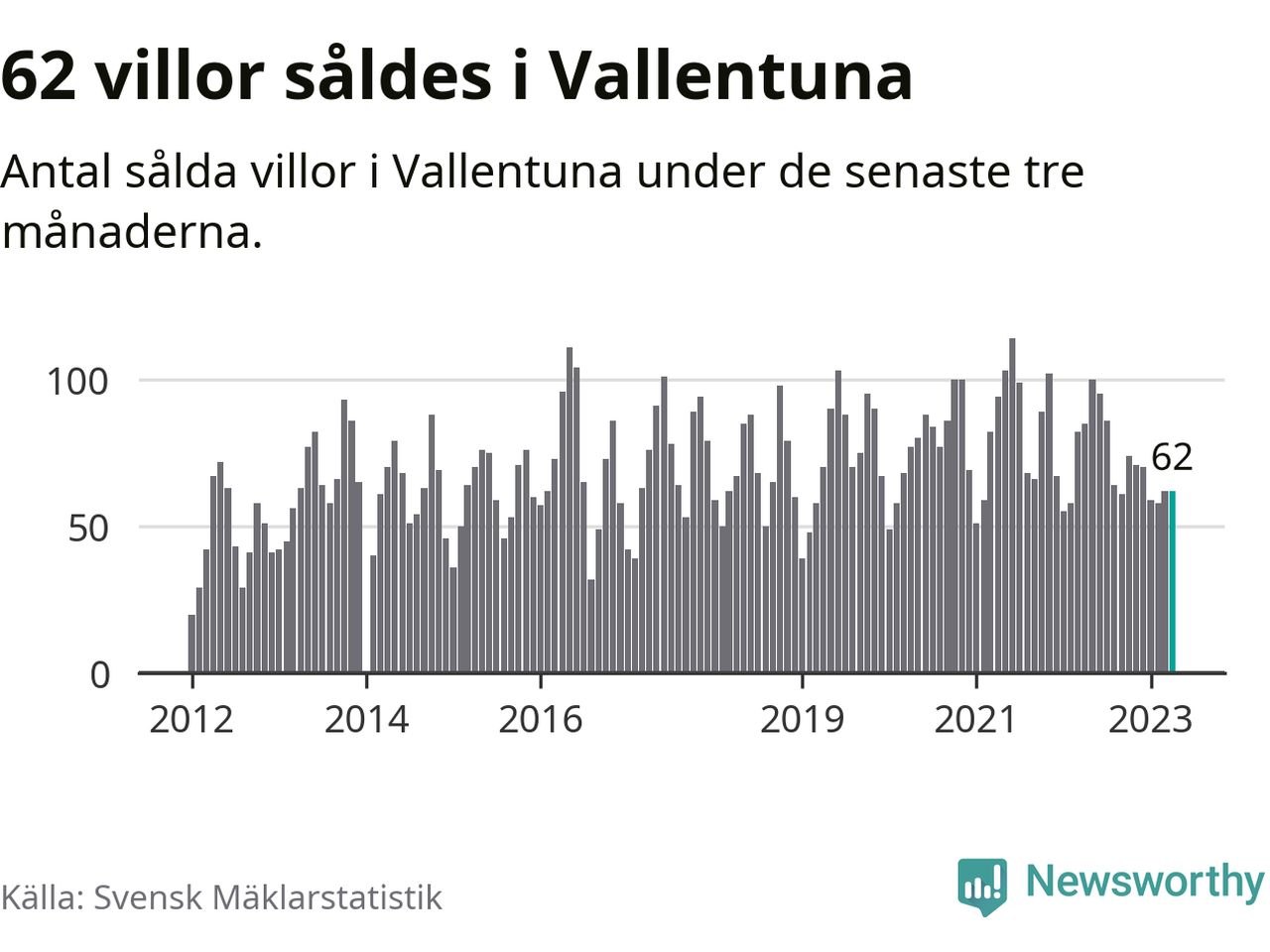 Mellan februari och april såldes 62 villor i Vallentuna kommun. Det är relativt få sett till aktiviteten på bostadsmarknaden i kommunen under de senaste tolv månaderna, samt det historiska snittet för den här tiden på året.