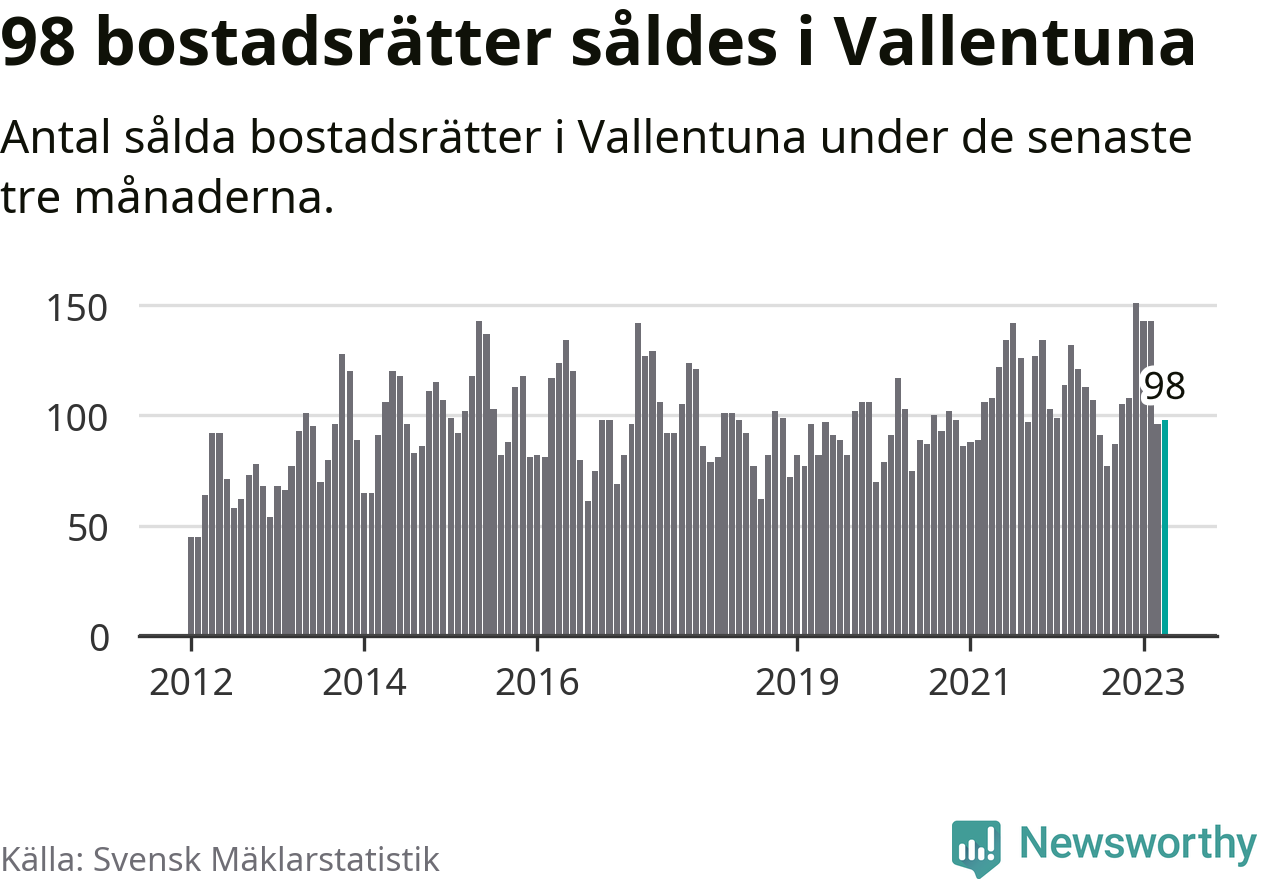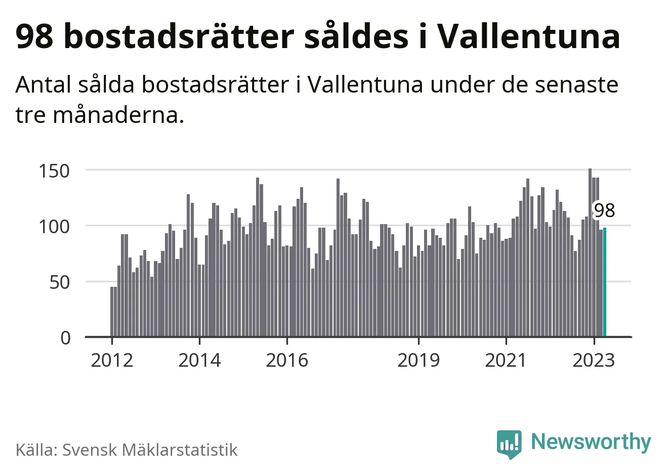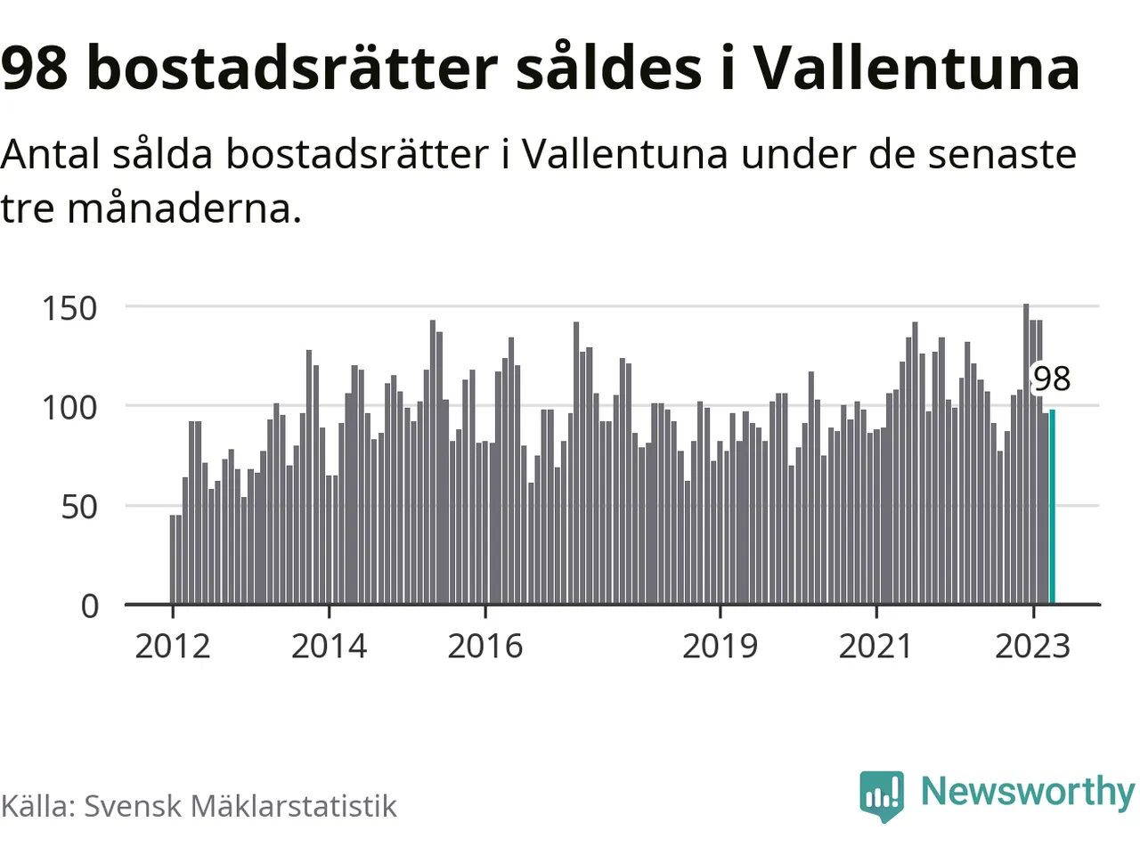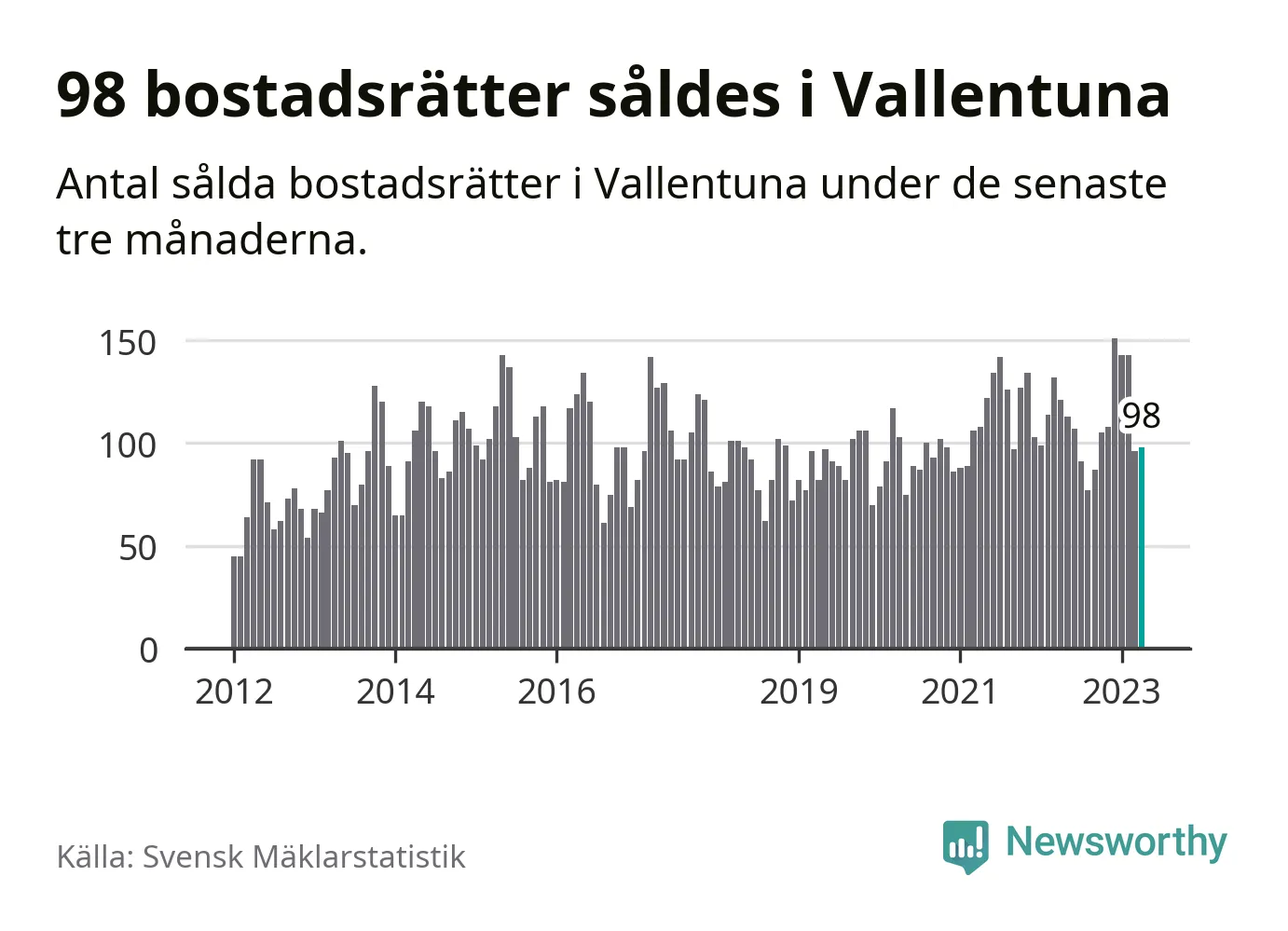 Sammanlagt såldes 98 bostadsrätter i Vallentuna kommun mellan februari och april till ett genomsnittligt pris på 2,3 miljoner kronor. I fjol gjordes 121 affärer vid den här tiden på året.