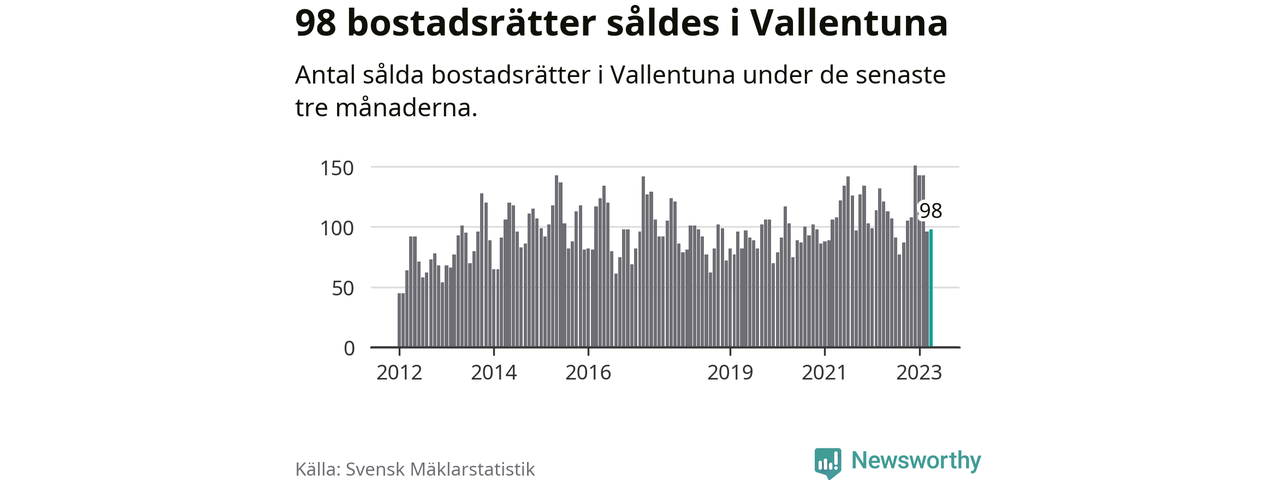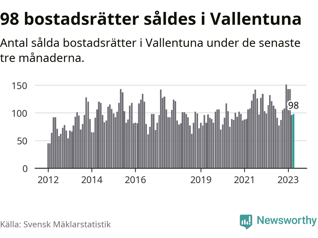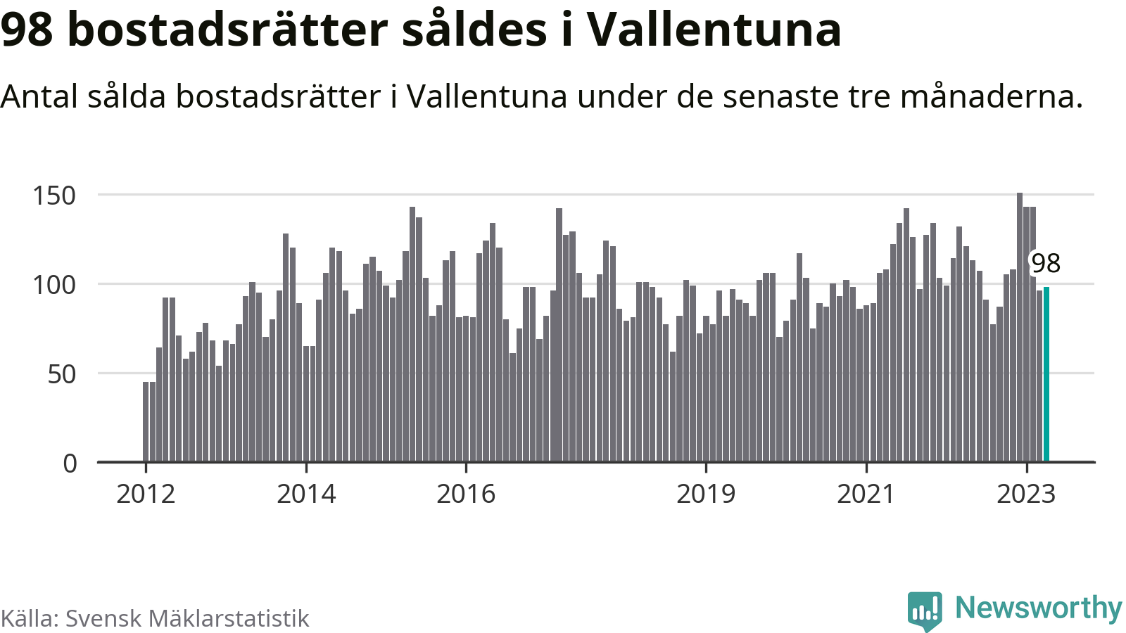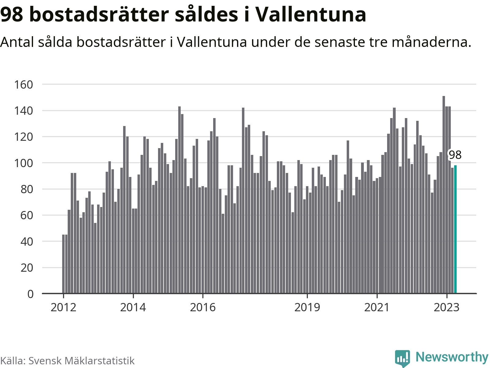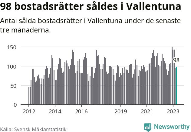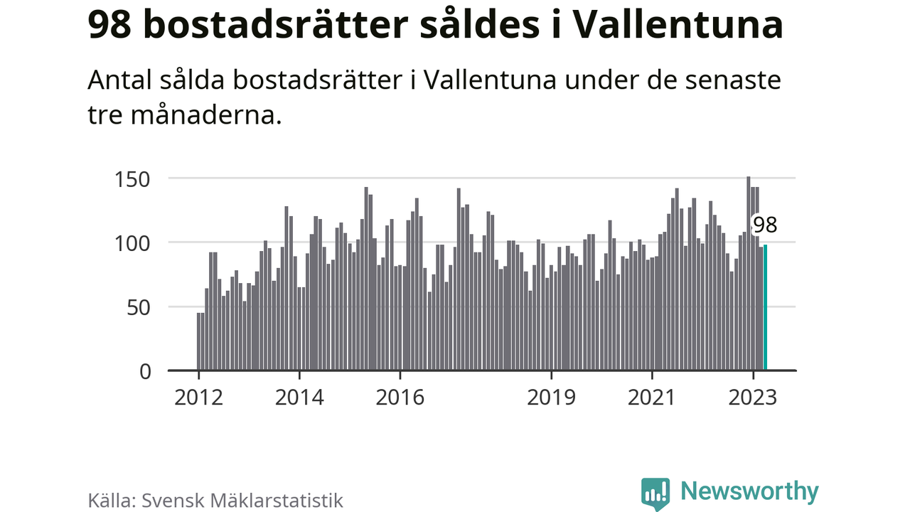 Sammanlagt såldes 98 bostadsrätter i Vallentuna kommun mellan februari och april till ett genomsnittligt pris på 2,3 miljoner kronor. I fjol gjordes 121 affärer vid den här tiden på året.