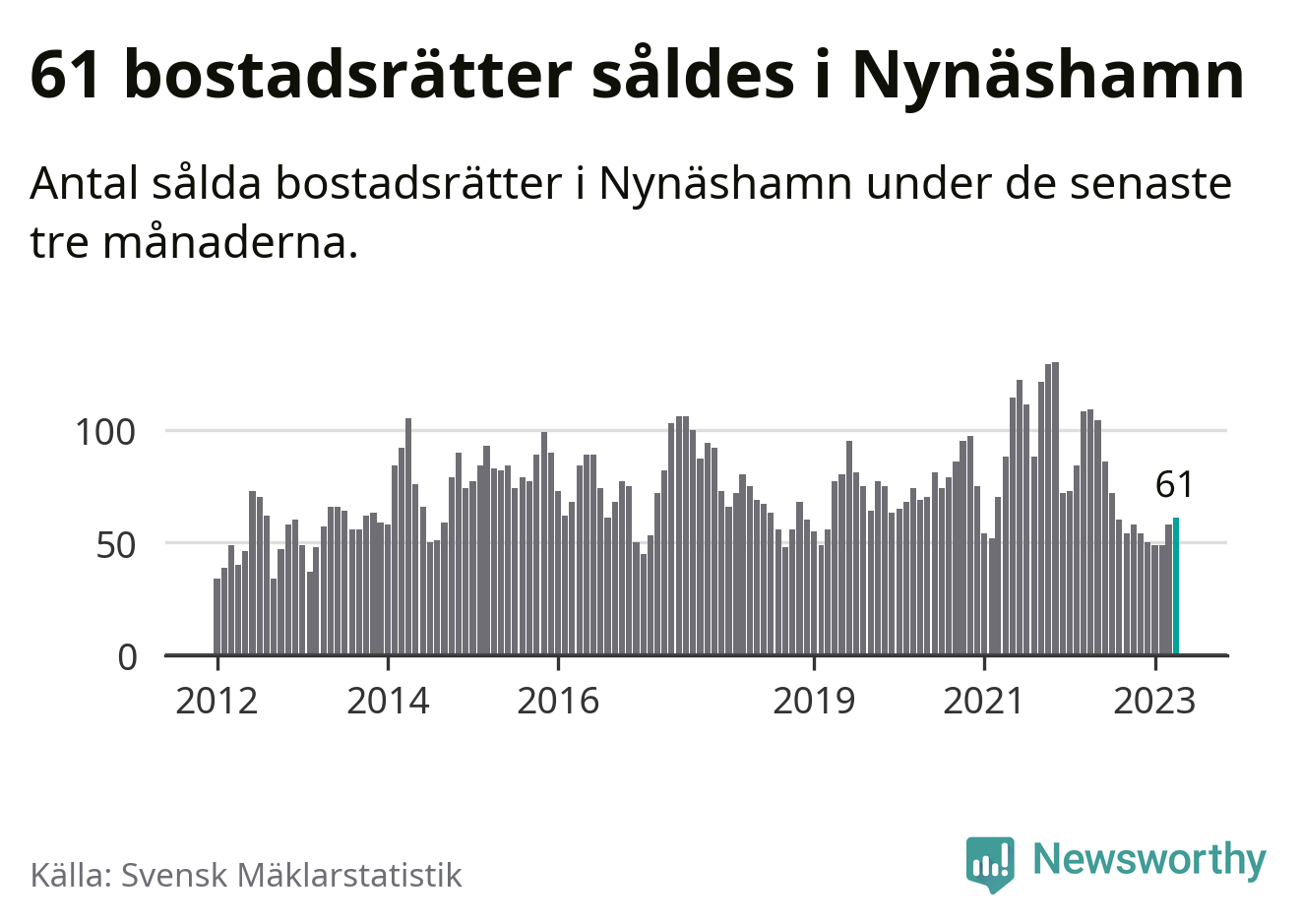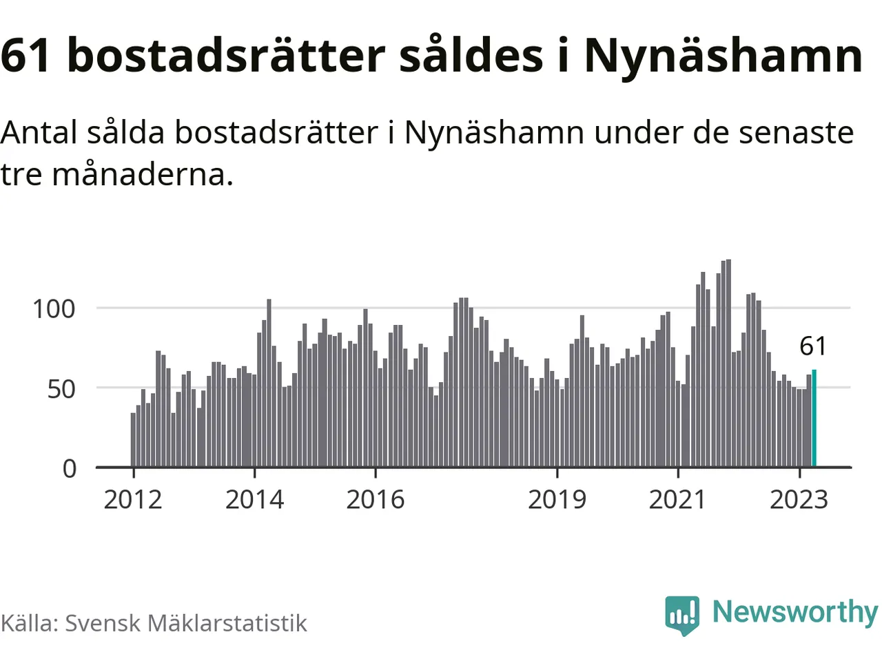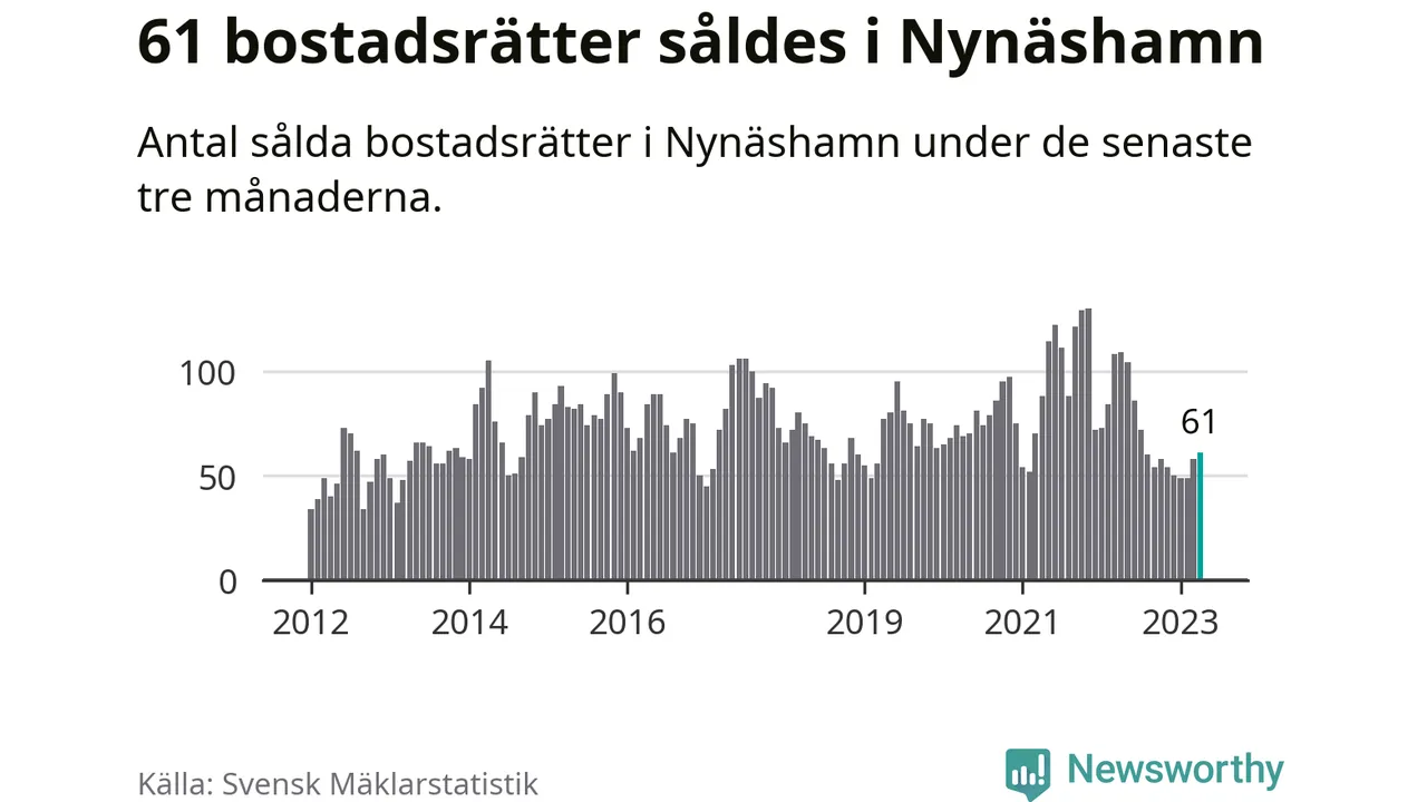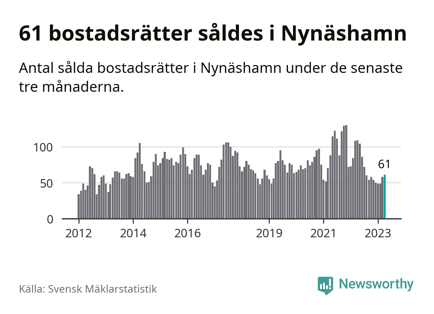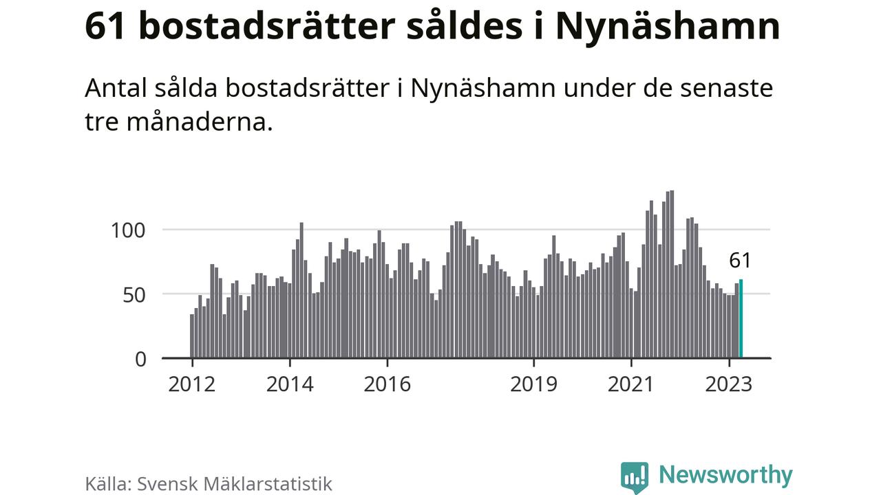 Sammanlagt såldes 61 bostadsrätter i Nynäshamns kommun mellan februari och april till ett genomsnittligt pris på 1,9 miljoner kronor. I fjol gjordes 109 affärer vid den här tiden på året.