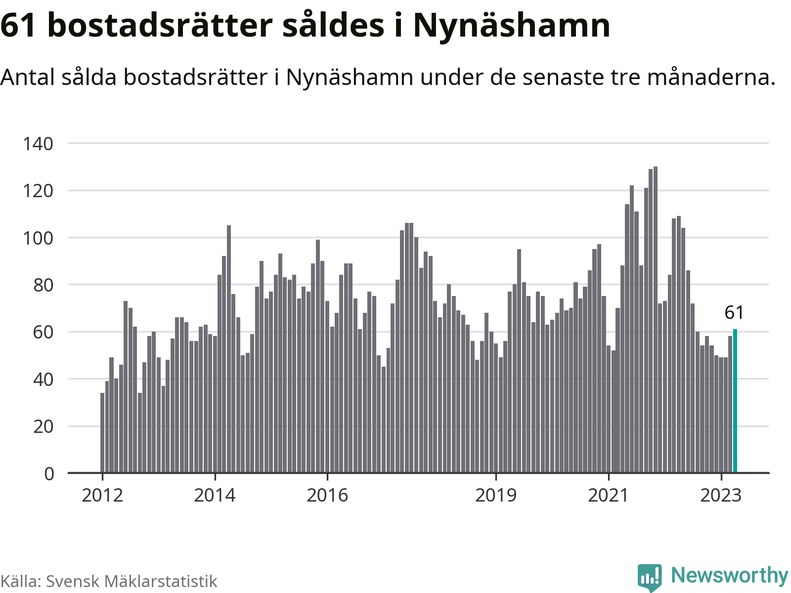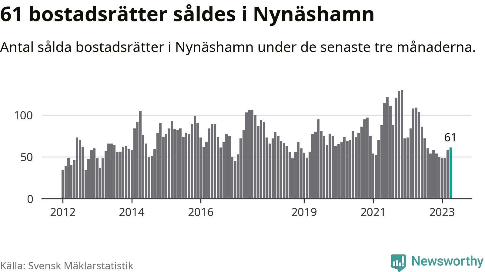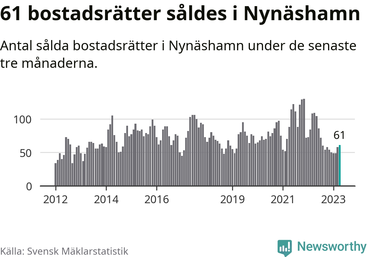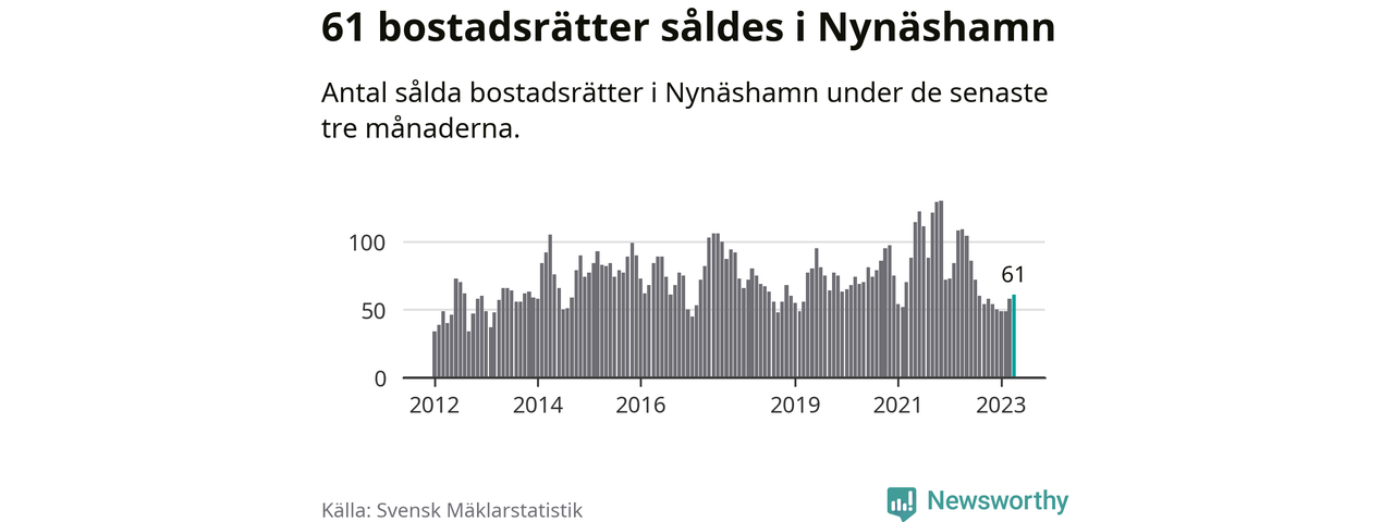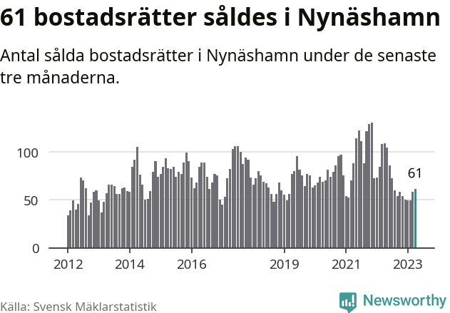 Sammanlagt såldes 61 bostadsrätter i Nynäshamns kommun mellan februari och april till ett genomsnittligt pris på 1,9 miljoner kronor. I fjol gjordes 109 affärer vid den här tiden på året.