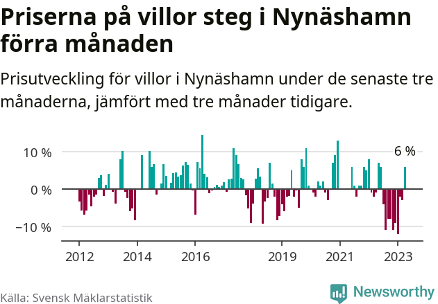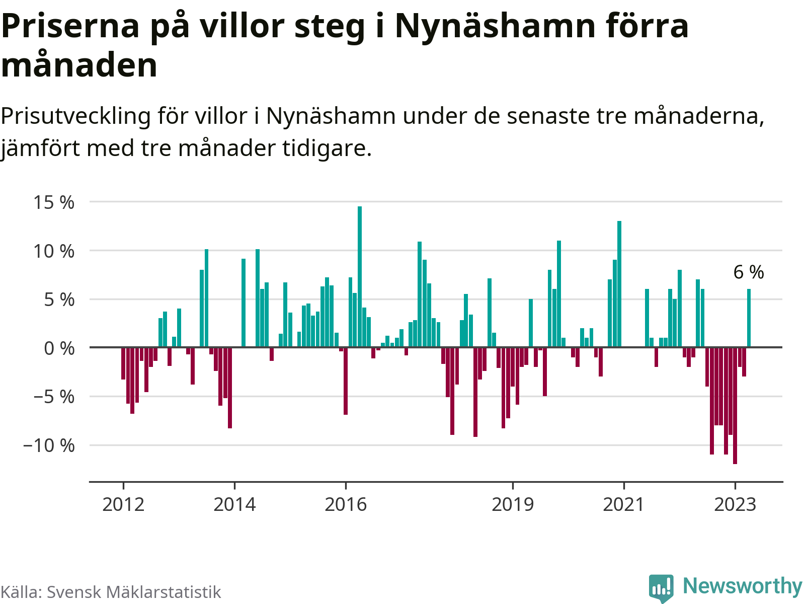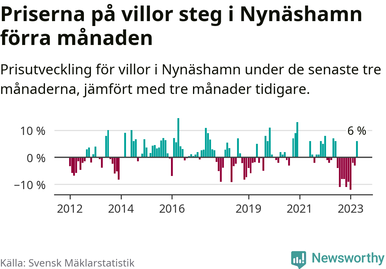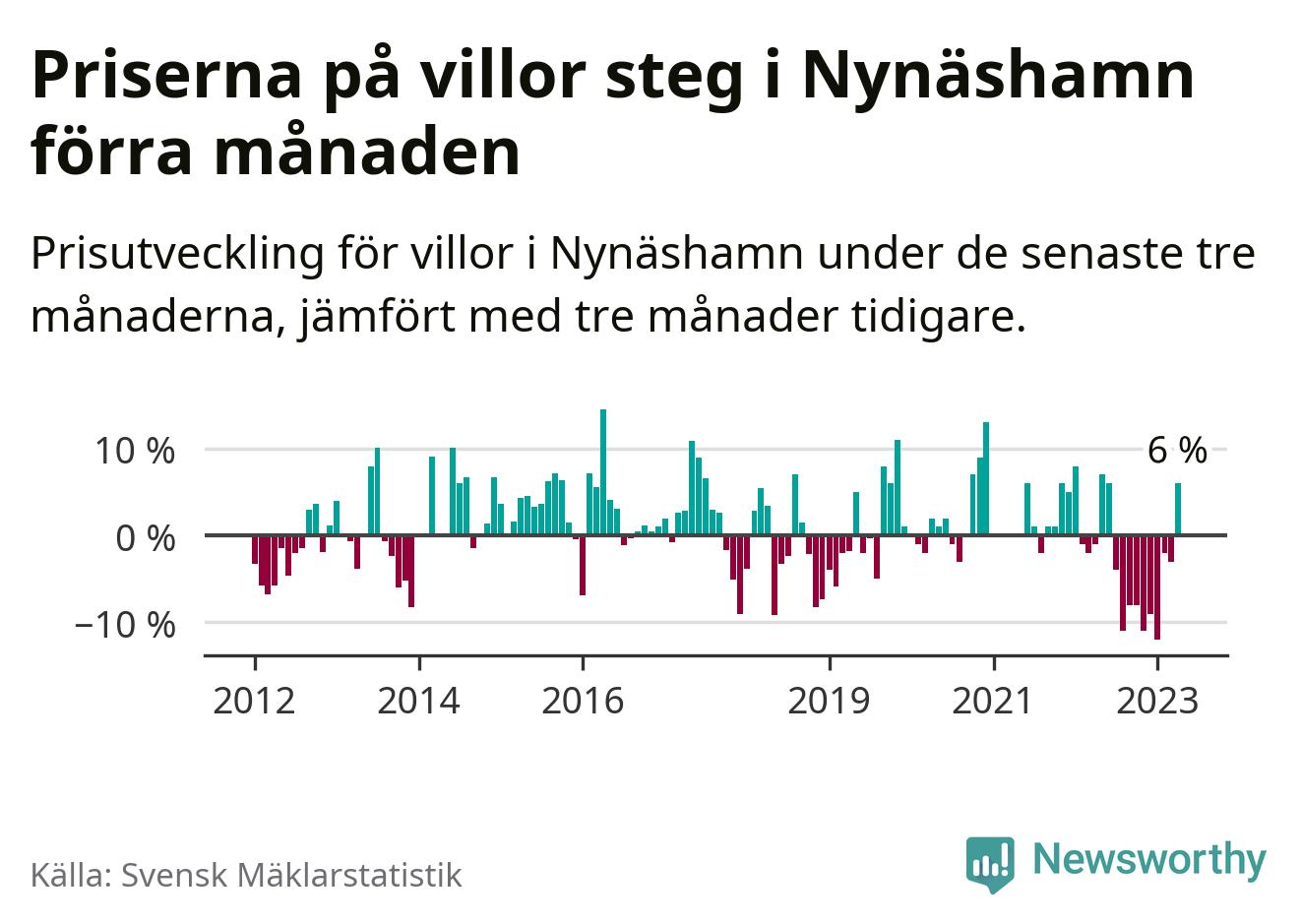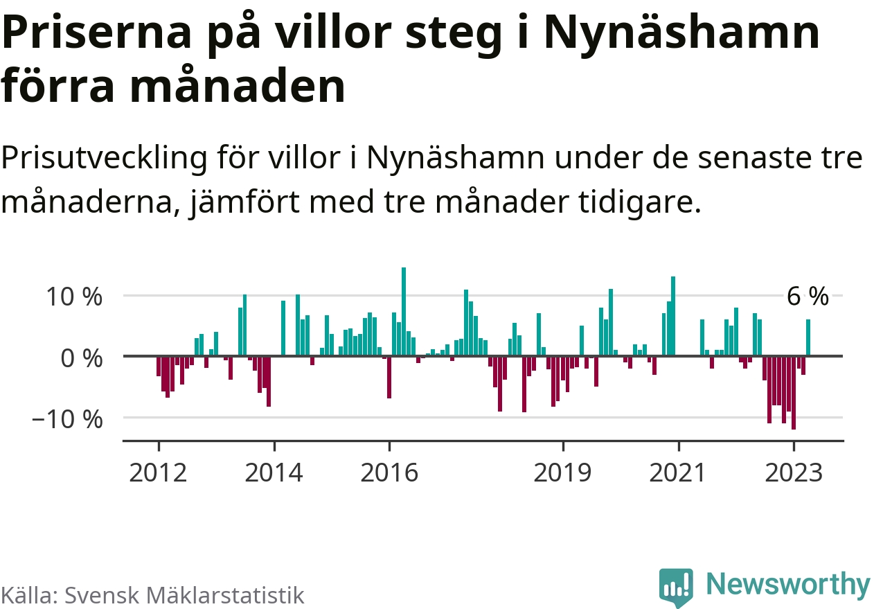 Sedan juni 2022 har villapriserna sjunkit i Nynäshamns kommun, men försäljningarna under de senaste tre månaderna visar på en uppgång med 6 procent.