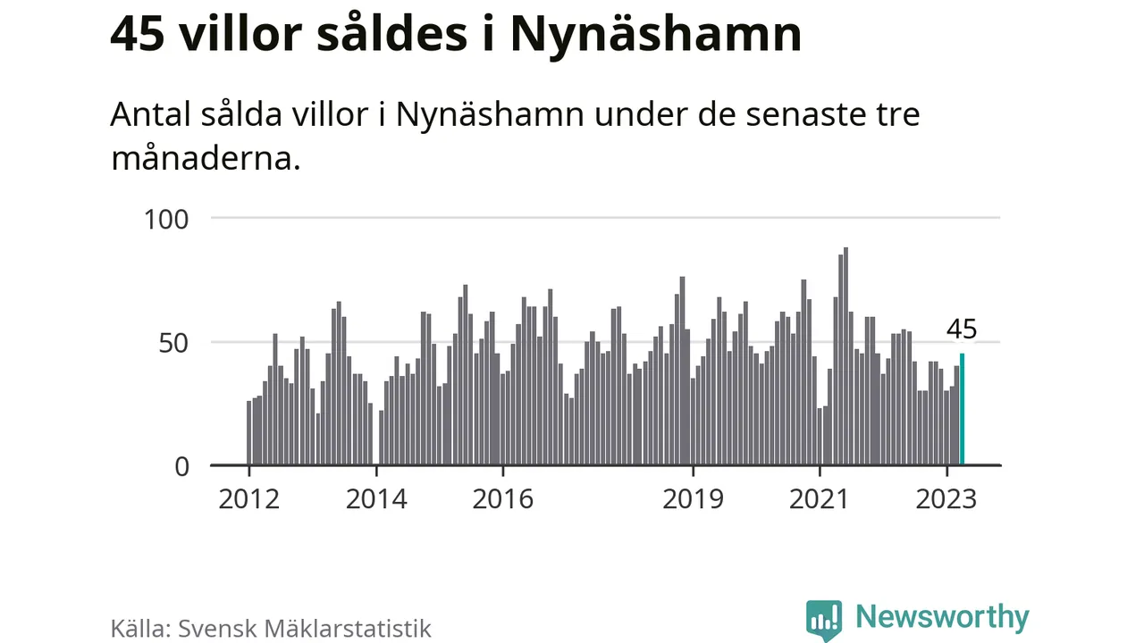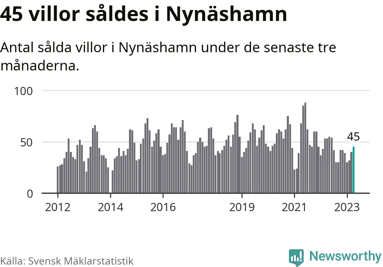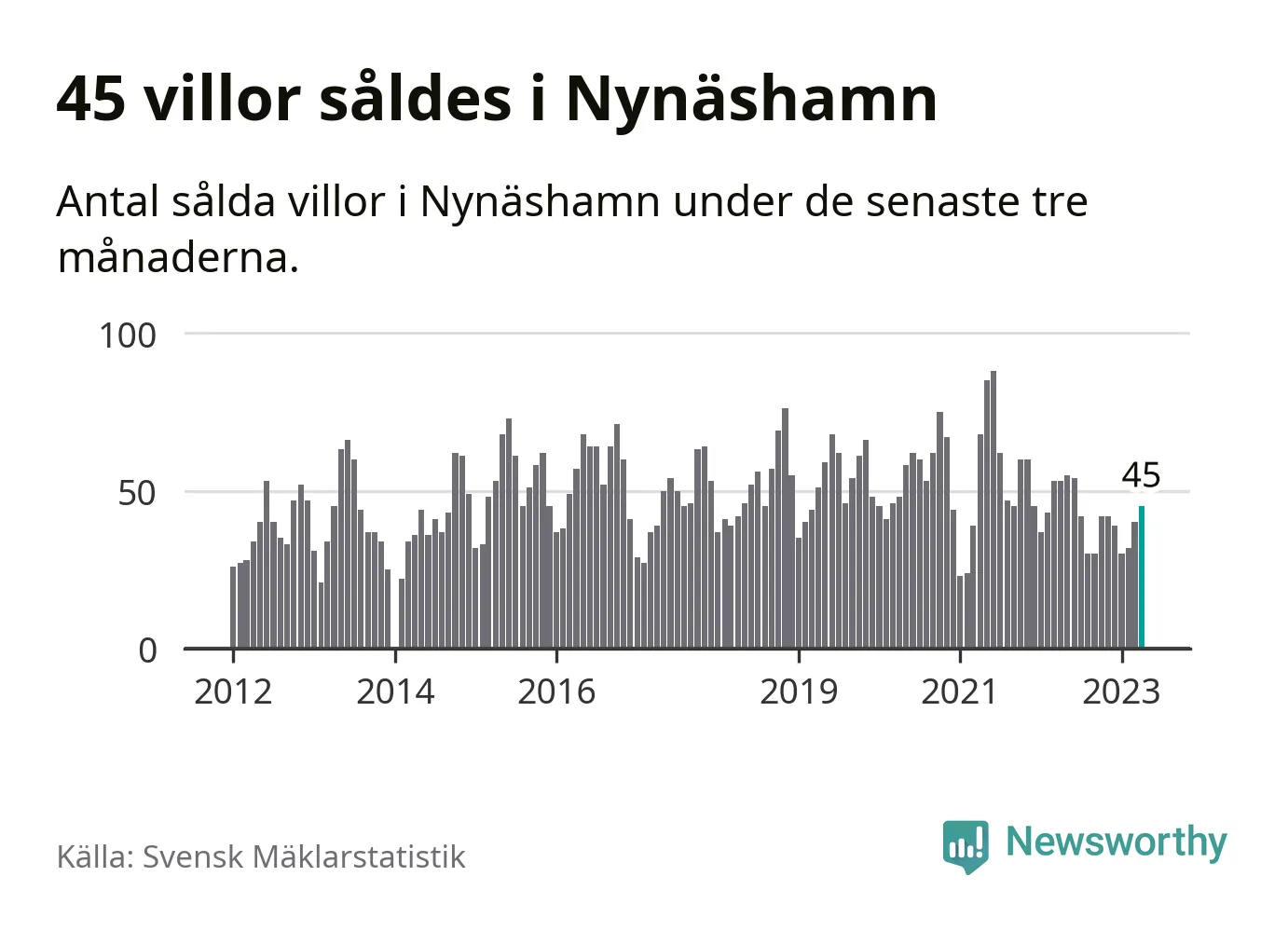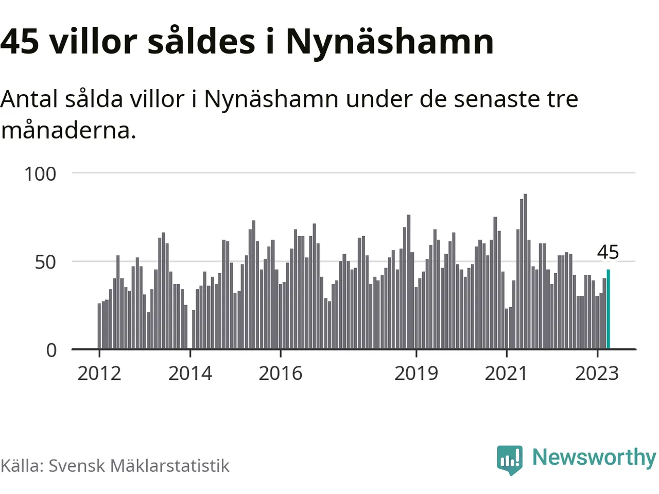 Sammanlagt såldes 45 villor i Nynäshamns kommun mellan februari och april till ett genomsnittligt pris på 4,6 miljoner kronor. I fjol gjordes 53 affärer vid den här tiden på året.