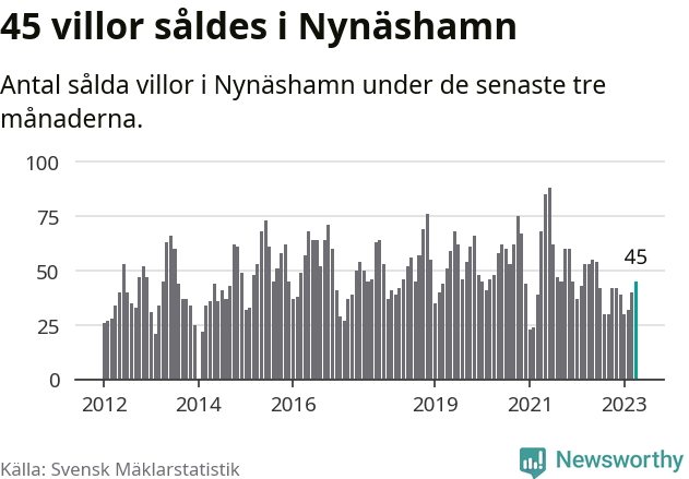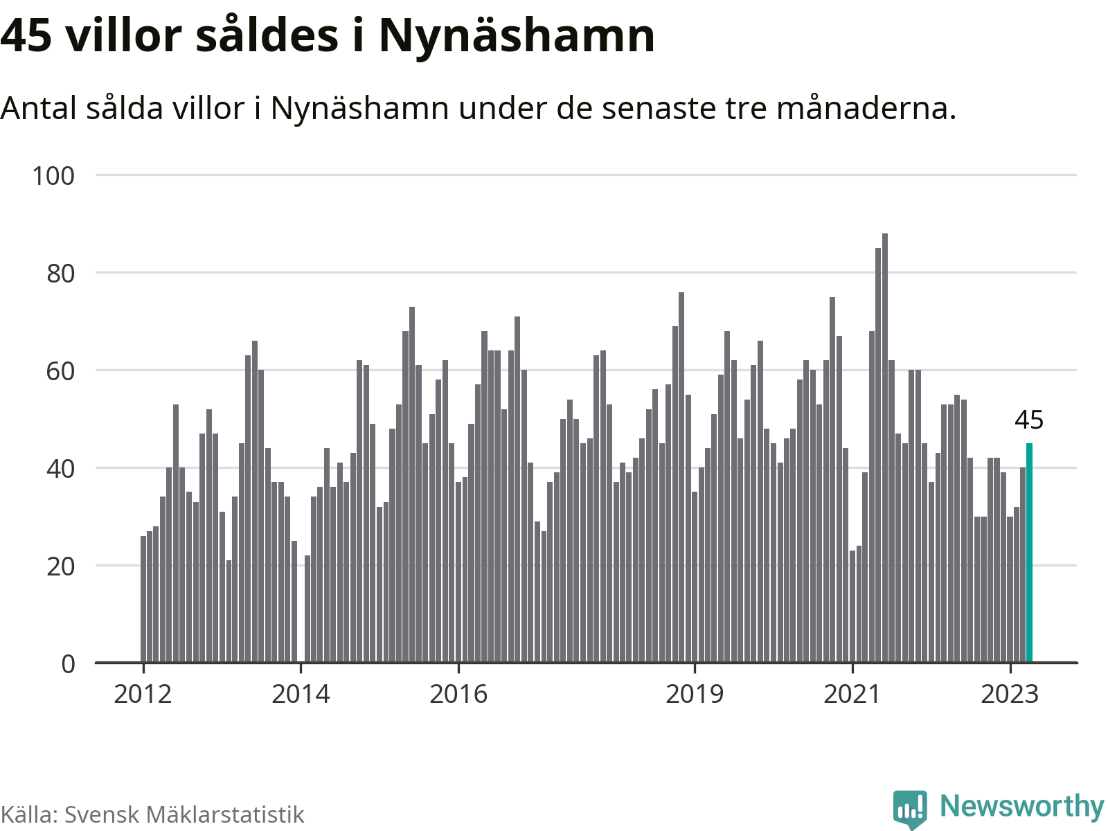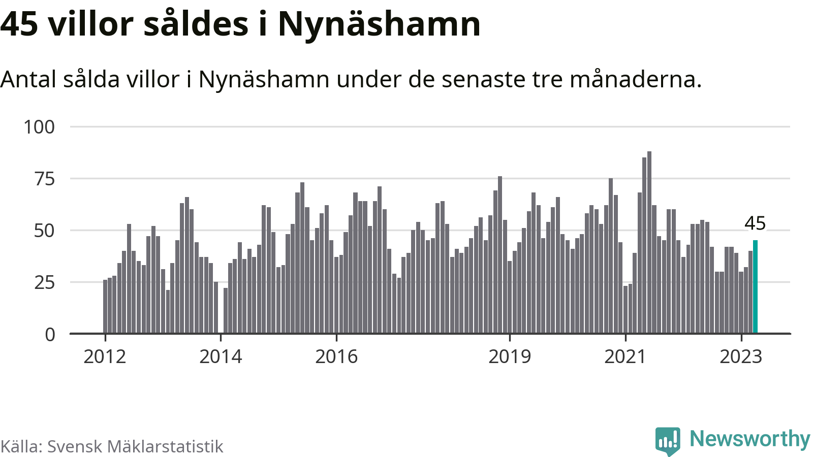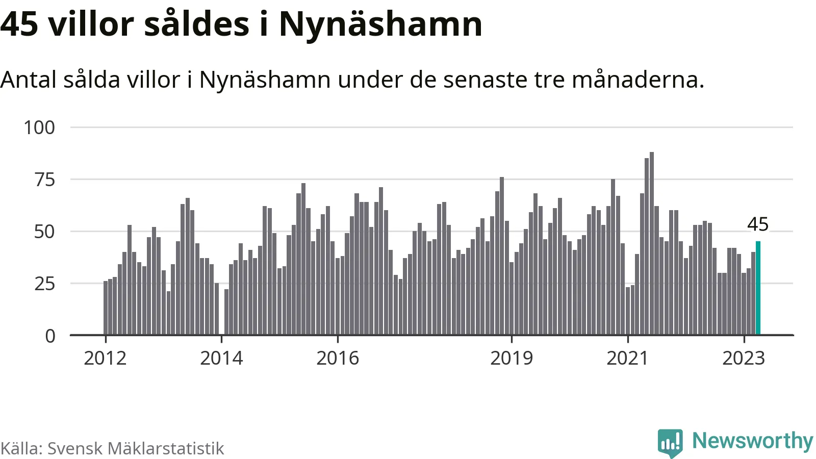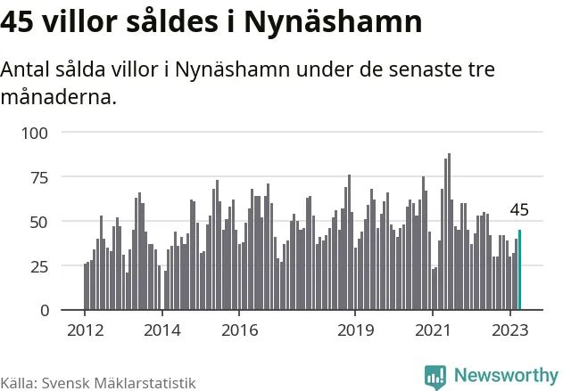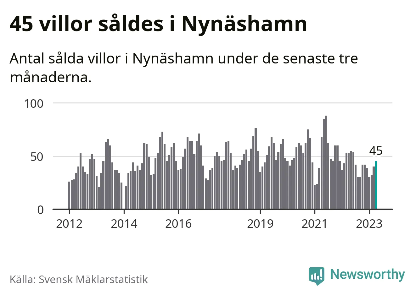 Sammanlagt såldes 45 villor i Nynäshamns kommun mellan februari och april till ett genomsnittligt pris på 4,6 miljoner kronor. I fjol gjordes 53 affärer vid den här tiden på året.