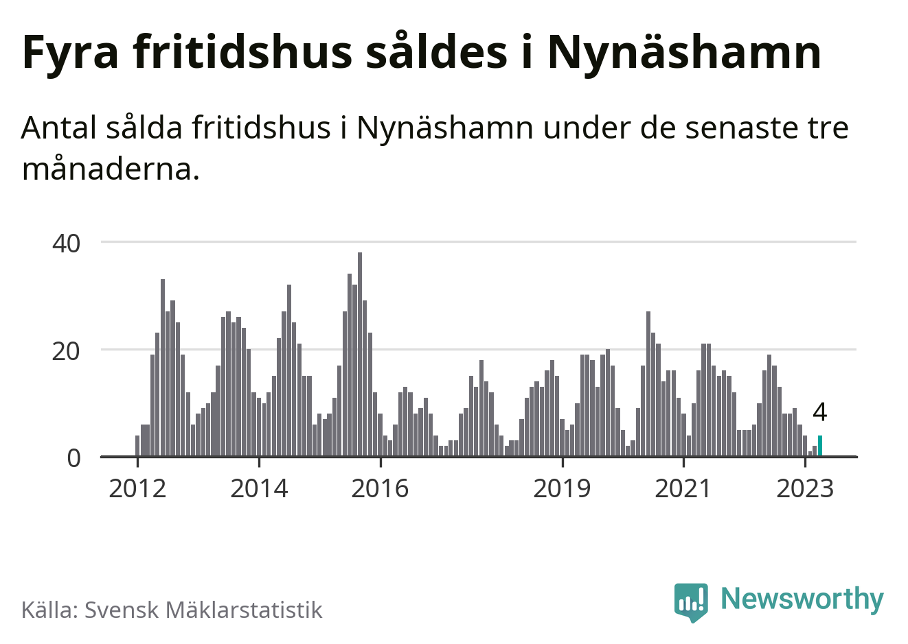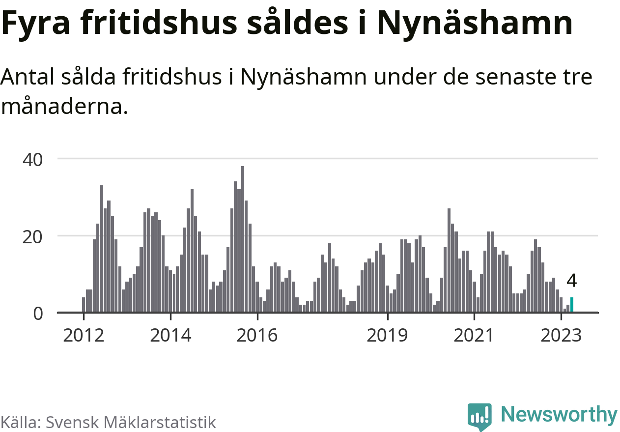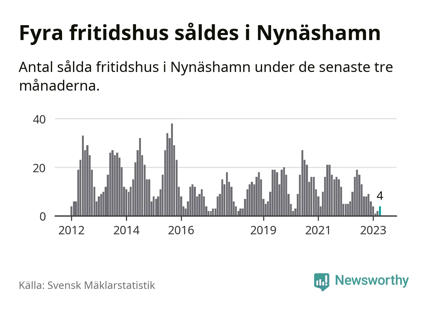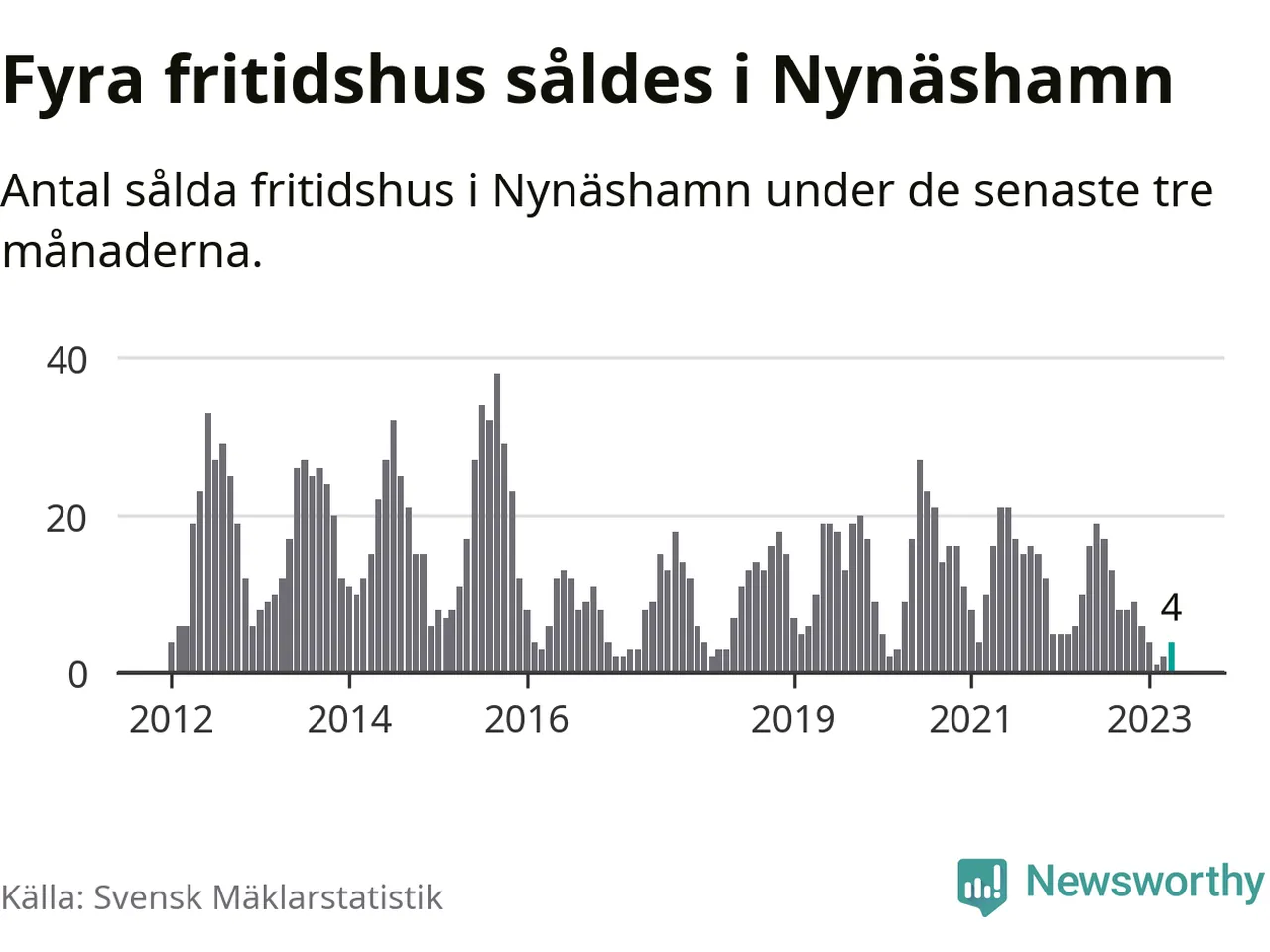 Sammanlagt såldes fyra fritidshus i Nynäshamns kommun mellan februari och april till ett genomsnittligt pris på 2,5 miljoner kronor. I fjol gjordes tio affärer vid den här tiden på året.