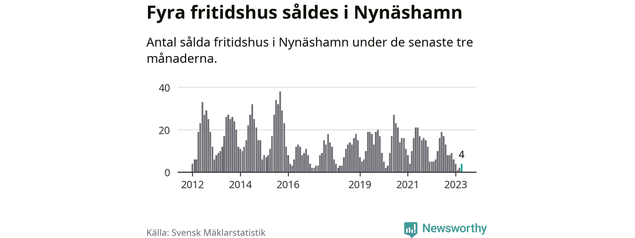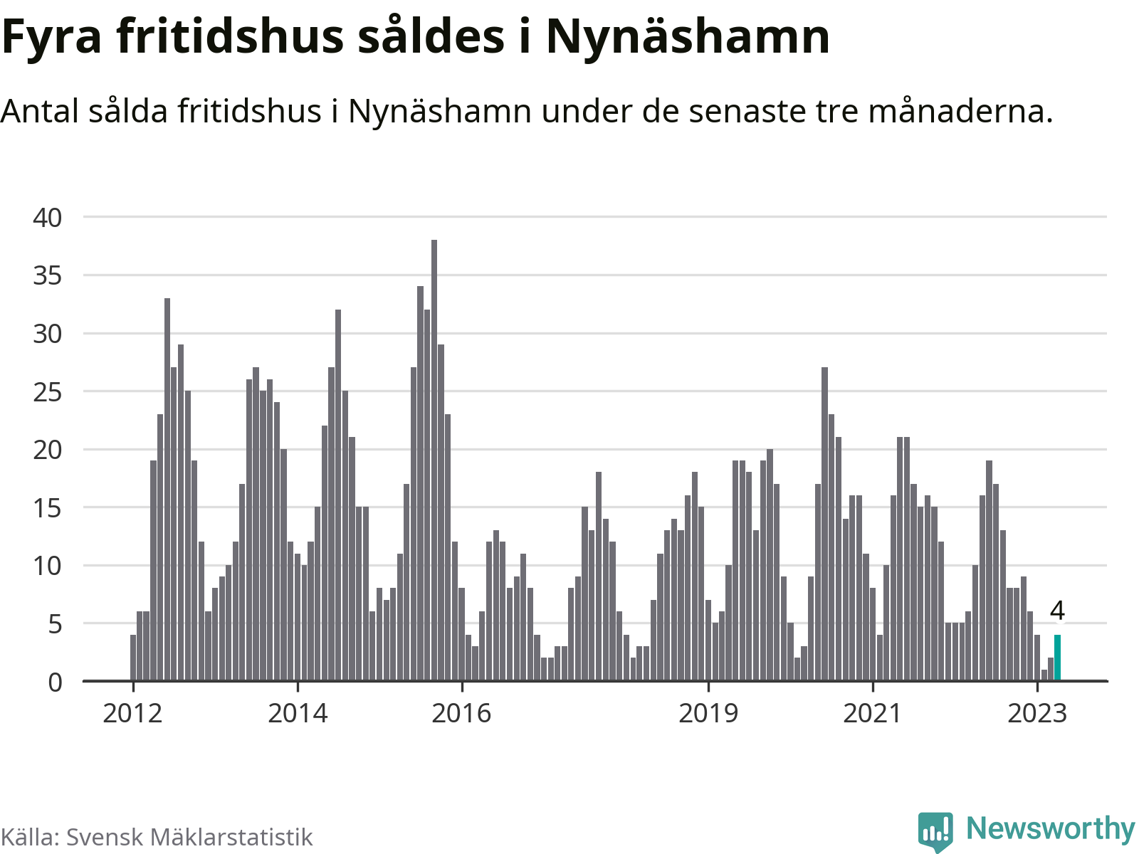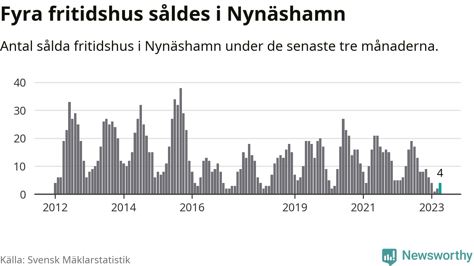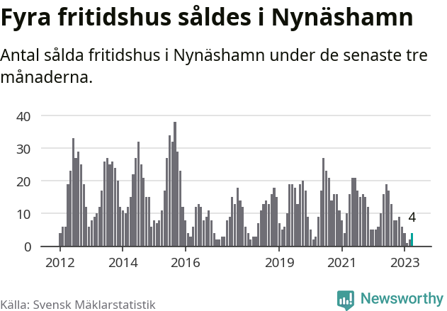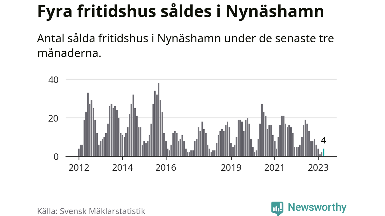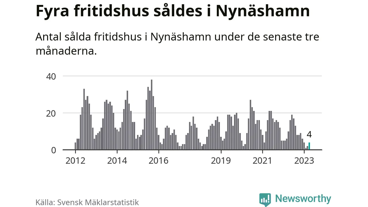 Sammanlagt såldes fyra fritidshus i Nynäshamns kommun mellan februari och april till ett genomsnittligt pris på 2,5 miljoner kronor. I fjol gjordes tio affärer vid den här tiden på året.