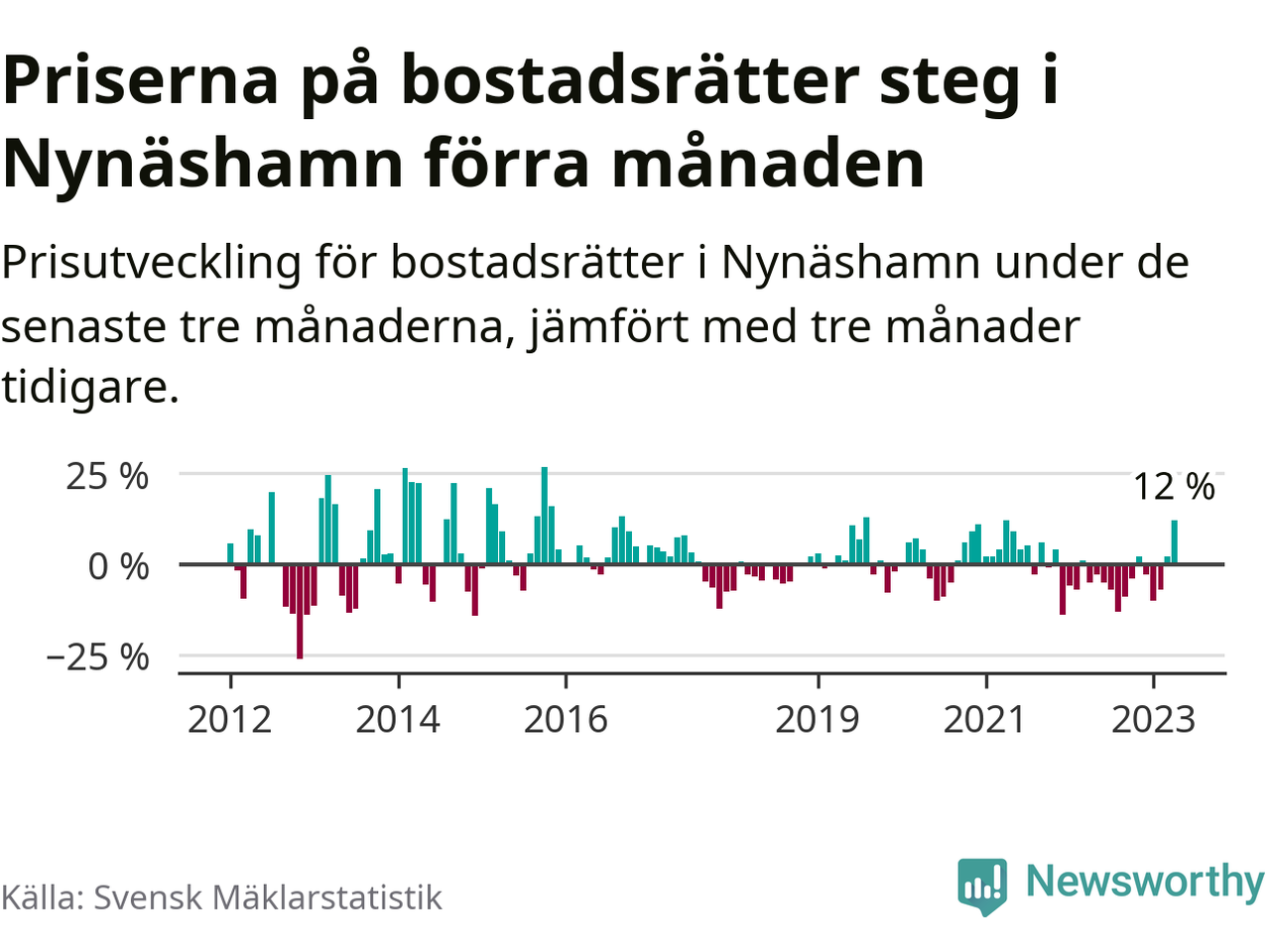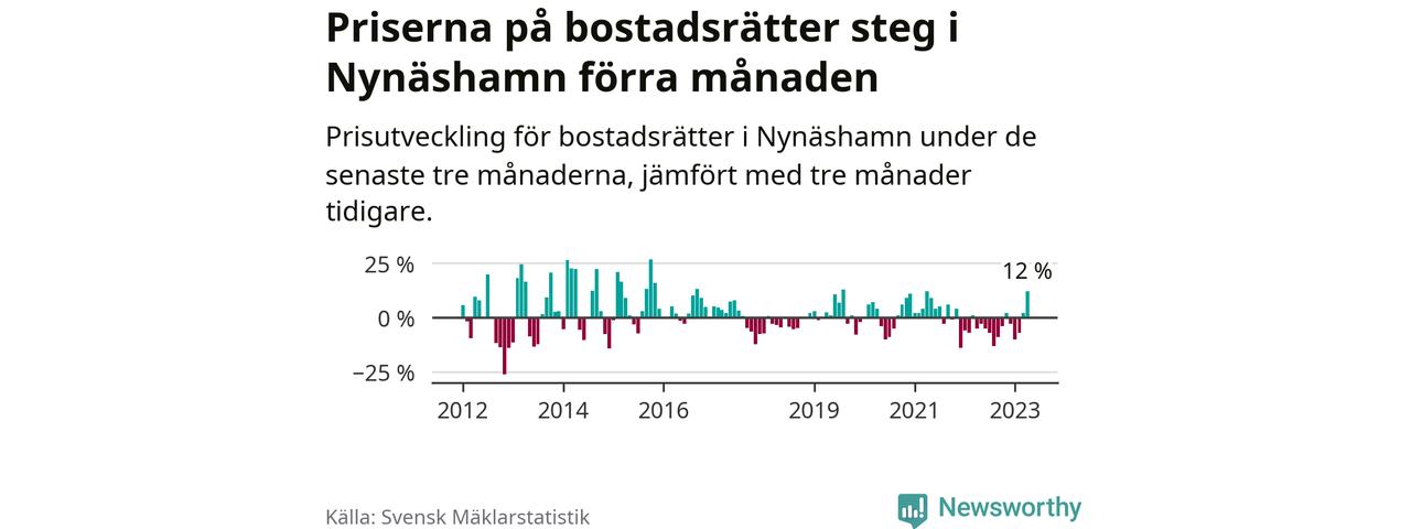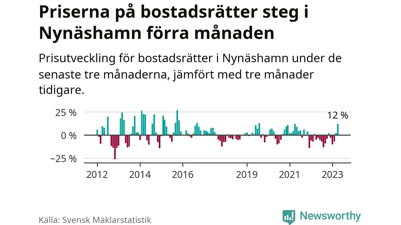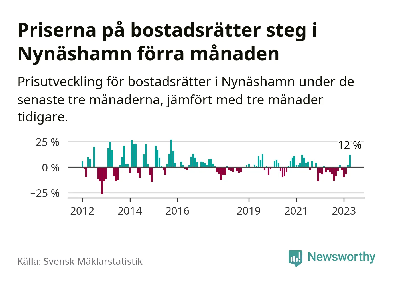 Priserna på bostadsrätter steg mellan februari och april med 12 procent i Nynäshamns kommun. Det är en betydande uppgång jämfört med det gångna året då priserna i snitt sjunkit med 4 procent.