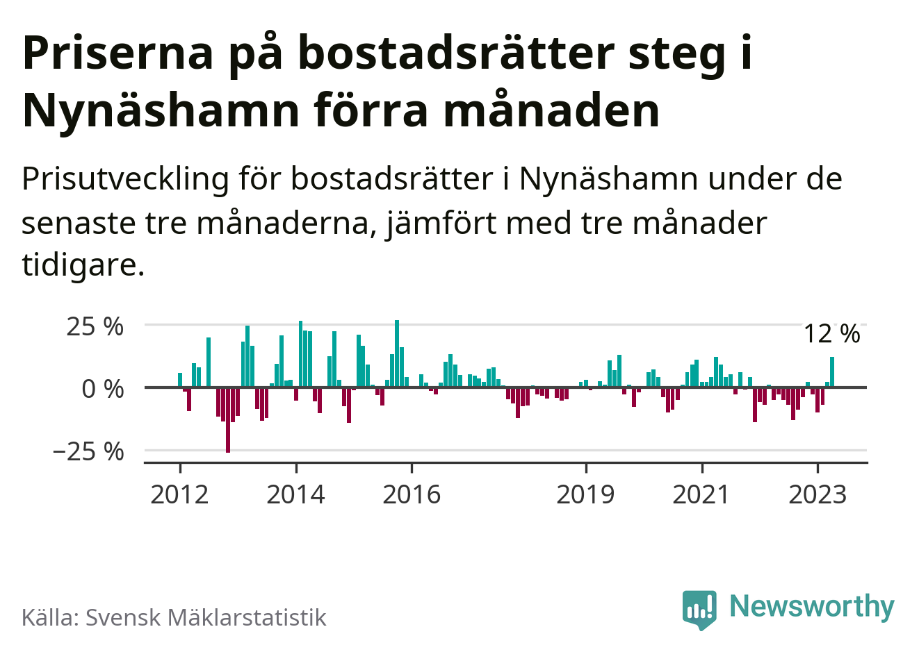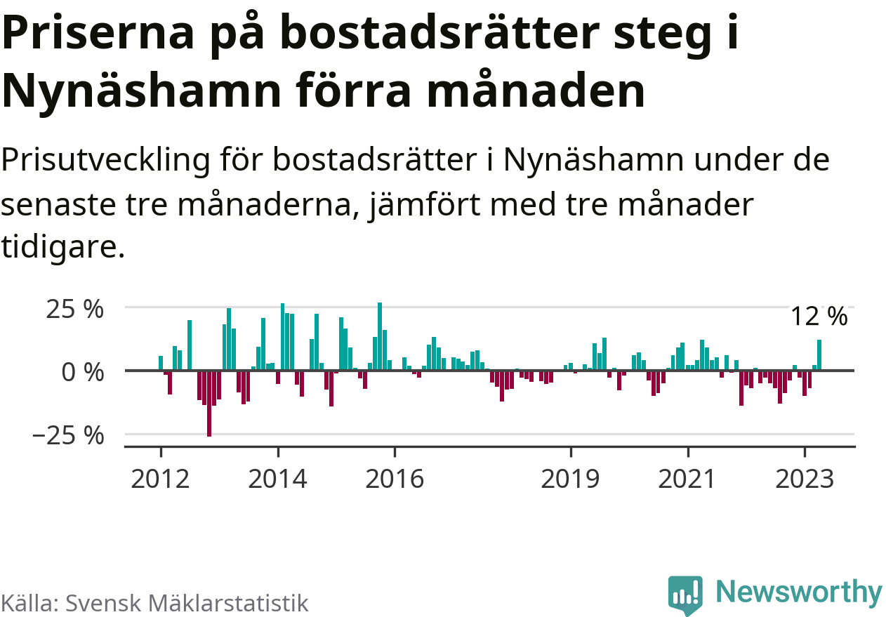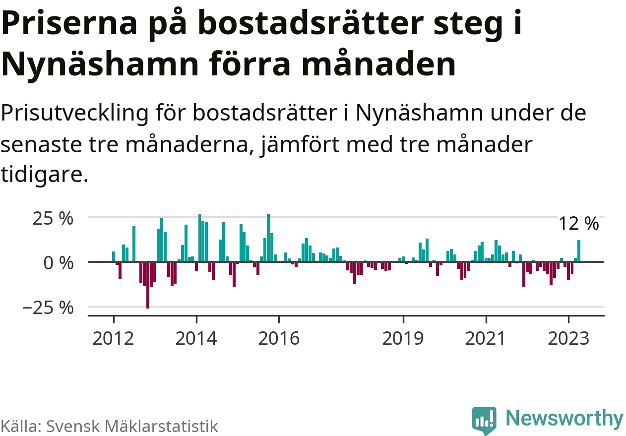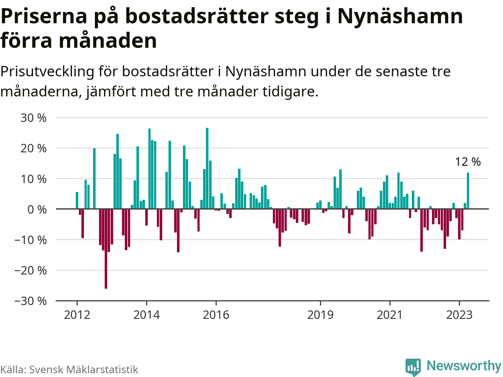 Priserna på bostadsrätter steg mellan februari och april med 12 procent i Nynäshamns kommun. Det är en betydande uppgång jämfört med det gångna året då priserna i snitt sjunkit med 4 procent.