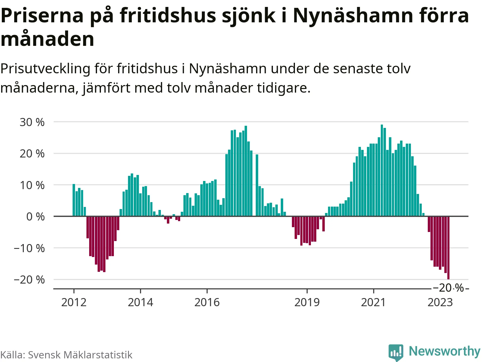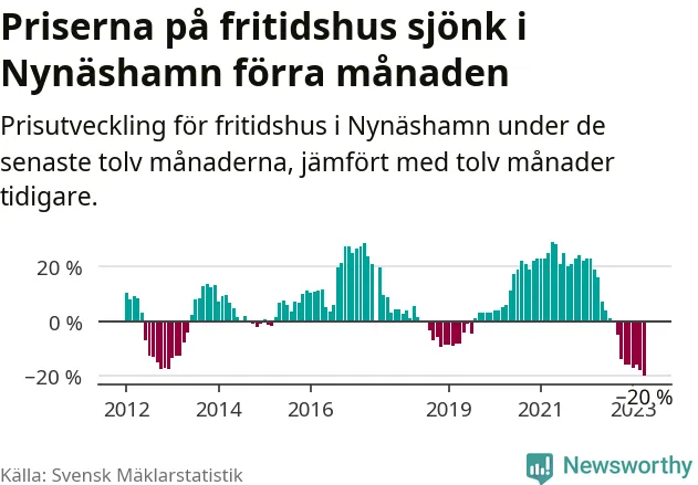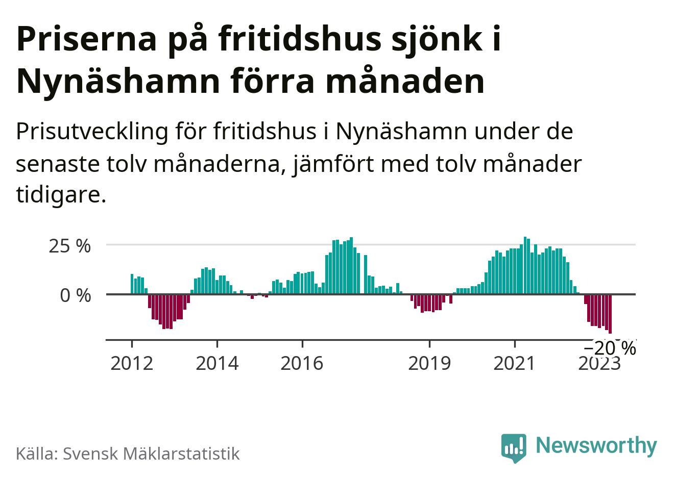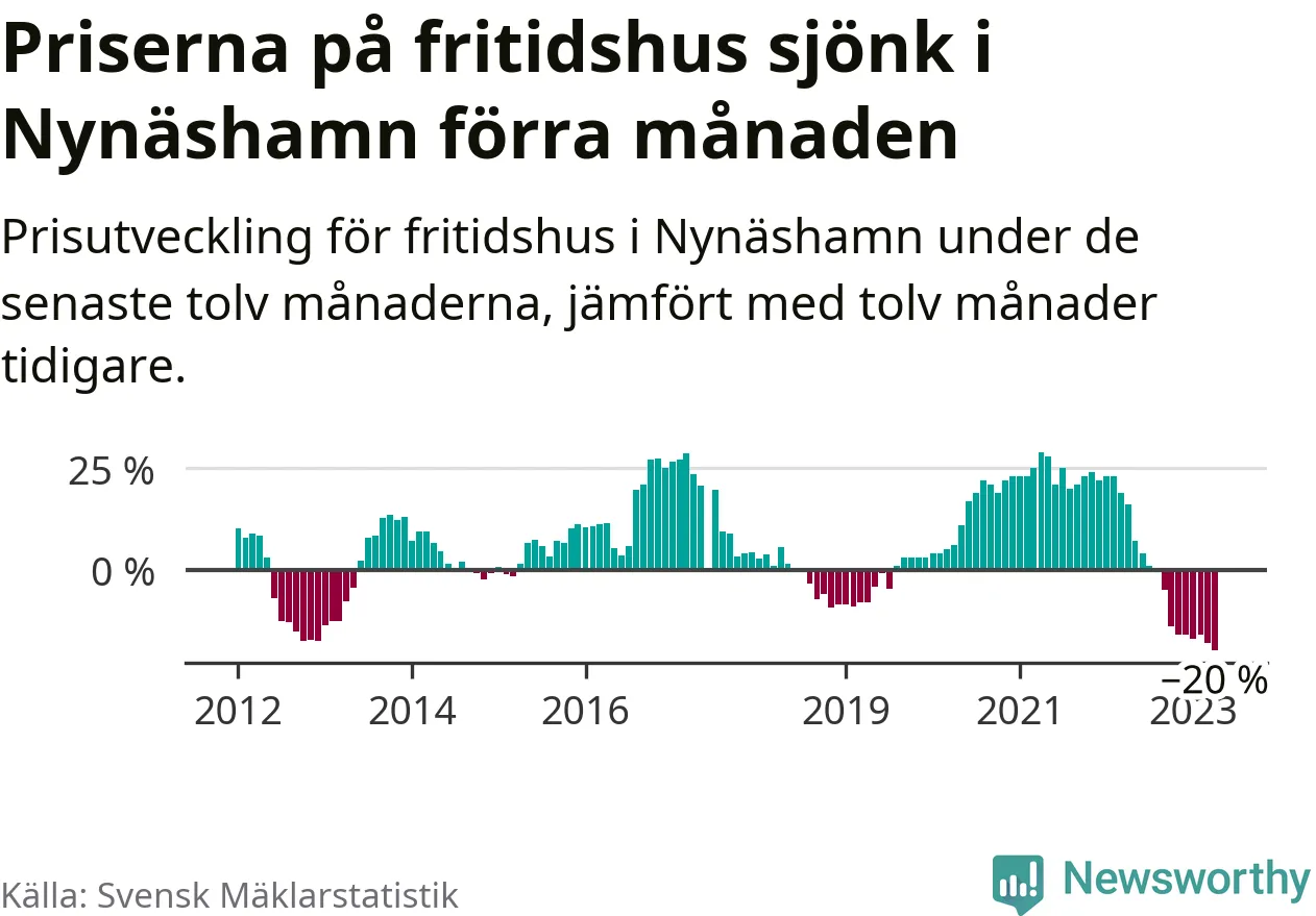 Priserna på fritidshus har gått ner i Nynäshamns kommun. Medelpriset på försäljningarna under de senaste tolv månaderna visar på en nedgång med 20 procent.