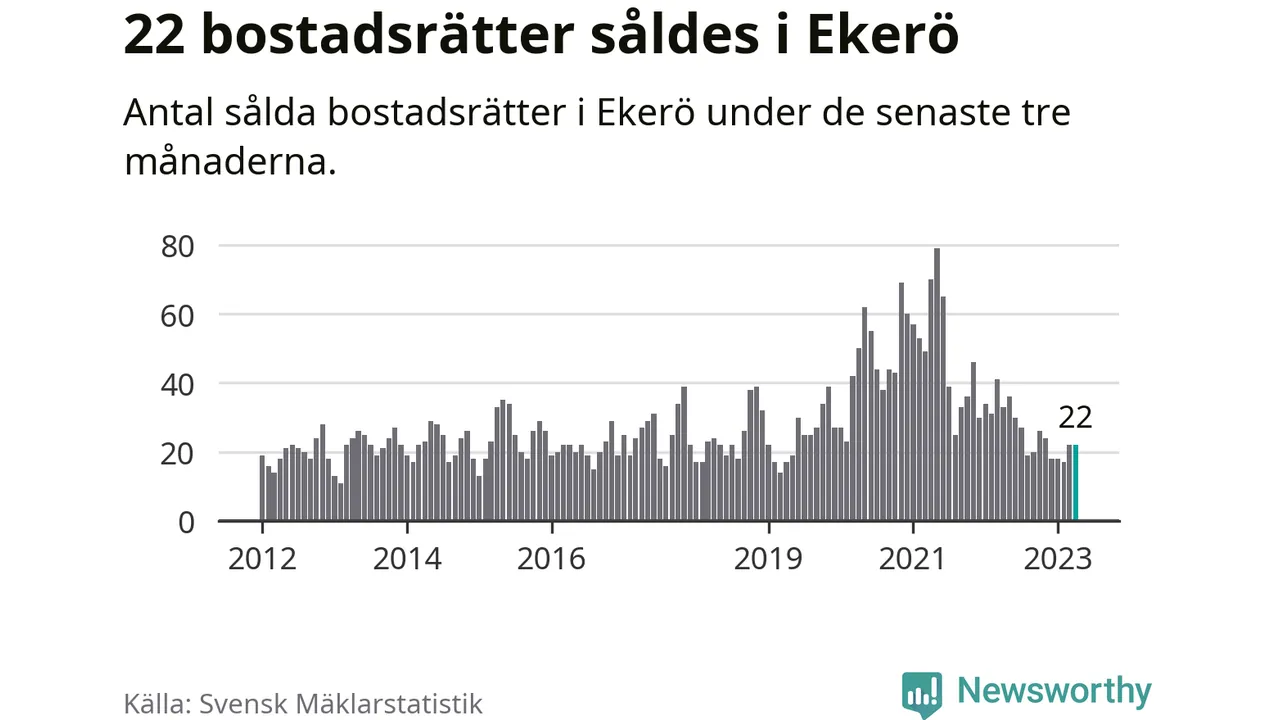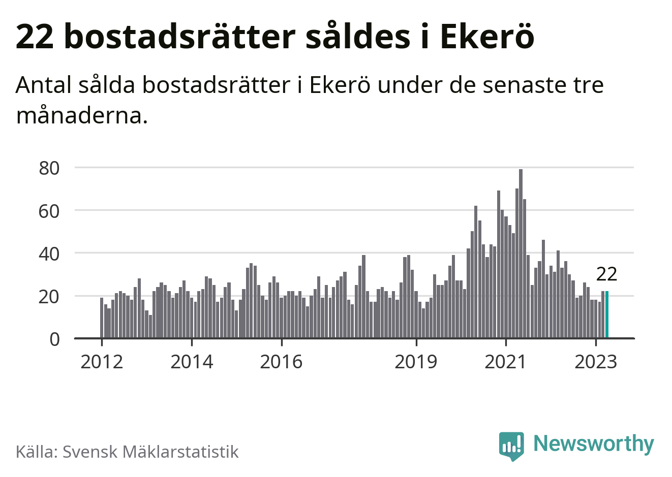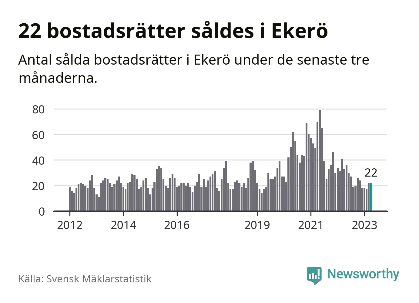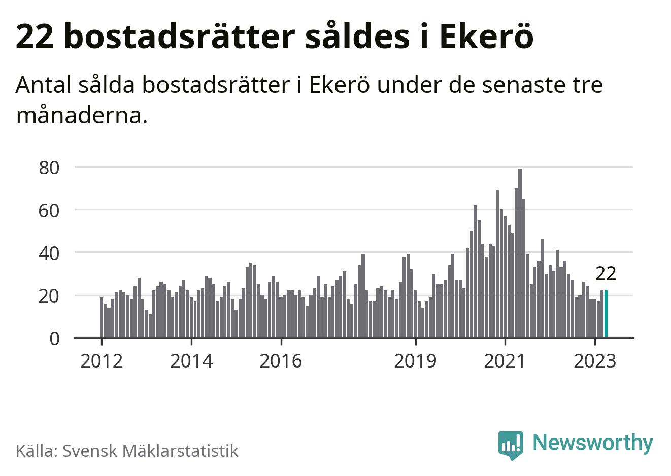 Mellan februari och april gjordes sammanlagt 22 affärer med bostadsrätter i Ekerö kommun. Det kan jämföras med 33 vid motsvarande tid i fjol.