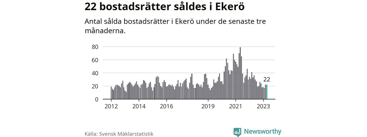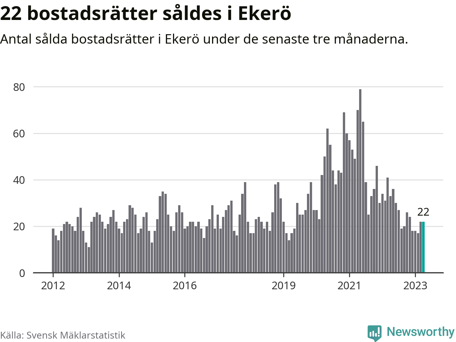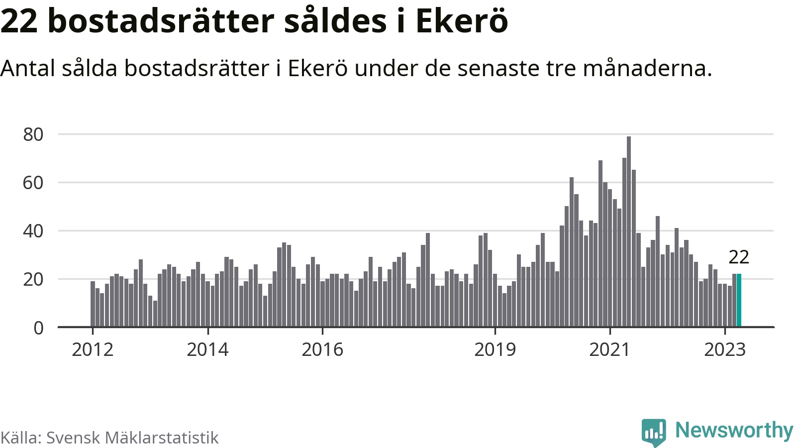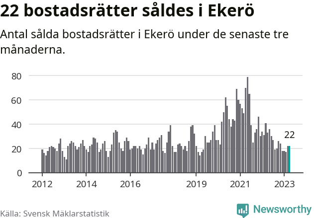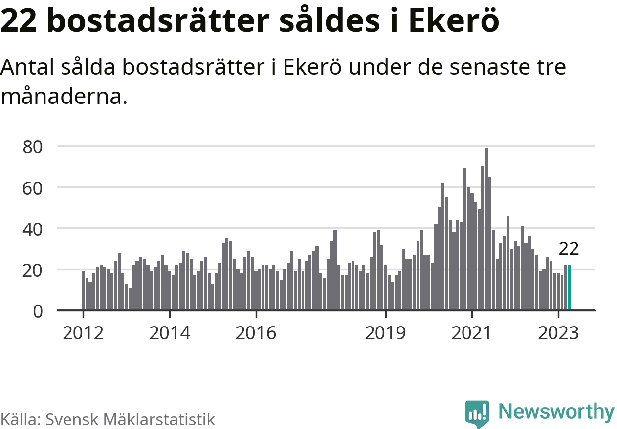 Mellan februari och april gjordes sammanlagt 22 affärer med bostadsrätter i Ekerö kommun. Det kan jämföras med 33 vid motsvarande tid i fjol.