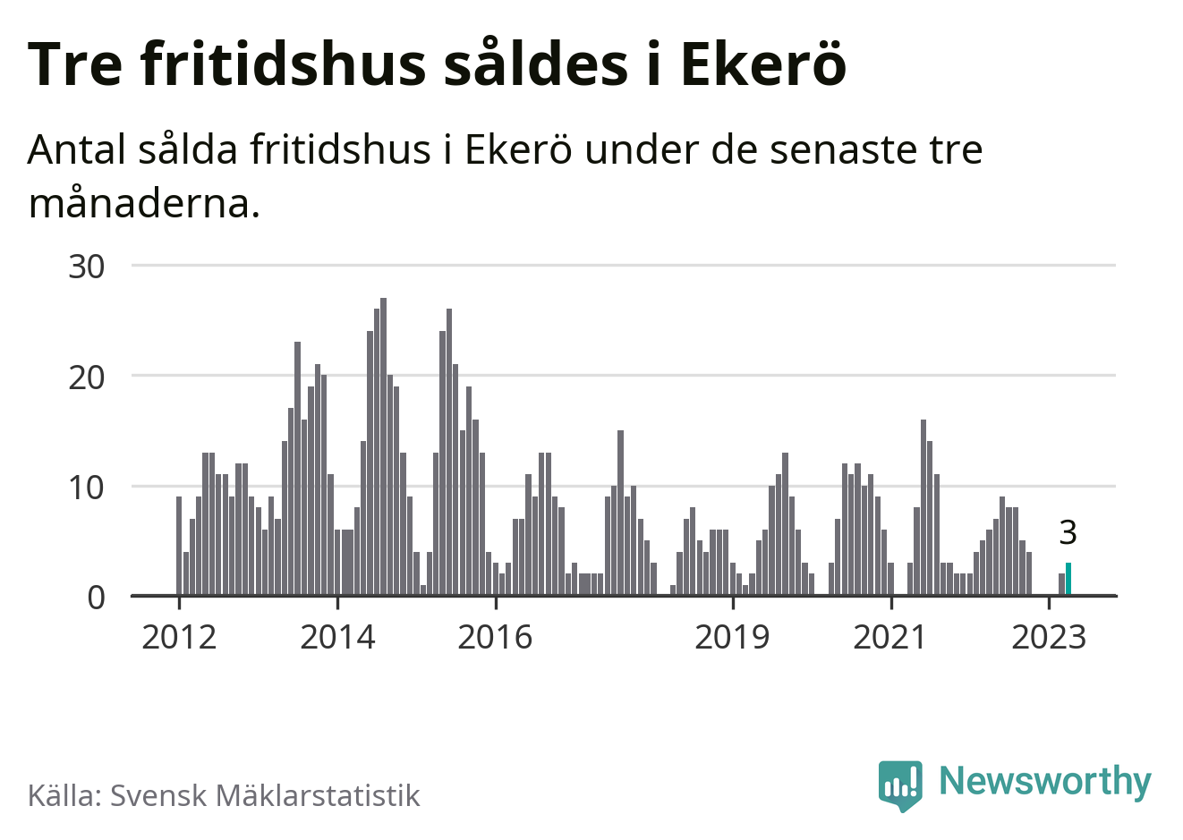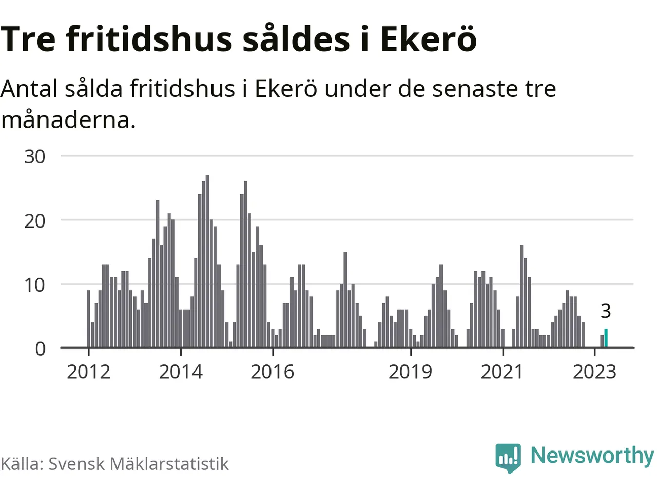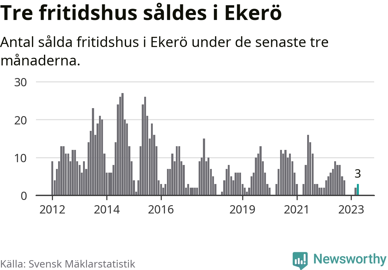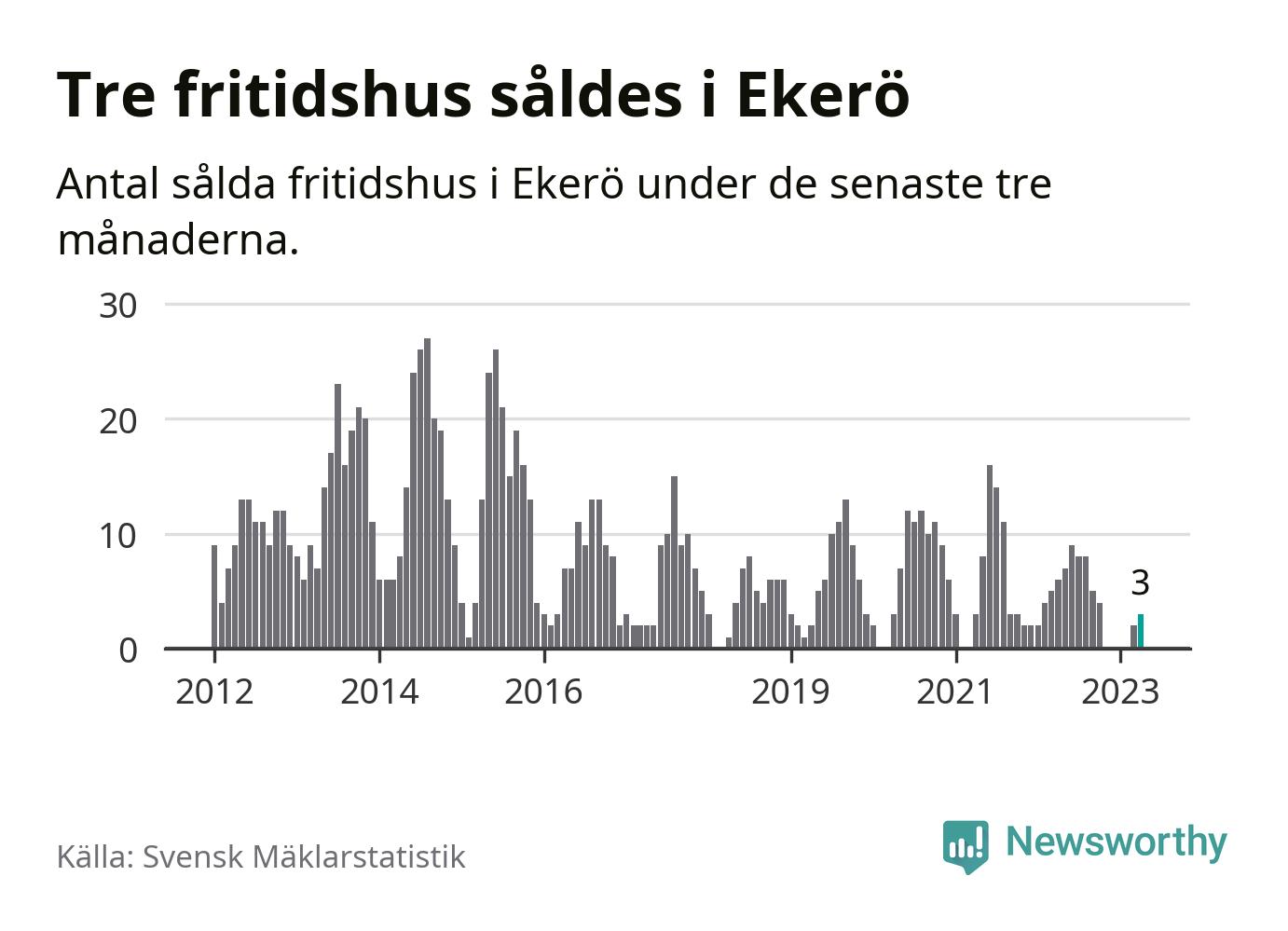 Mellan februari och april gjordes sammanlagt tre affärer med fritidshus i Ekerö kommun. Det kan jämföras med sex vid motsvarande tid i fjol.