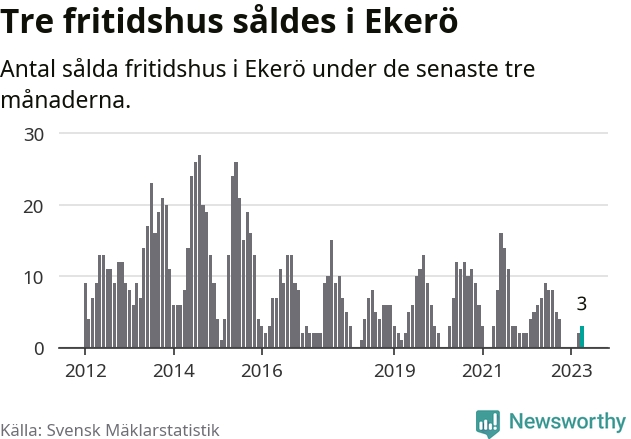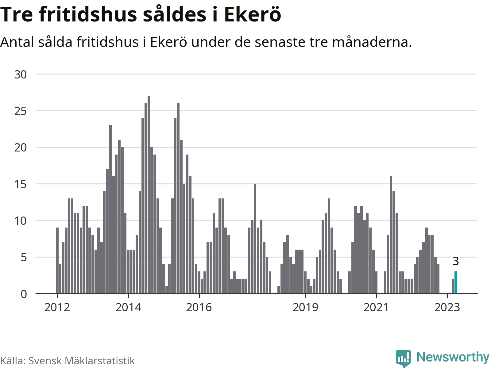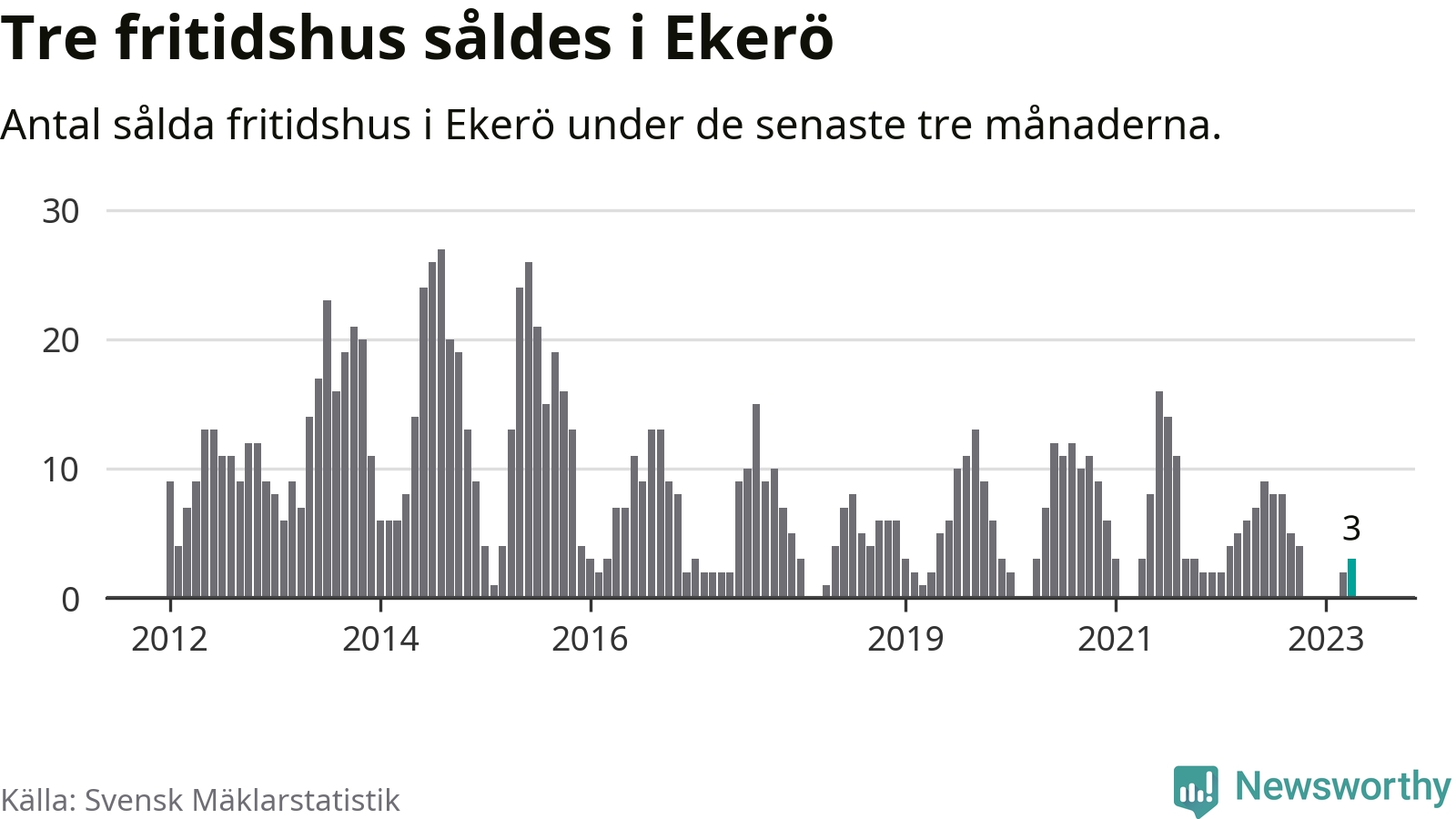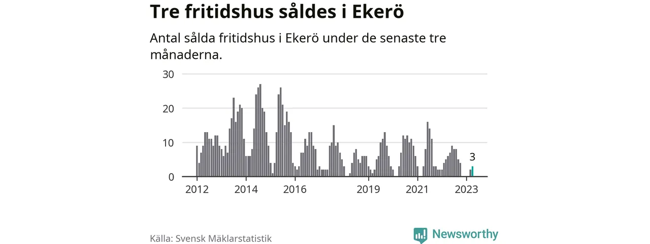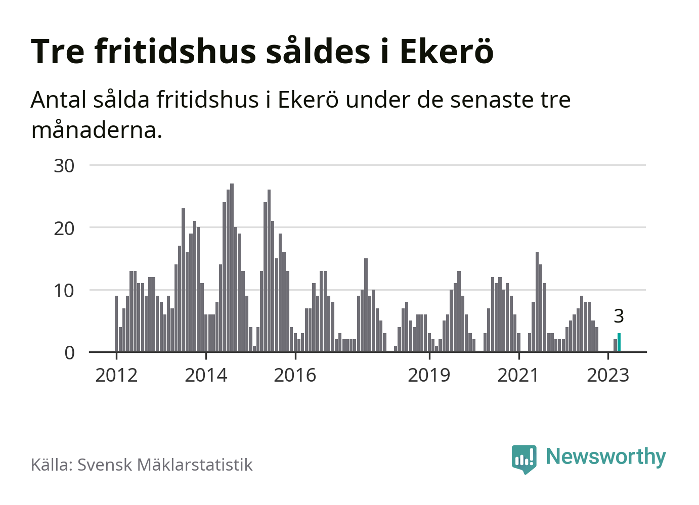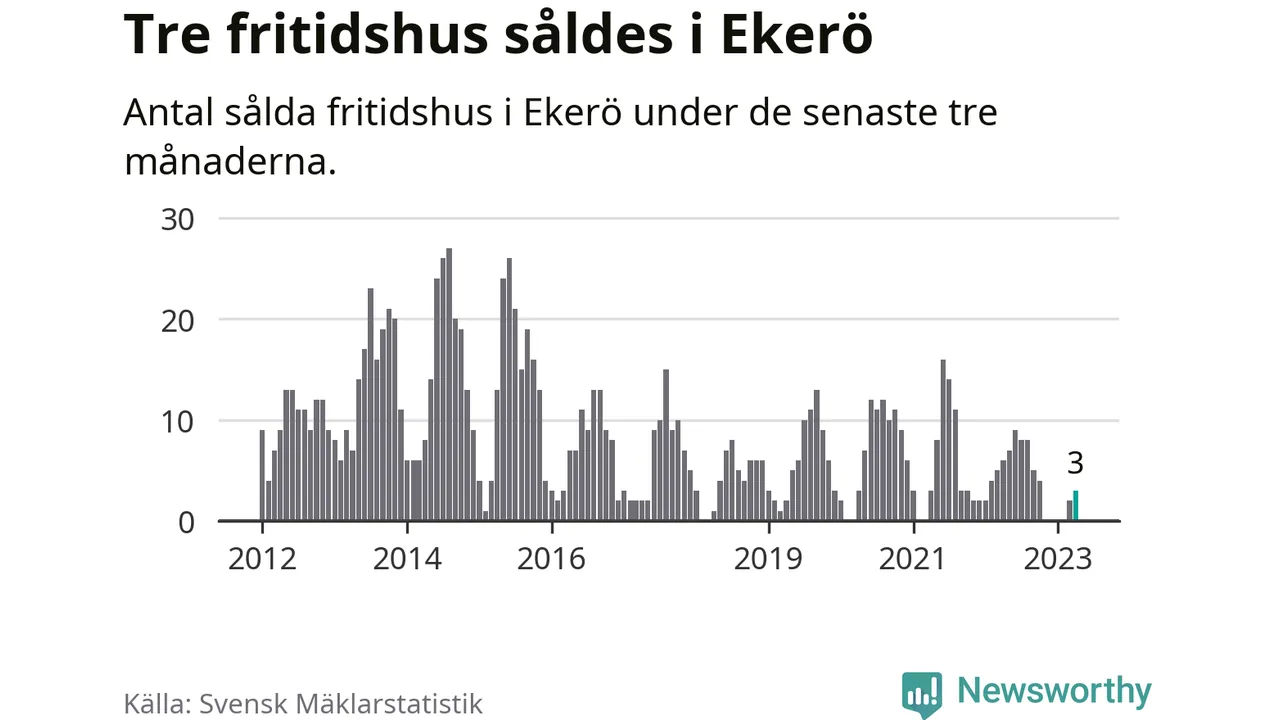 Mellan februari och april gjordes sammanlagt tre affärer med fritidshus i Ekerö kommun. Det kan jämföras med sex vid motsvarande tid i fjol.