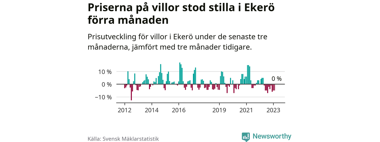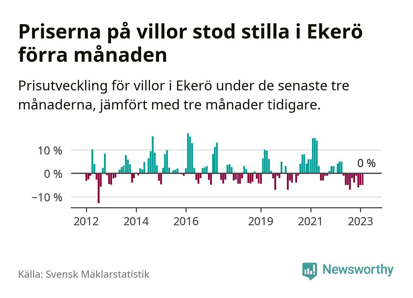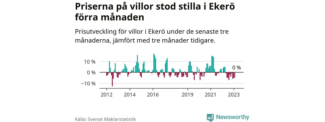 Medelpriset på försäljningarna i Ekerö kommun låg på i stort sett samma nivå som för tre månader sedan. I hela Stockholms län däremot ökar villapriserna. I hela länet noterades en prisuppgång på 3 procent.