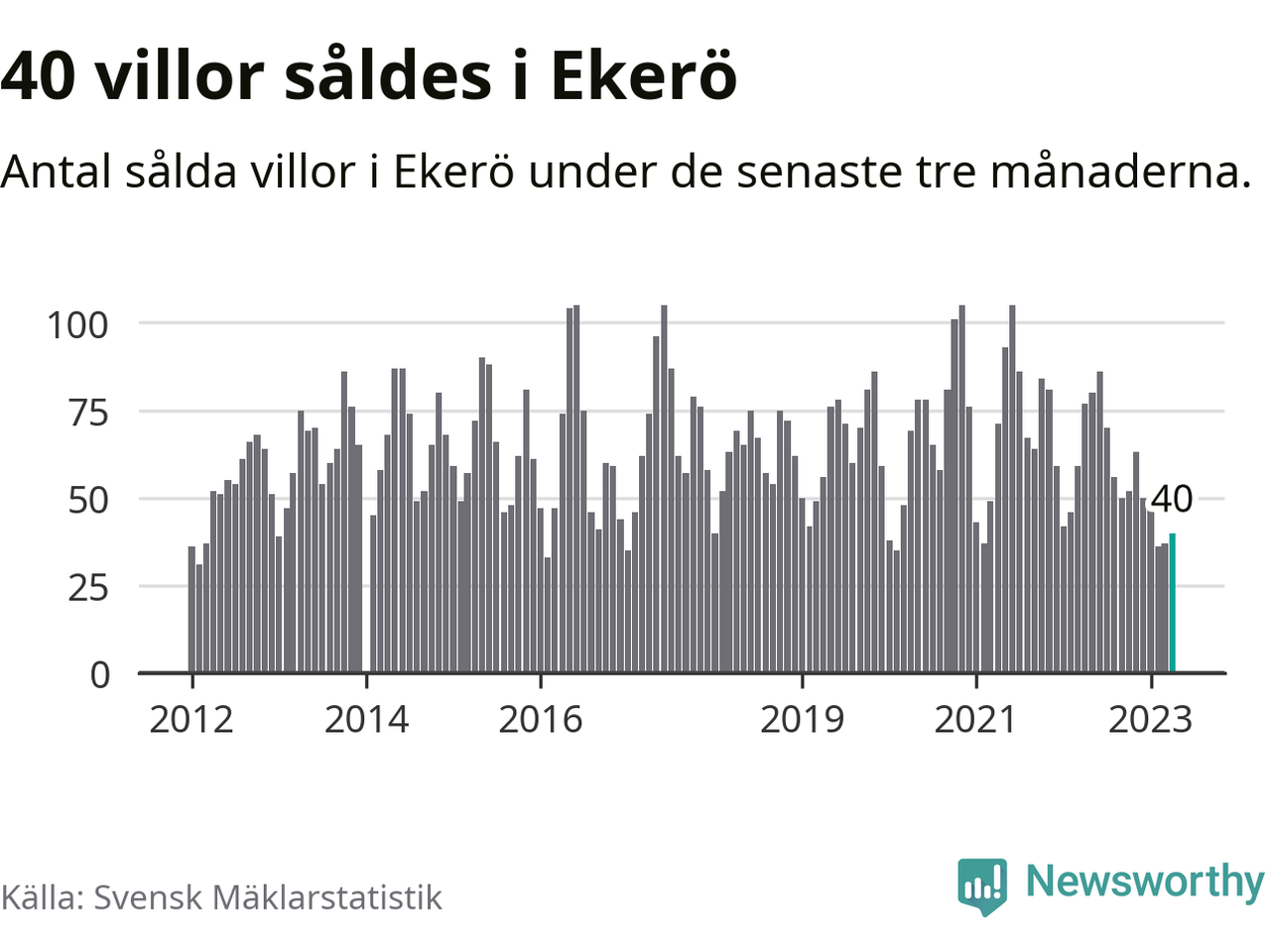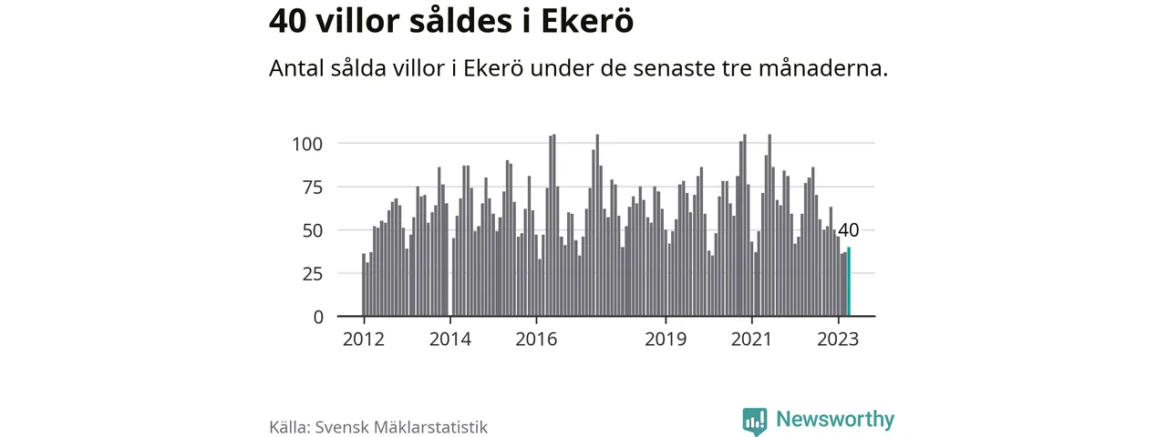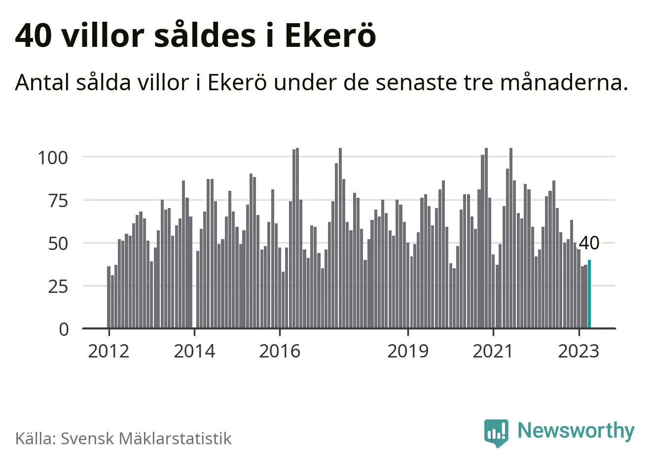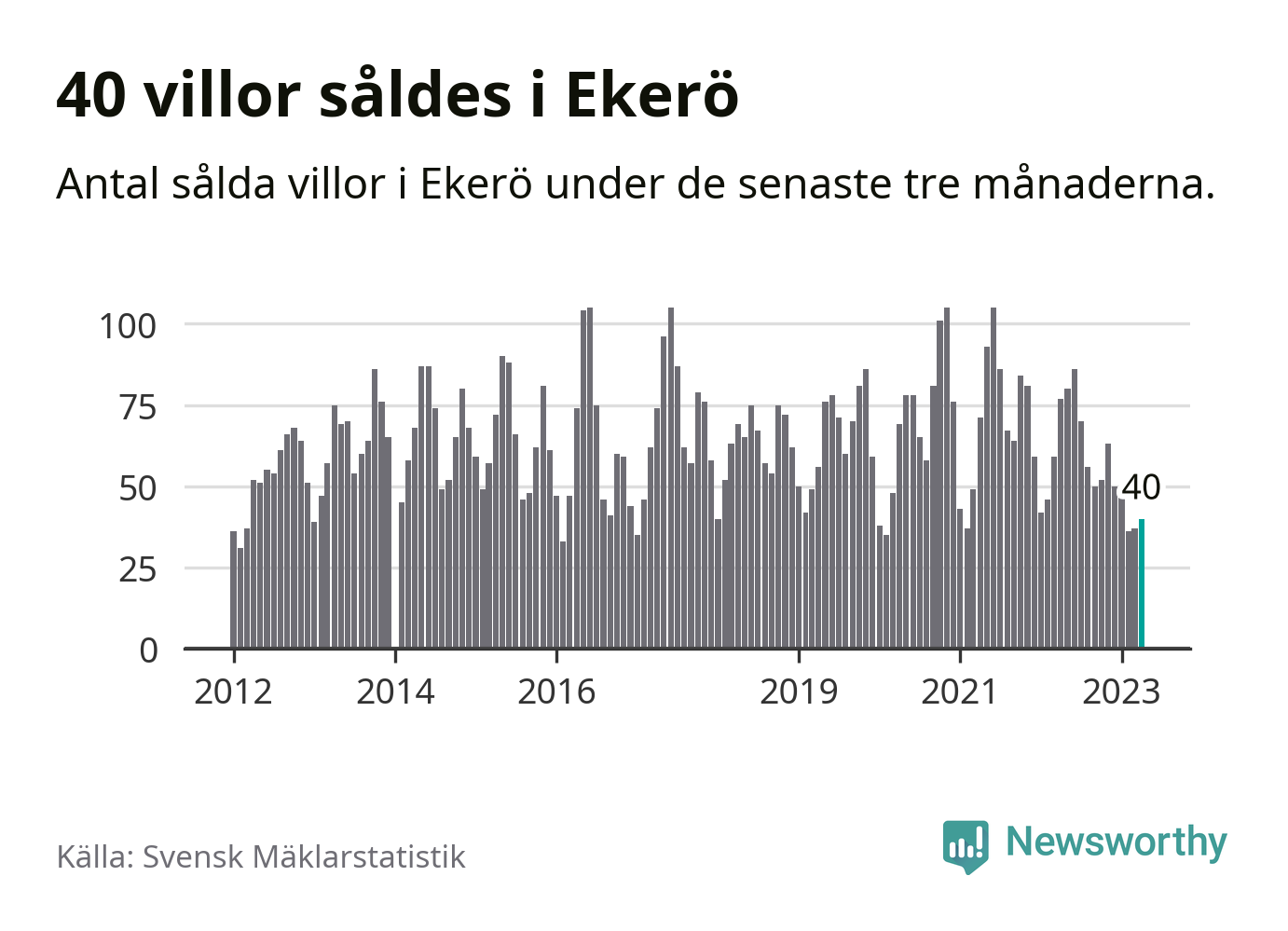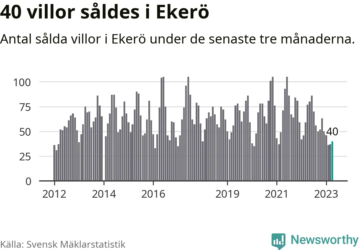 Mellan februari och april såldes 40 villor i Ekerö kommun. Det är relativt få sett till aktiviteten på bostadsmarknaden i kommunen under de senaste tolv månaderna, samt det historiska snittet för den här tiden på året.