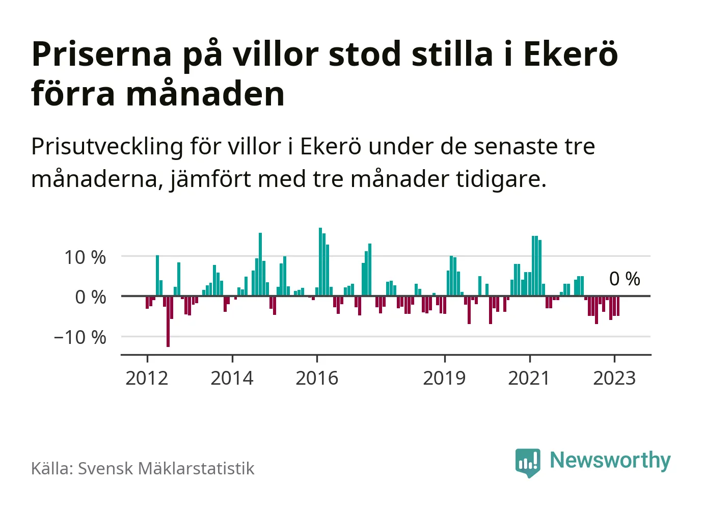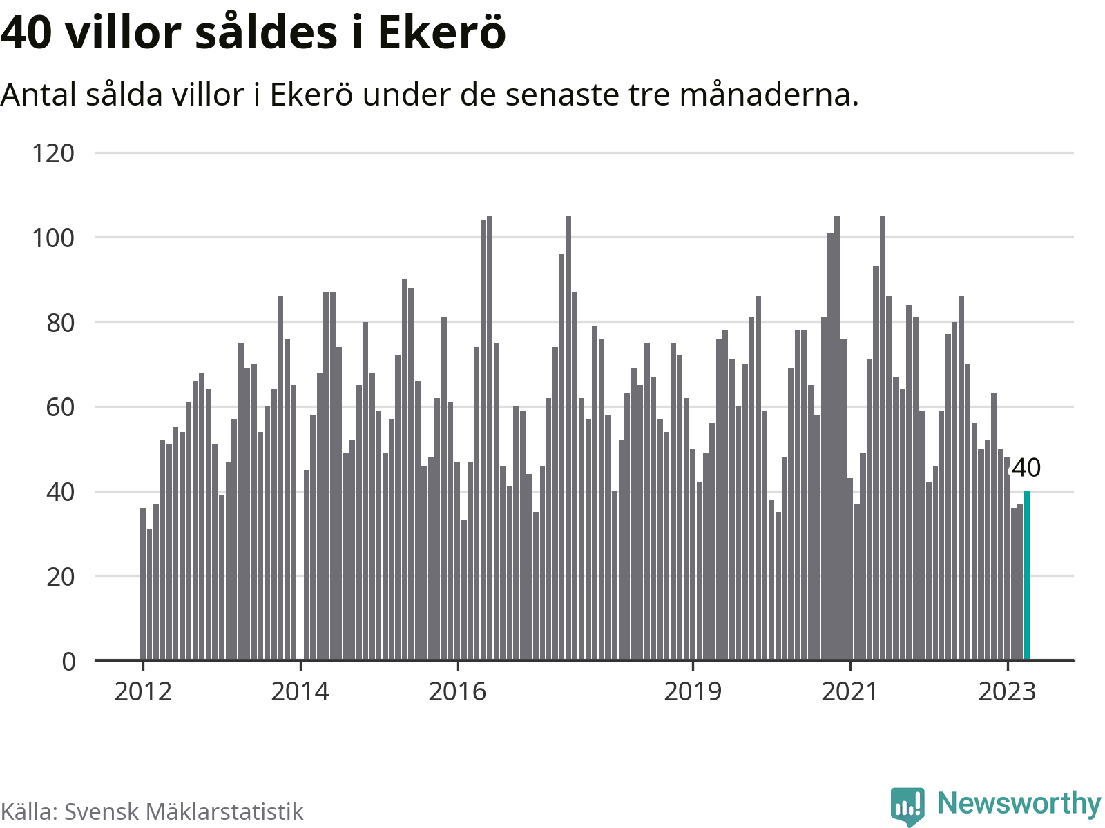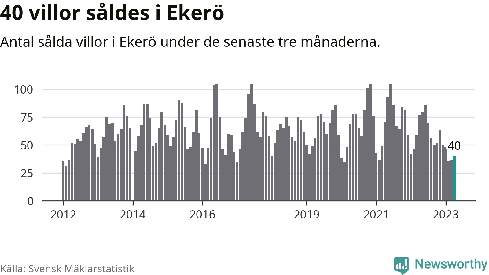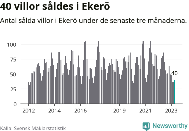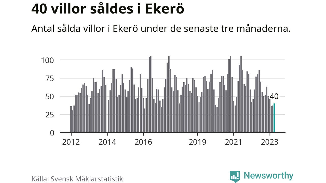 Mellan februari och april såldes 40 villor i Ekerö kommun. Det är relativt få sett till aktiviteten på bostadsmarknaden i kommunen under de senaste tolv månaderna, samt det historiska snittet för den här tiden på året.
