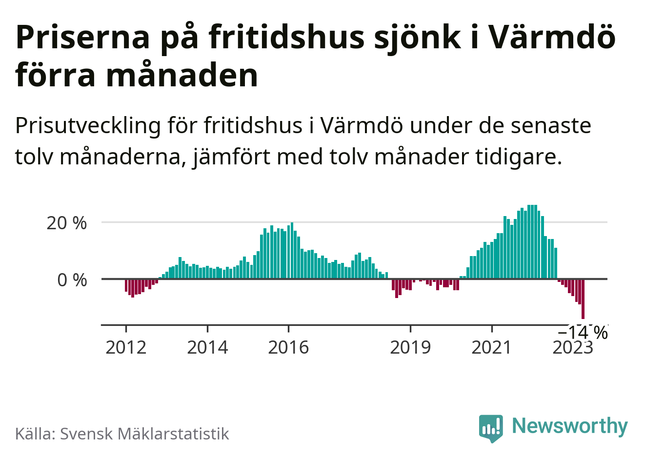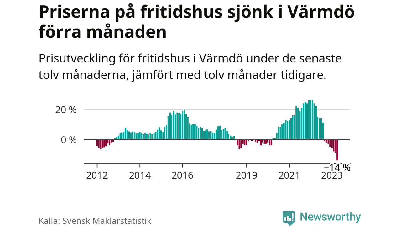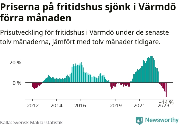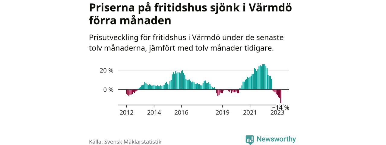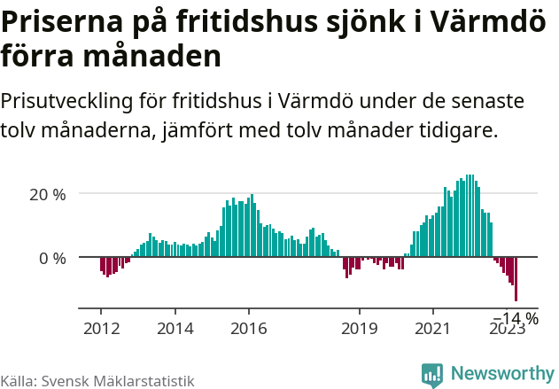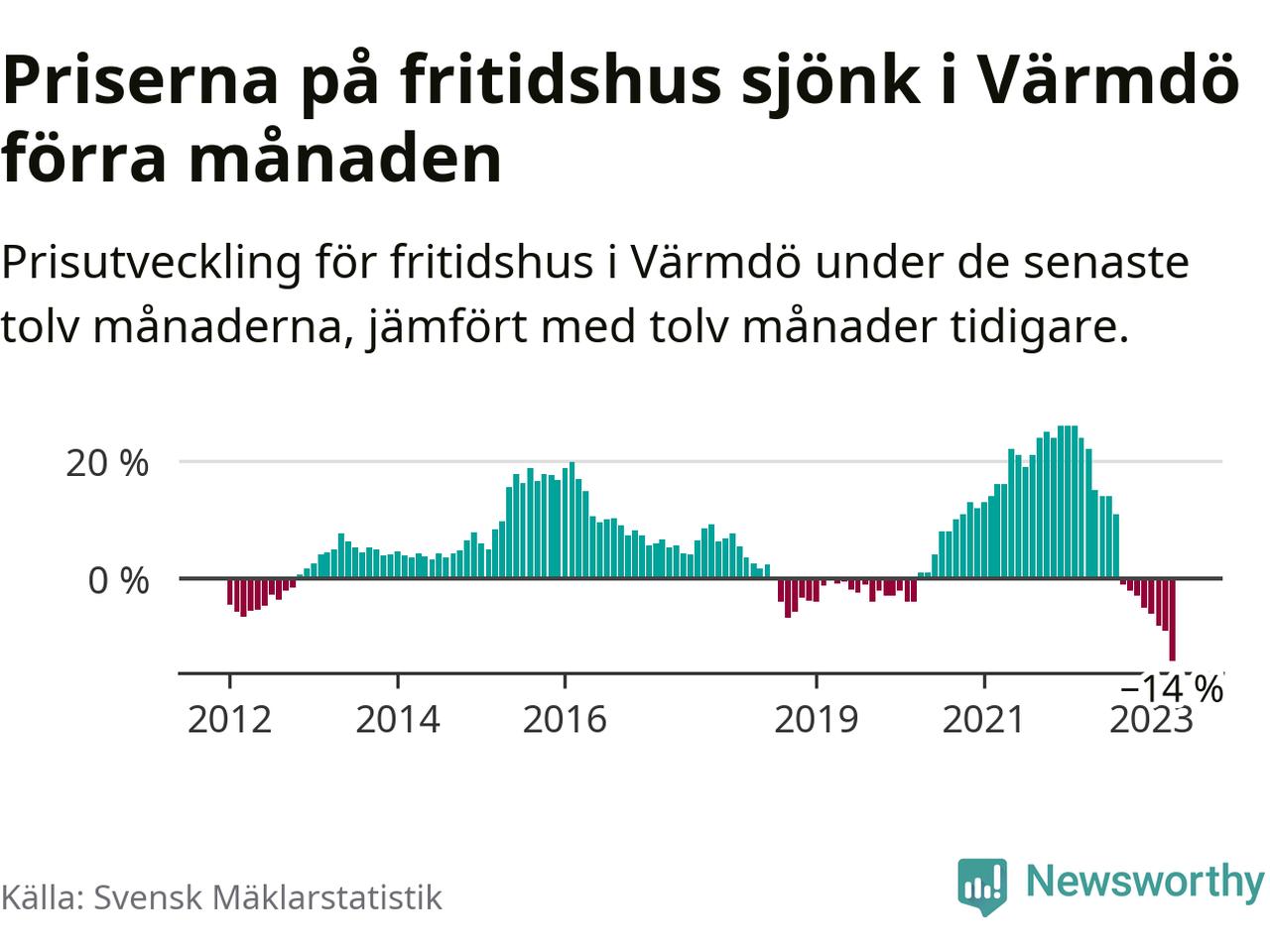 Priserna på fritidshus sjönk med 14 procent i Värmdö kommun under de senaste tolv månaderna. Det är den svagaste prisutvecklingen sedan 2012.
