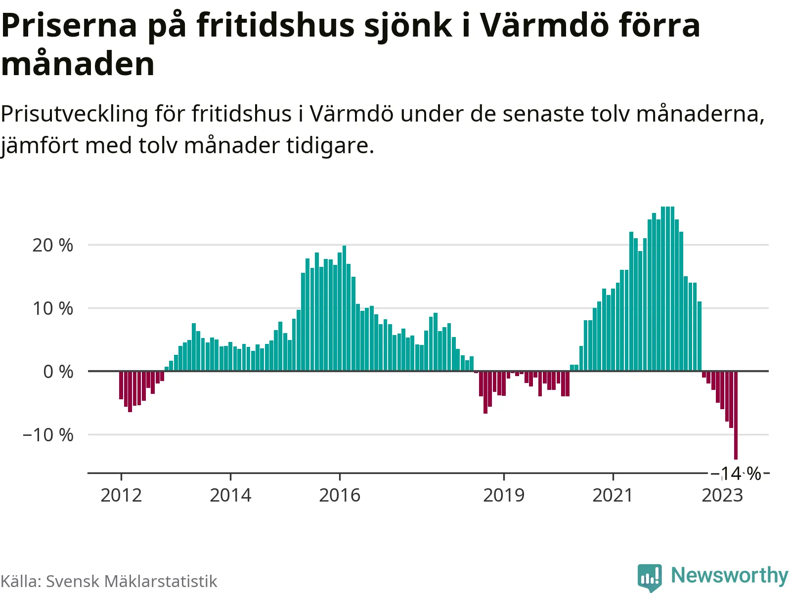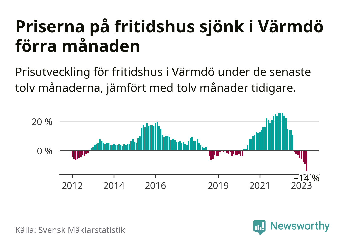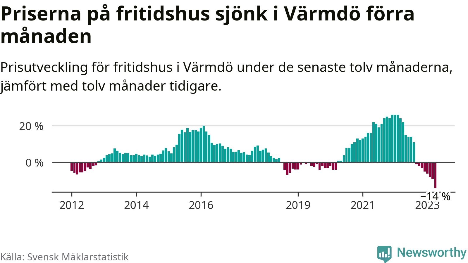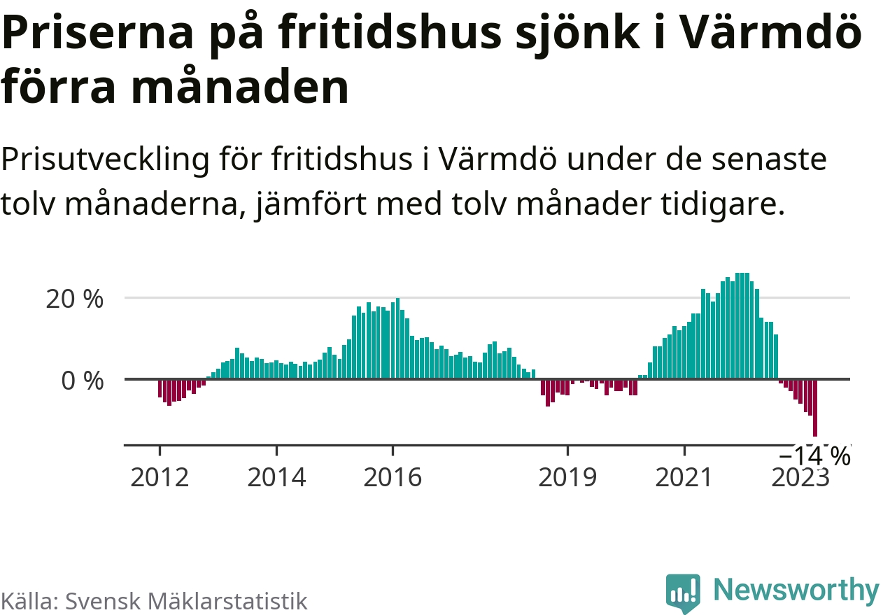Priserna på fritidshus sjönk med 14 procent i Värmdö kommun under de senaste tolv månaderna. Det är den svagaste prisutvecklingen sedan 2012.