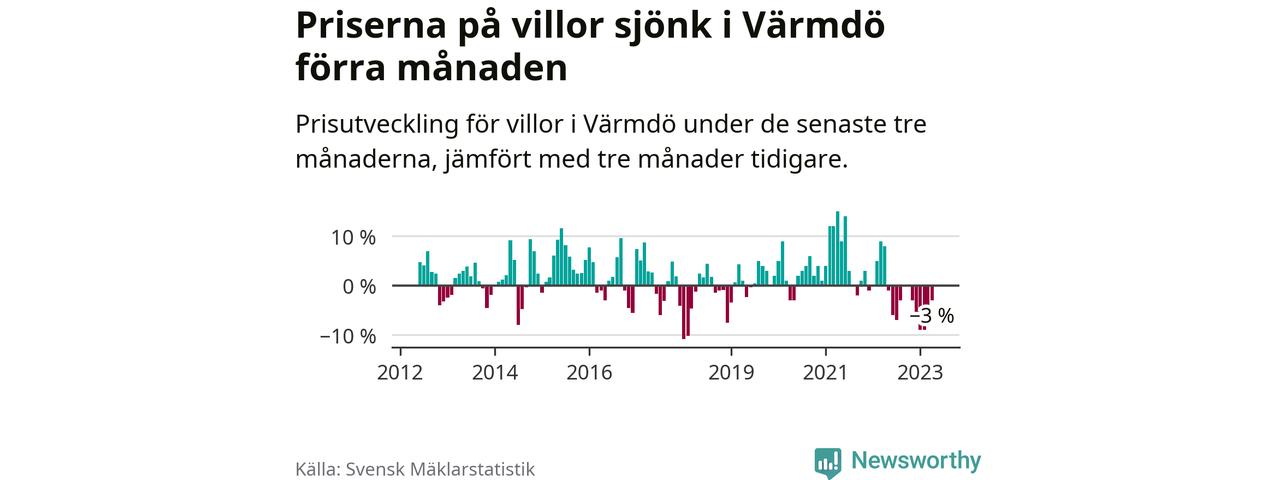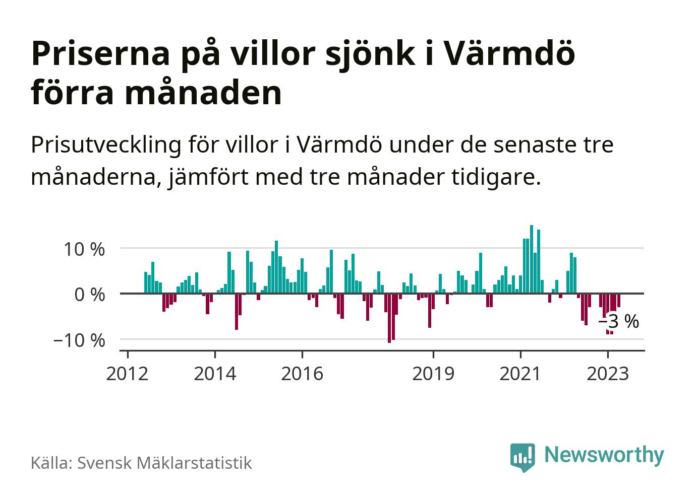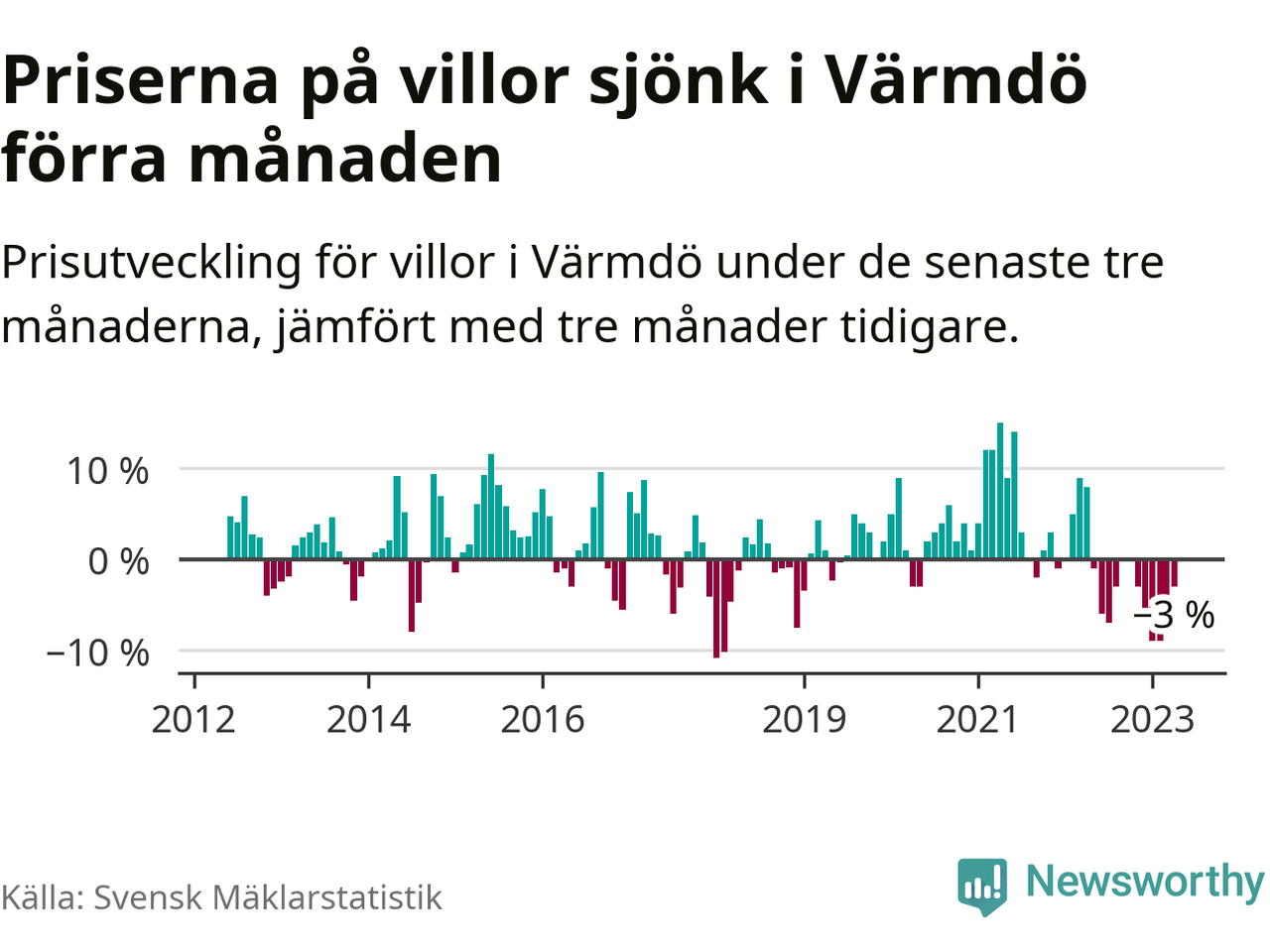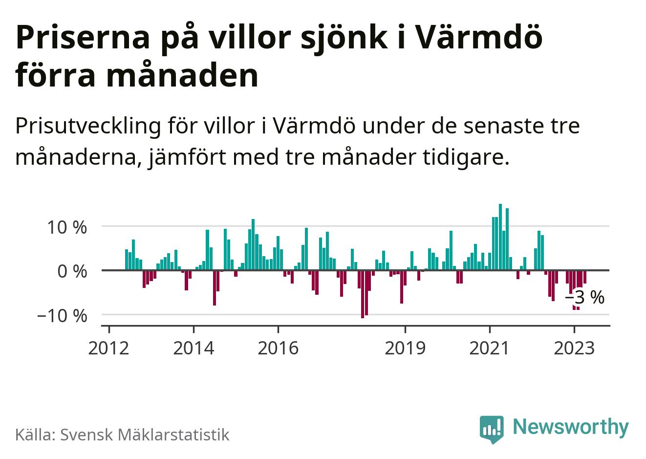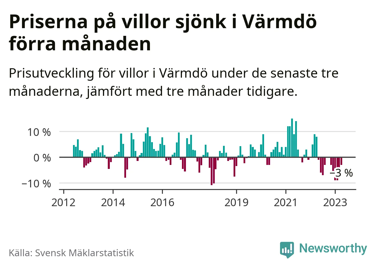 Villapriserna har gått ner i Värmdö kommun. Medelpriset på försäljningarna under de senaste tre månaderna visar på en nedgång med 3 procent.