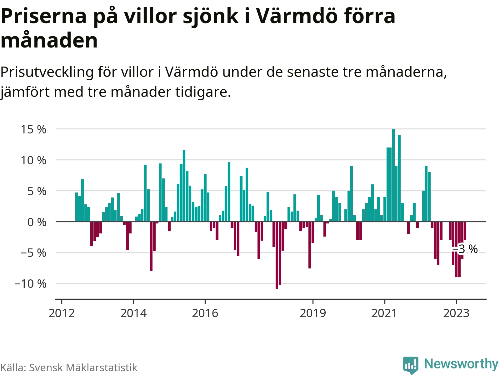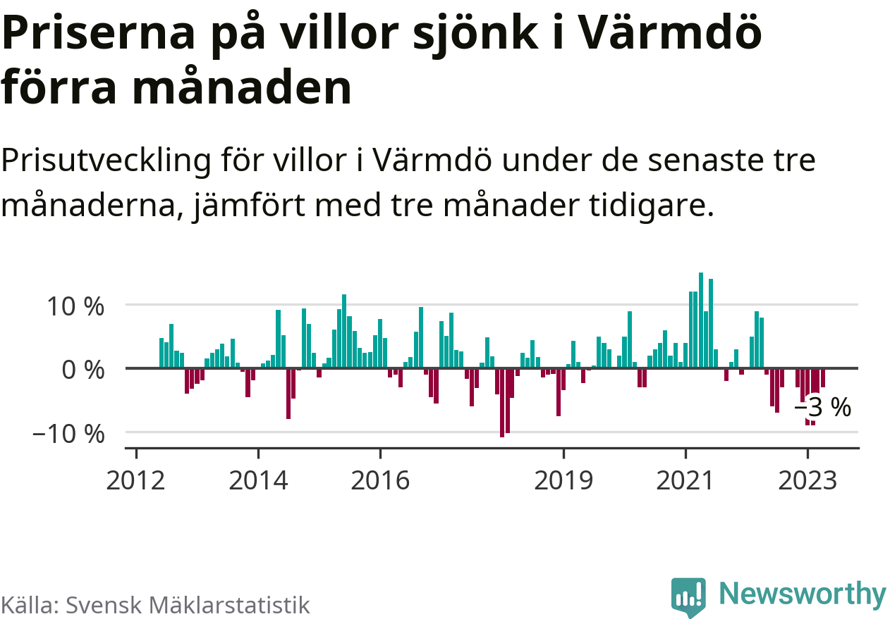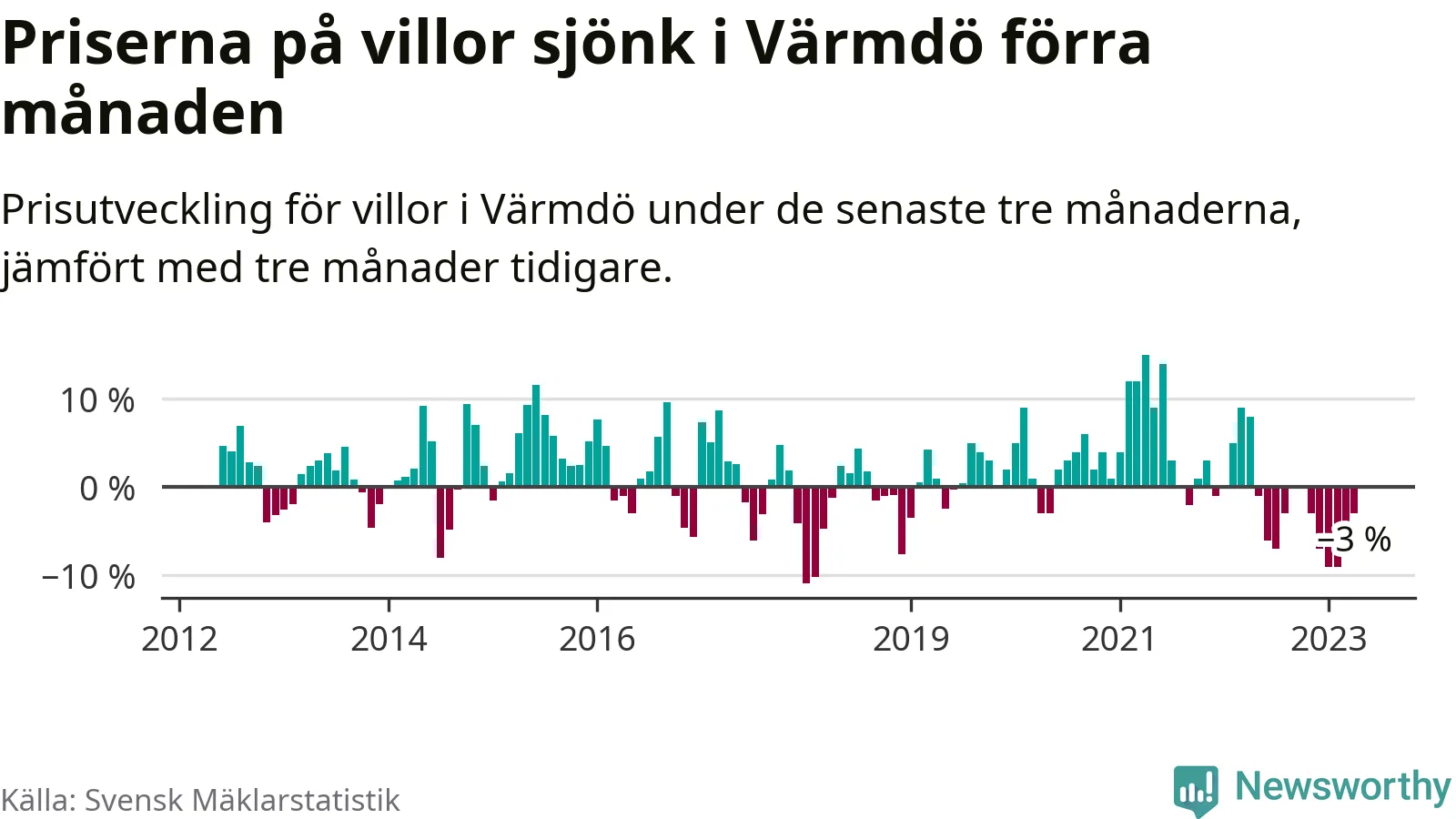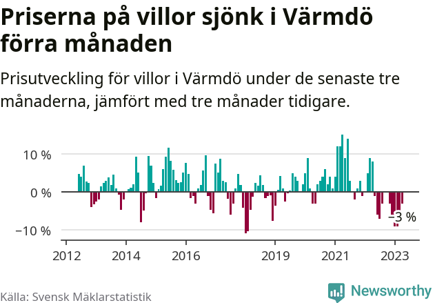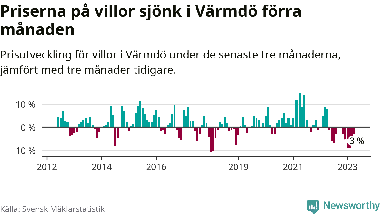 Villapriserna har gått ner i Värmdö kommun. Medelpriset på försäljningarna under de senaste tre månaderna visar på en nedgång med 3 procent.