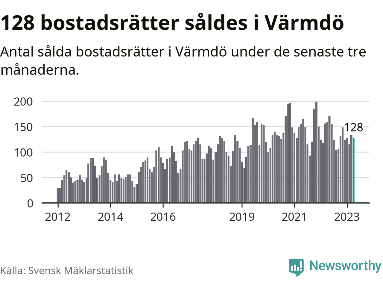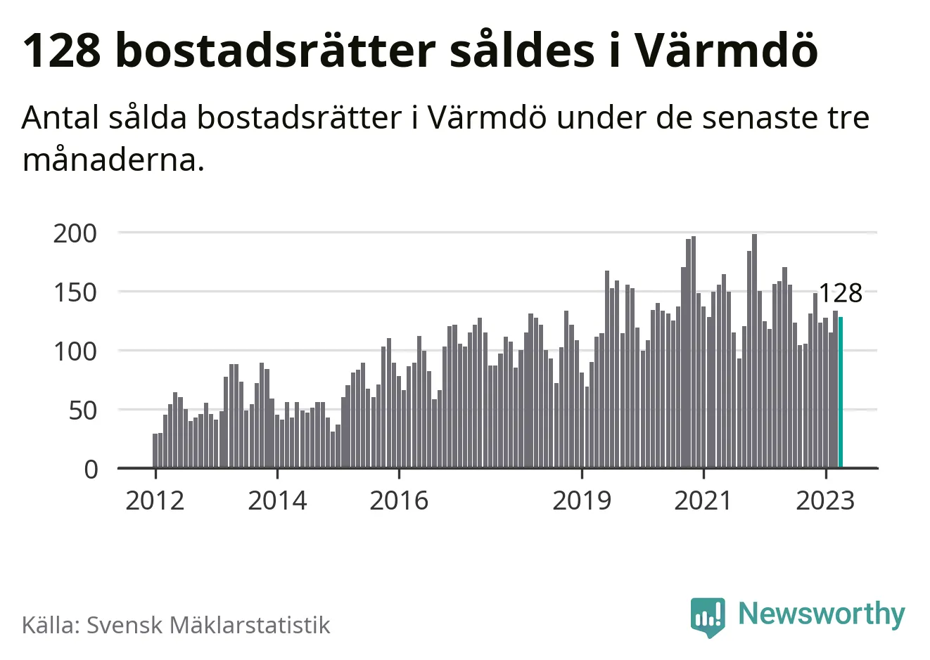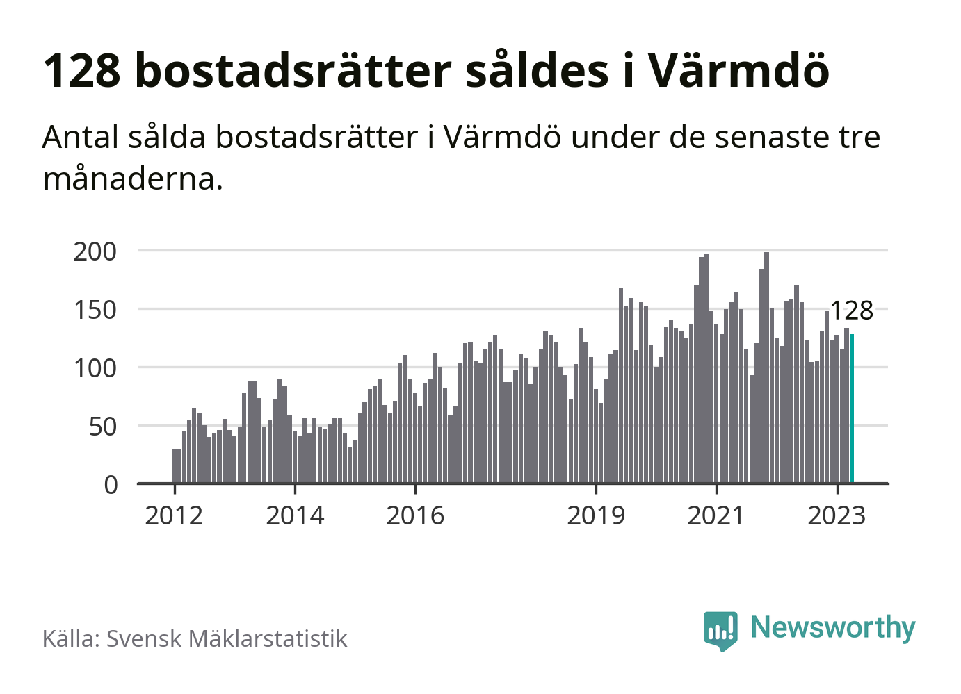 Sammanlagt såldes 128 bostadsrätter i Värmdö kommun mellan februari och april till ett genomsnittligt pris på 3,4 miljoner kronor. I fjol gjordes 158 affärer vid den här tiden på året.