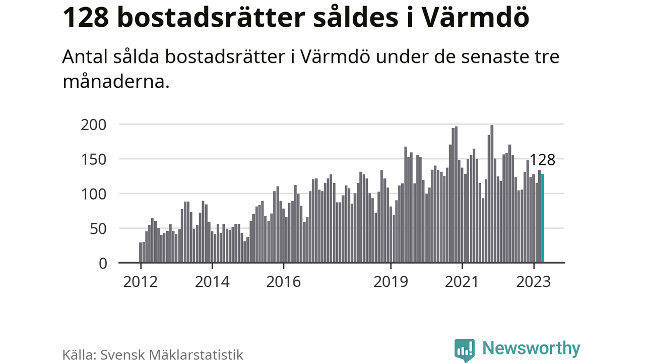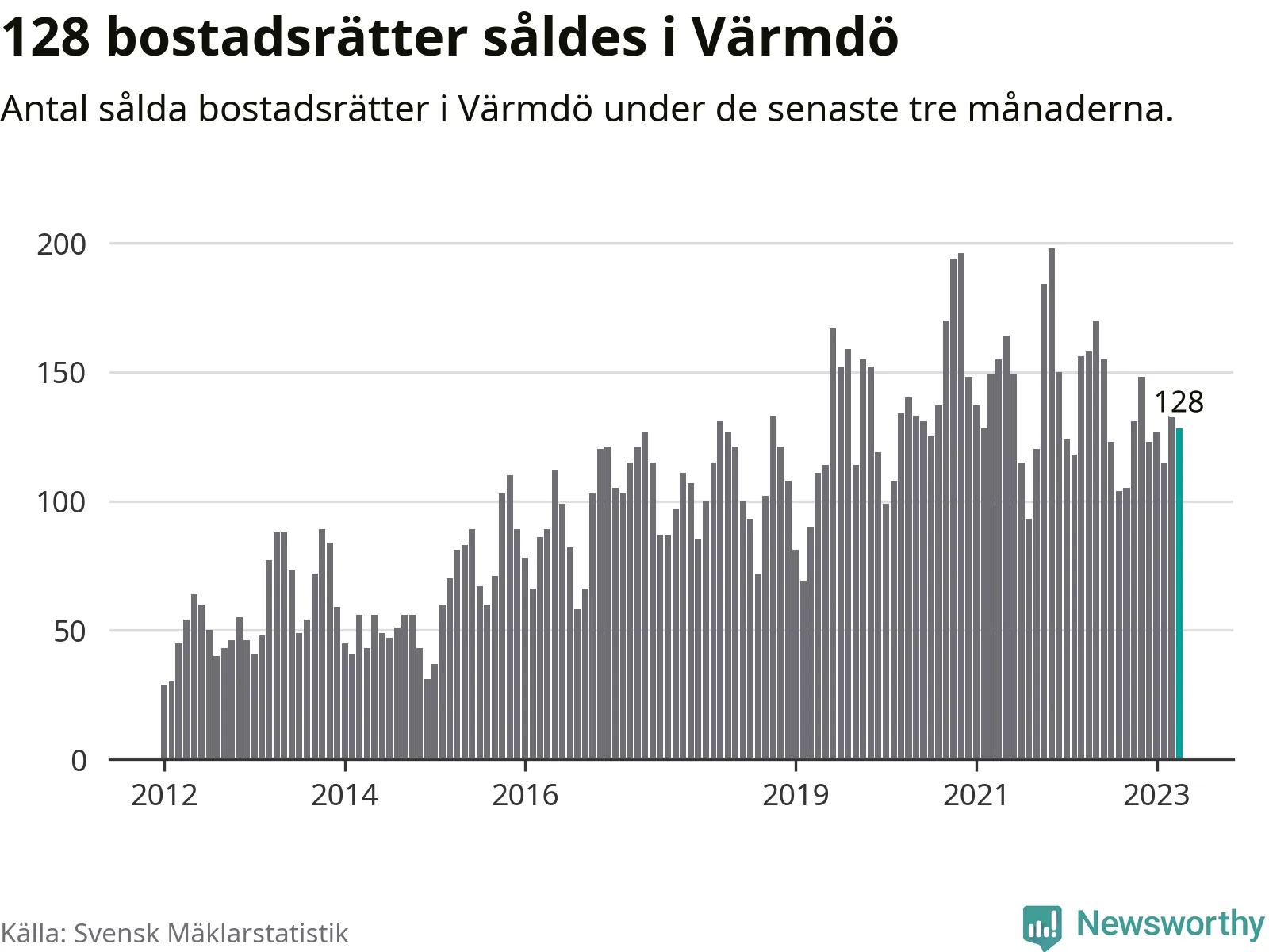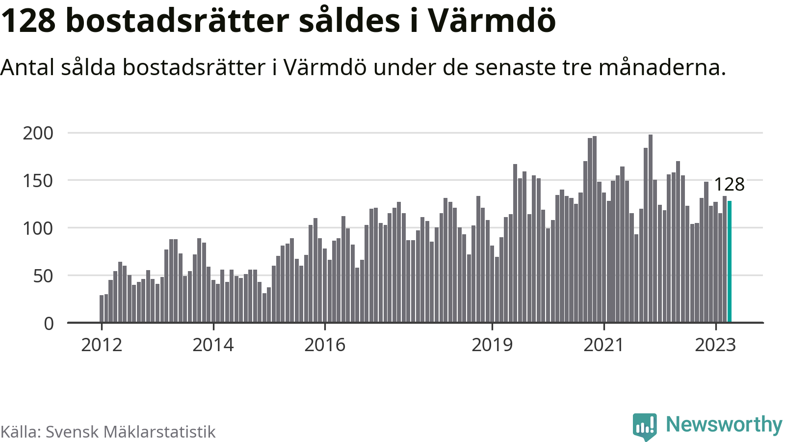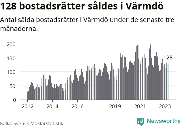 Sammanlagt såldes 128 bostadsrätter i Värmdö kommun mellan februari och april till ett genomsnittligt pris på 3,4 miljoner kronor. I fjol gjordes 158 affärer vid den här tiden på året.