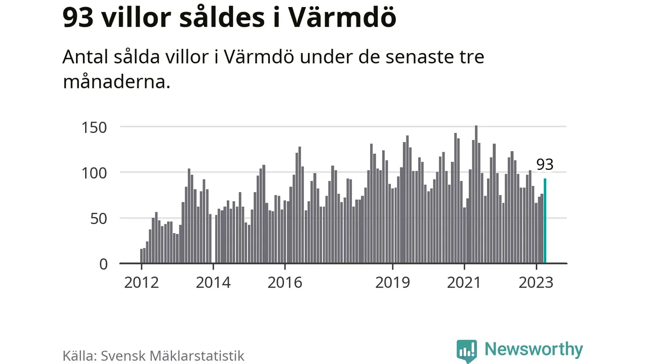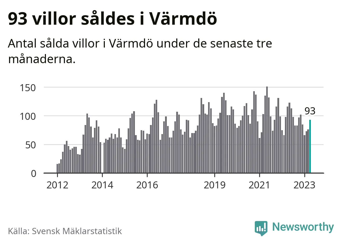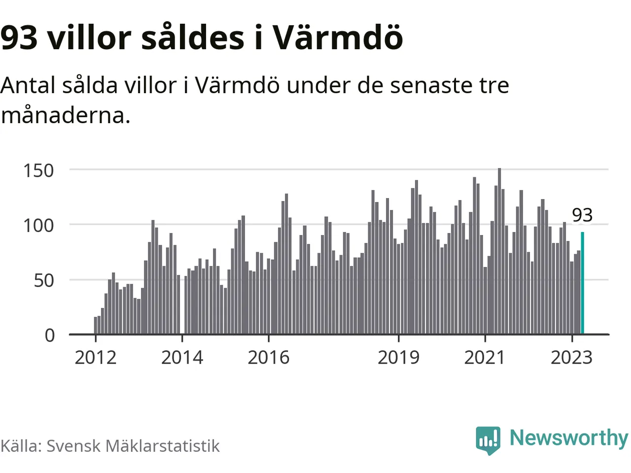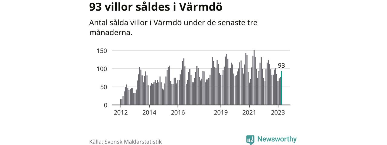 Sammanlagt såldes 93 villor i Värmdö kommun mellan februari och april till ett genomsnittligt pris på 6,0 miljoner kronor. I fjol gjordes 116 affärer vid den här tiden på året.